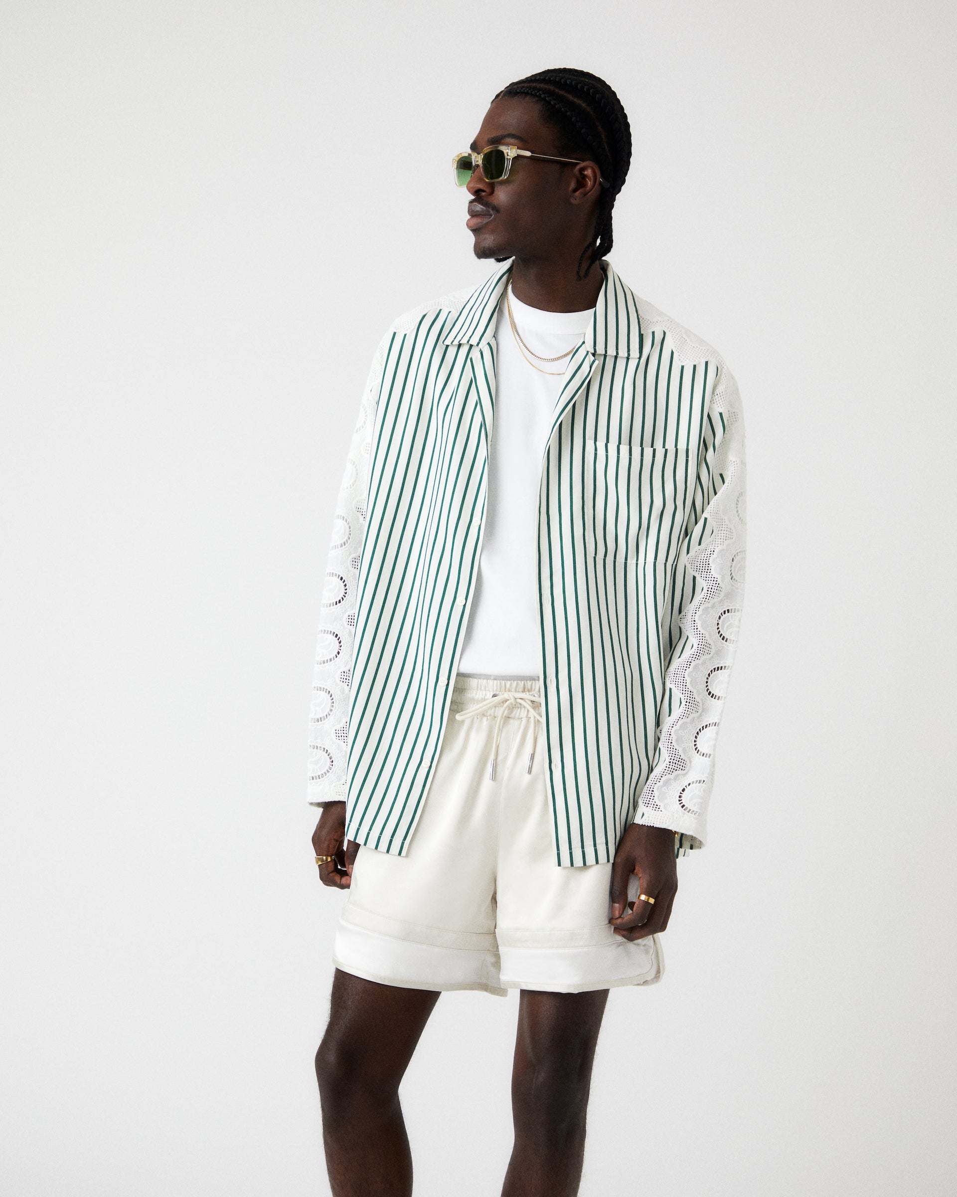 Shirting is reimagined with the Lace Combo Adonis Camp Collar Shirt. The style takes a hybrid approach by blending decorative lace with sandwashed linen. The Landon Souvenir Shirt, an understated style, is constructed with vintage-washed satin and features distinct pearl snap closures.