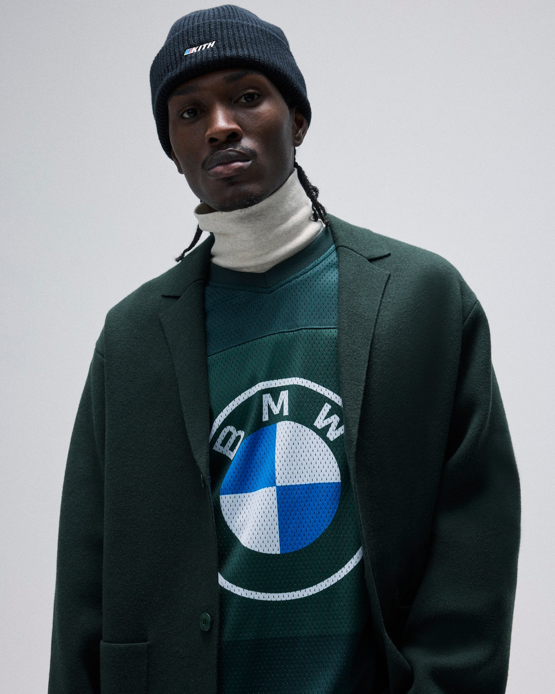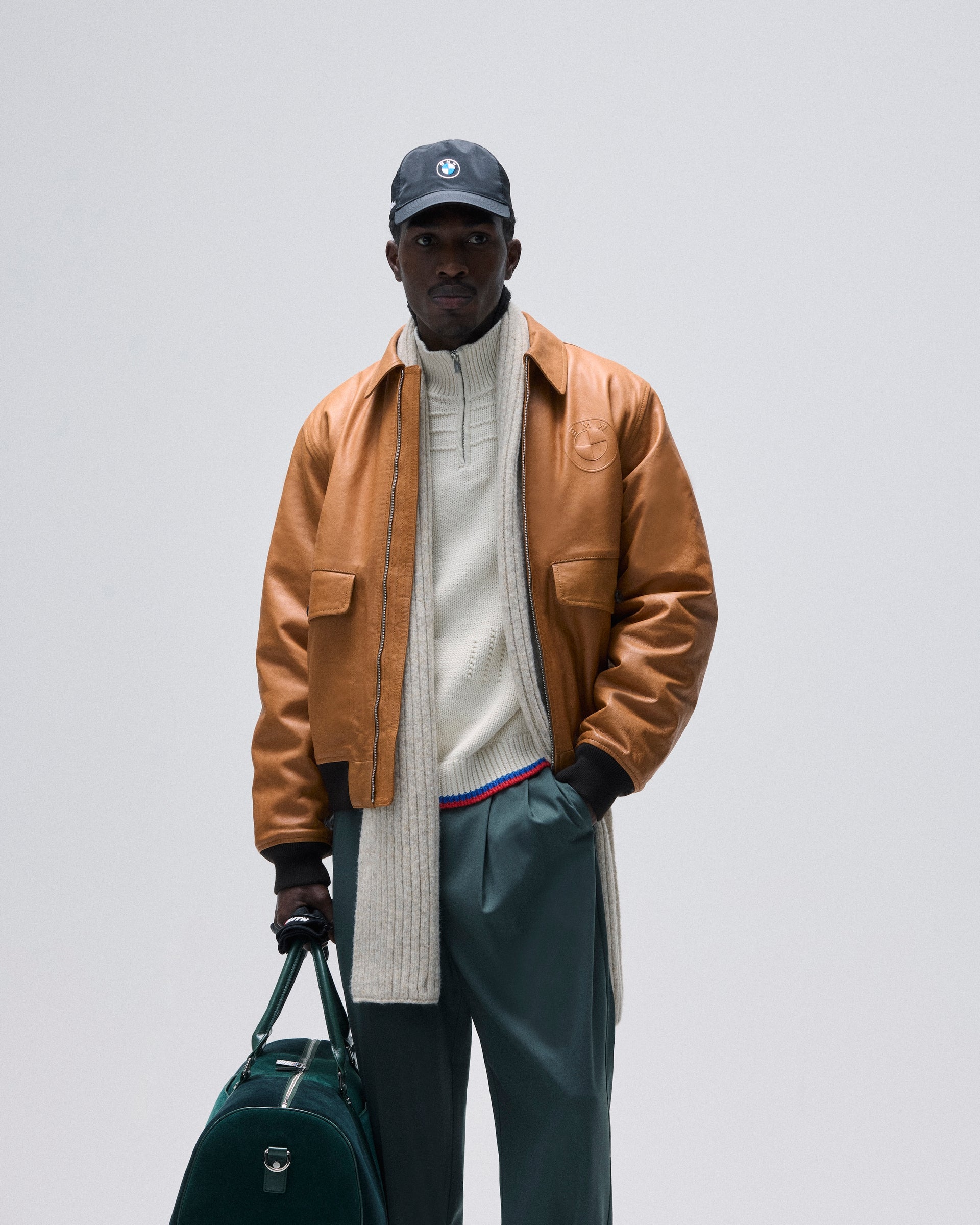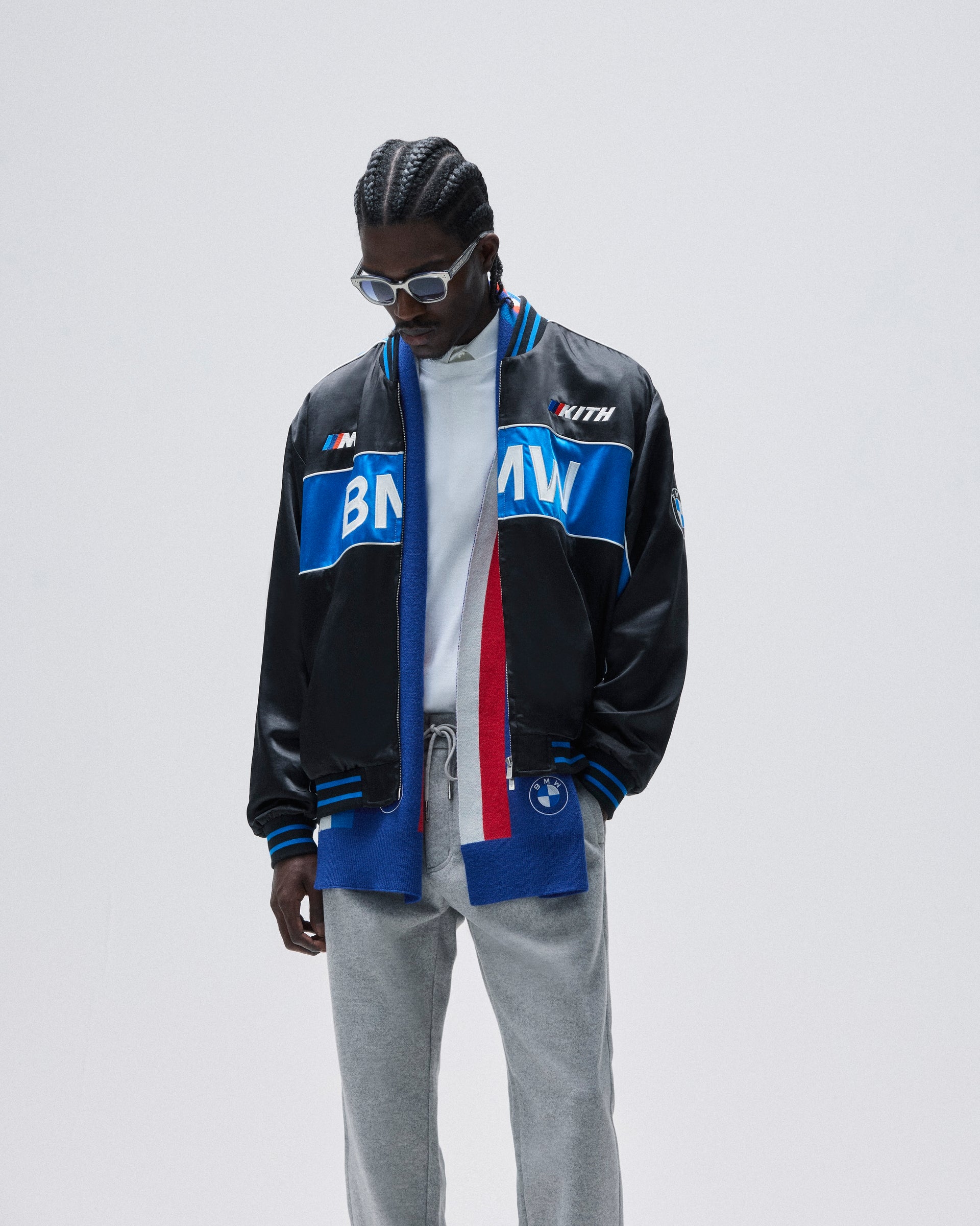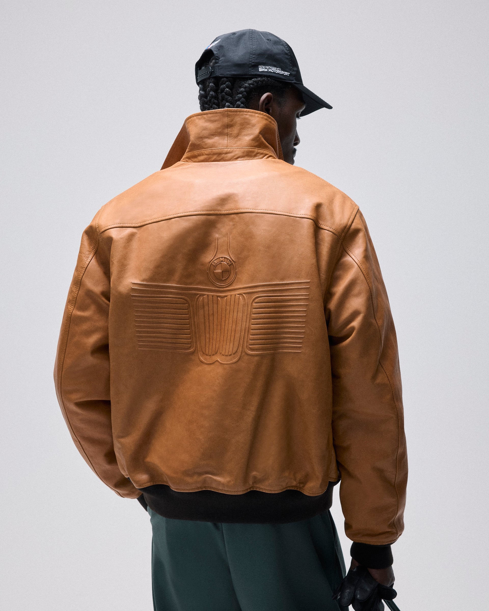 Signature outerwear silhouettes are updated with a variety of Kith for BMW collaborative logos and executed in premium fabrics like Italian lambskin leather, silky suede, and bonded microsuede. Standouts include the iridescent Kieran Coaches Jacket & Leather Hawthorne Flight Jacket.