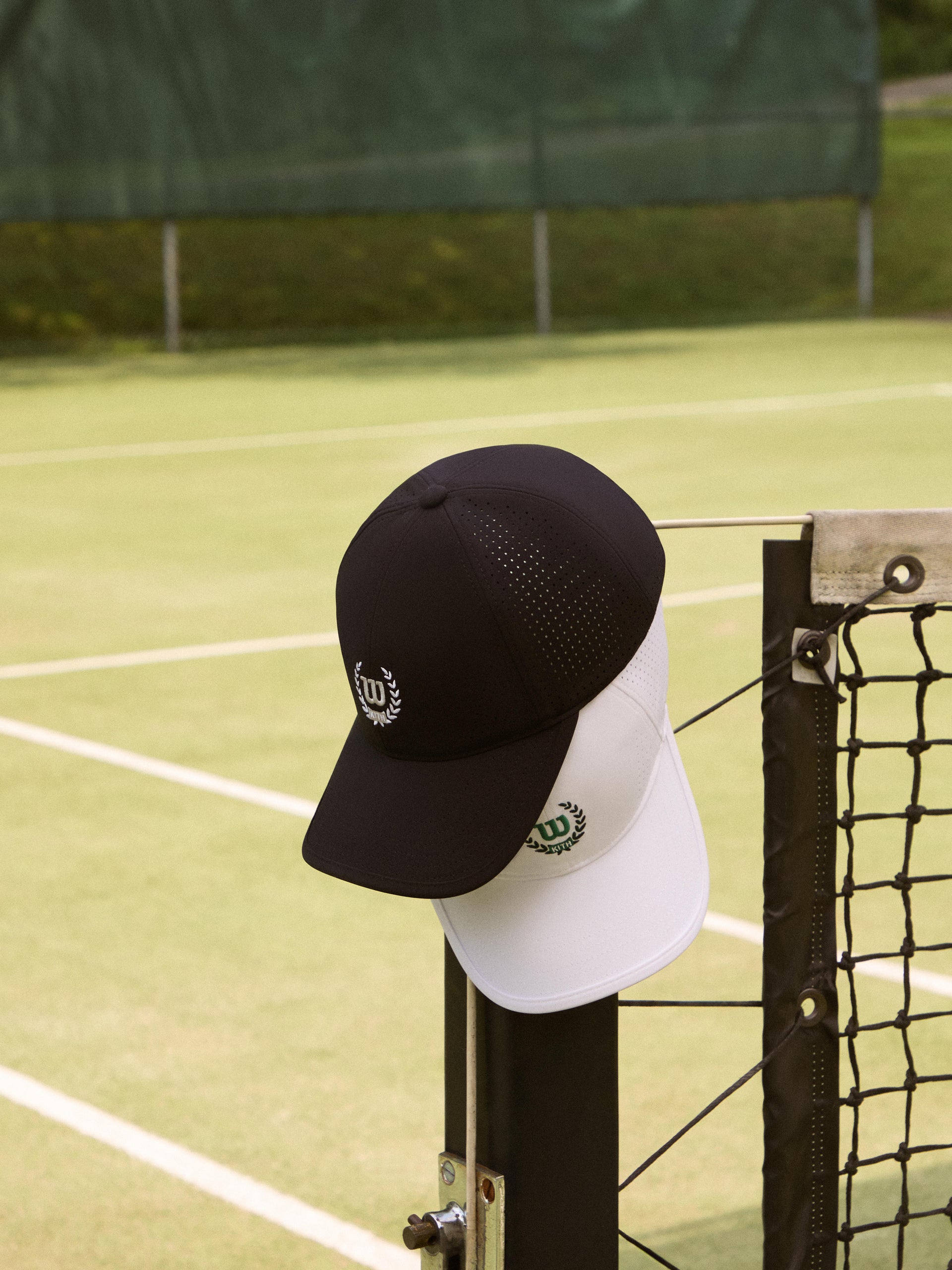 Lightweight, moisture-wicking headwear—seen in white, black, green and blue hues—is updated with new tennis Kith for Wilson branding.
