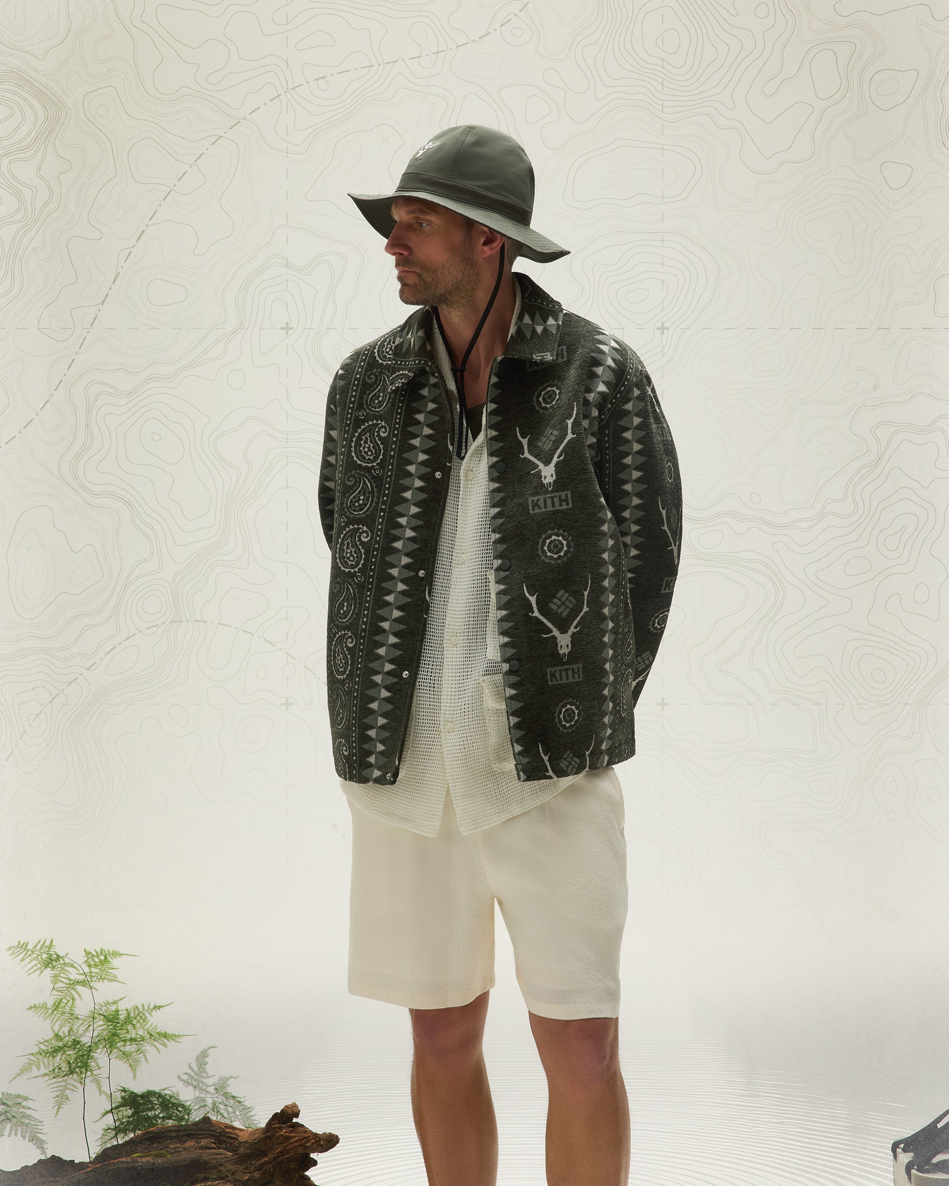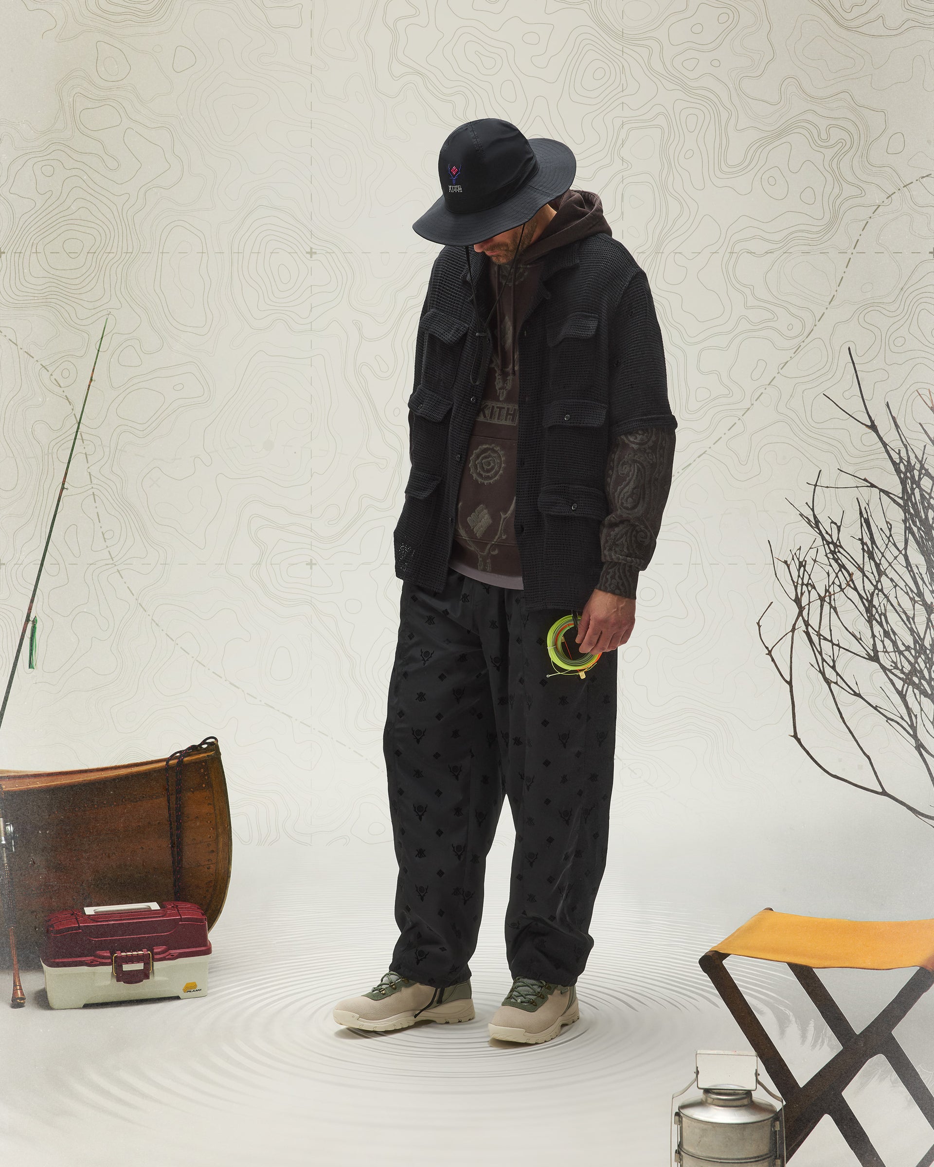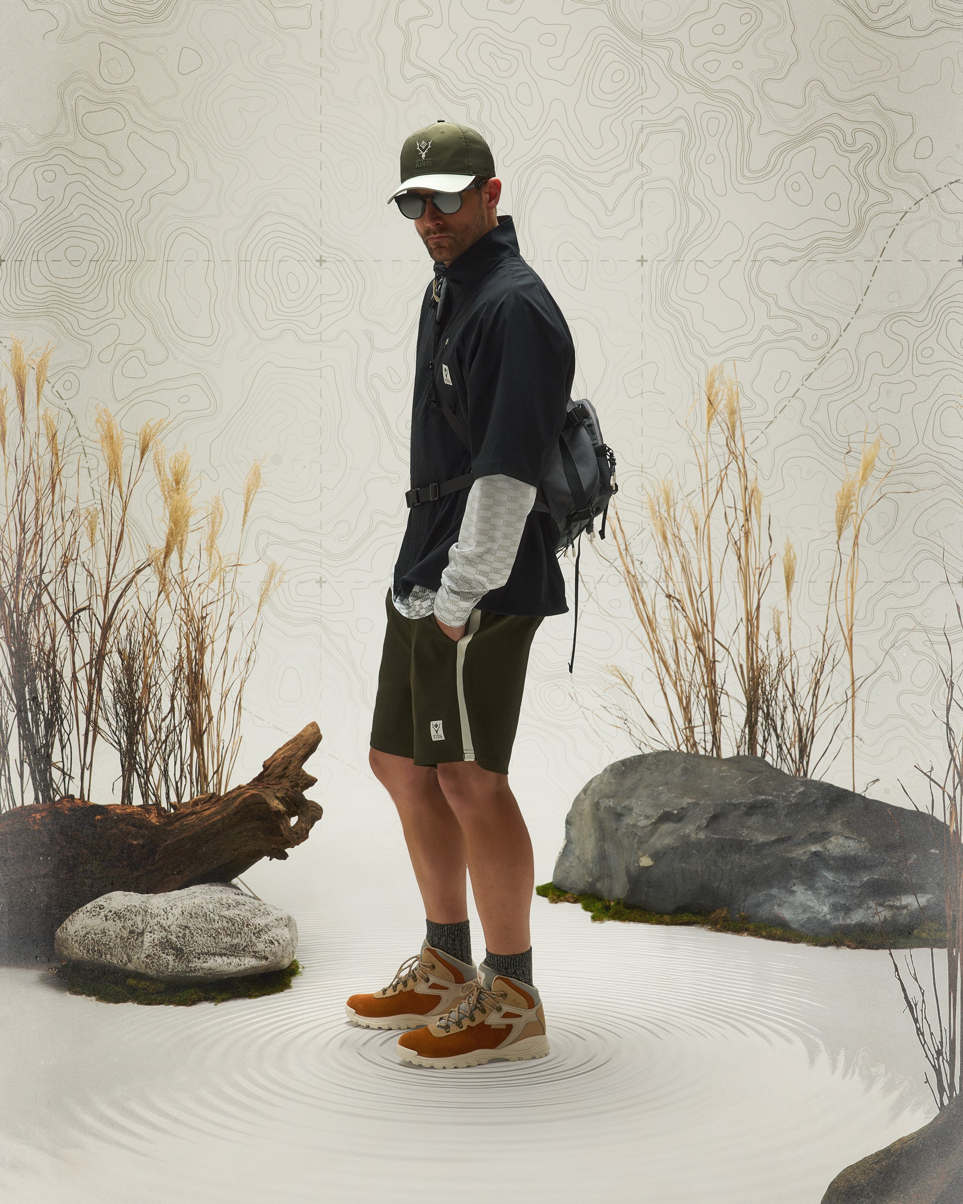 Kith & South2 West8 for Columbia headwear highlights a variety of tri-branded styles—featuring the Nylon Pinch Crown, Aaron Cap, Crusher Hat and Dawson Bucket Hat, all made from lightweight materials.
