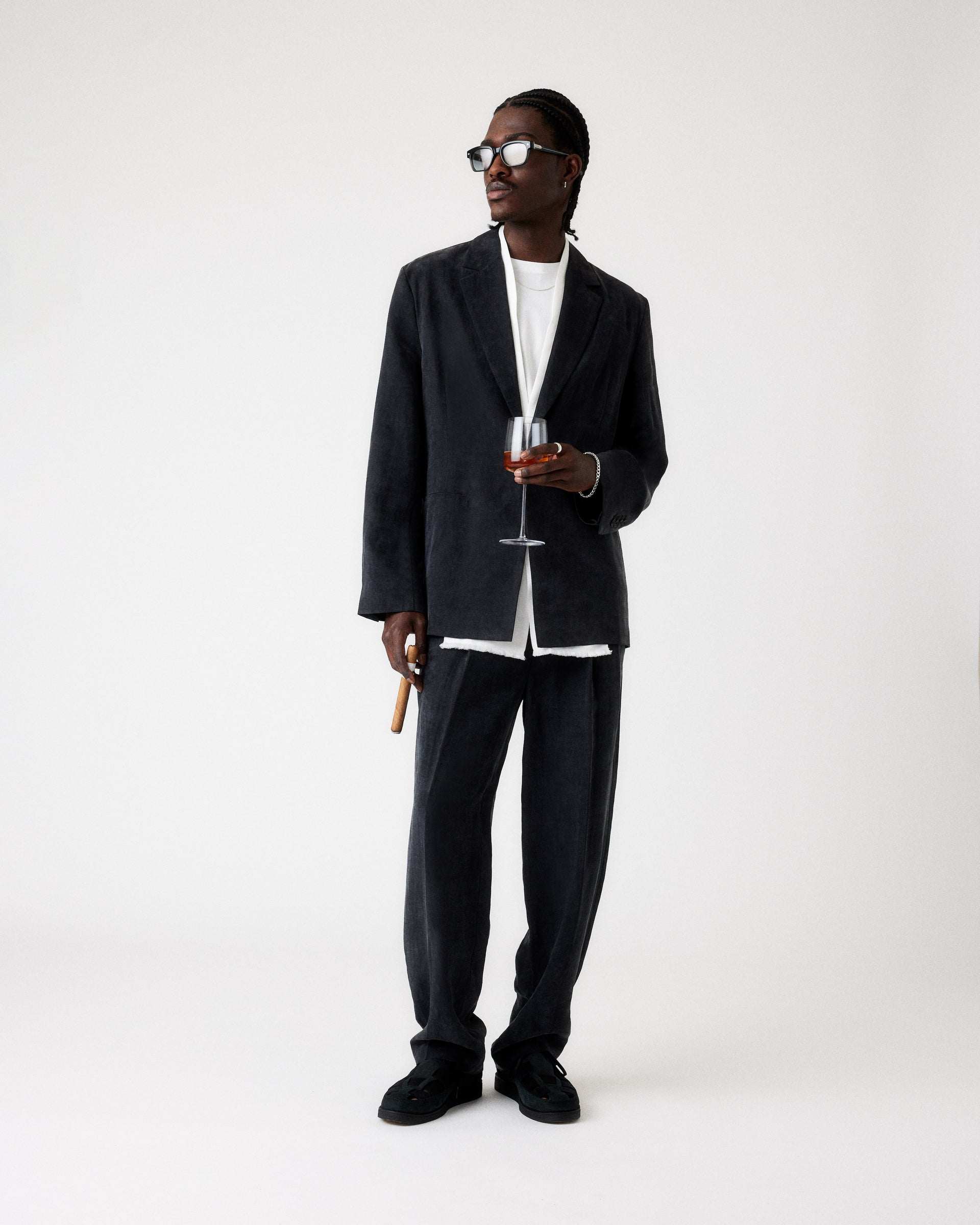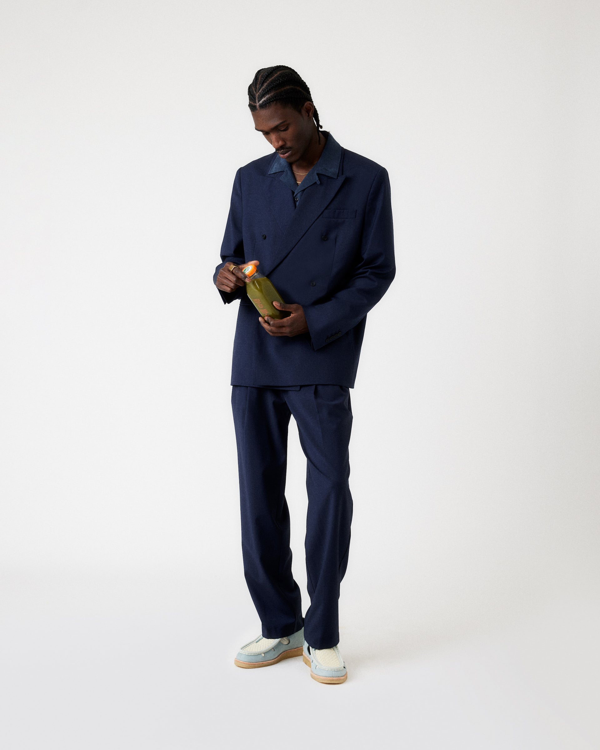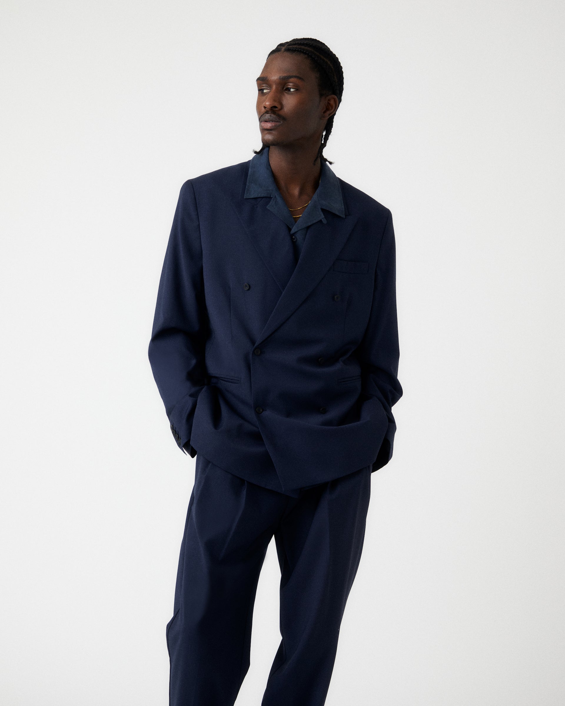 The Talan Suit, a new style, is crafted from cupro linen and features a detachable silk scarf, double pleats, and intentional crease lines. Individual pieces like the double-breasted Julius Blazer and Kylan Trouser are made of premium Turkish wool.