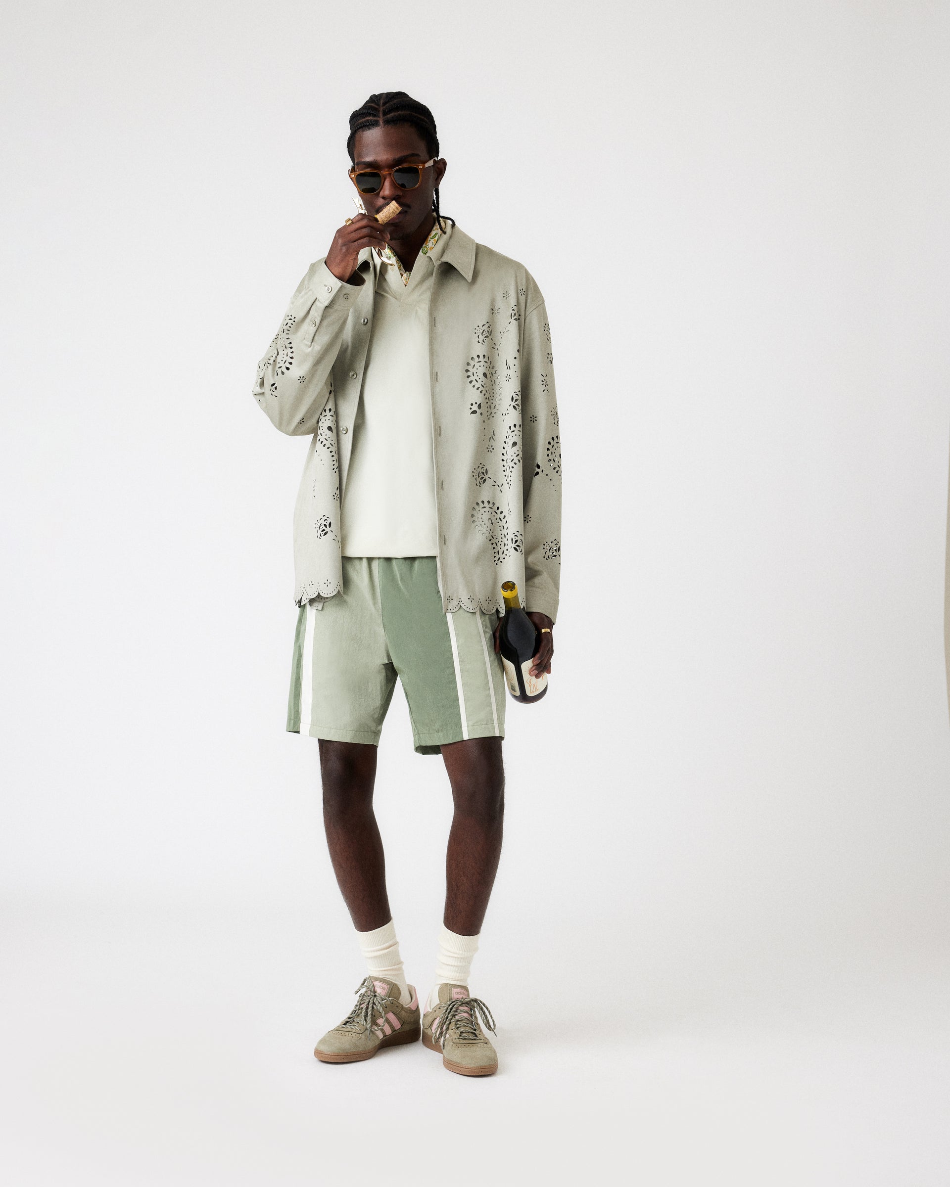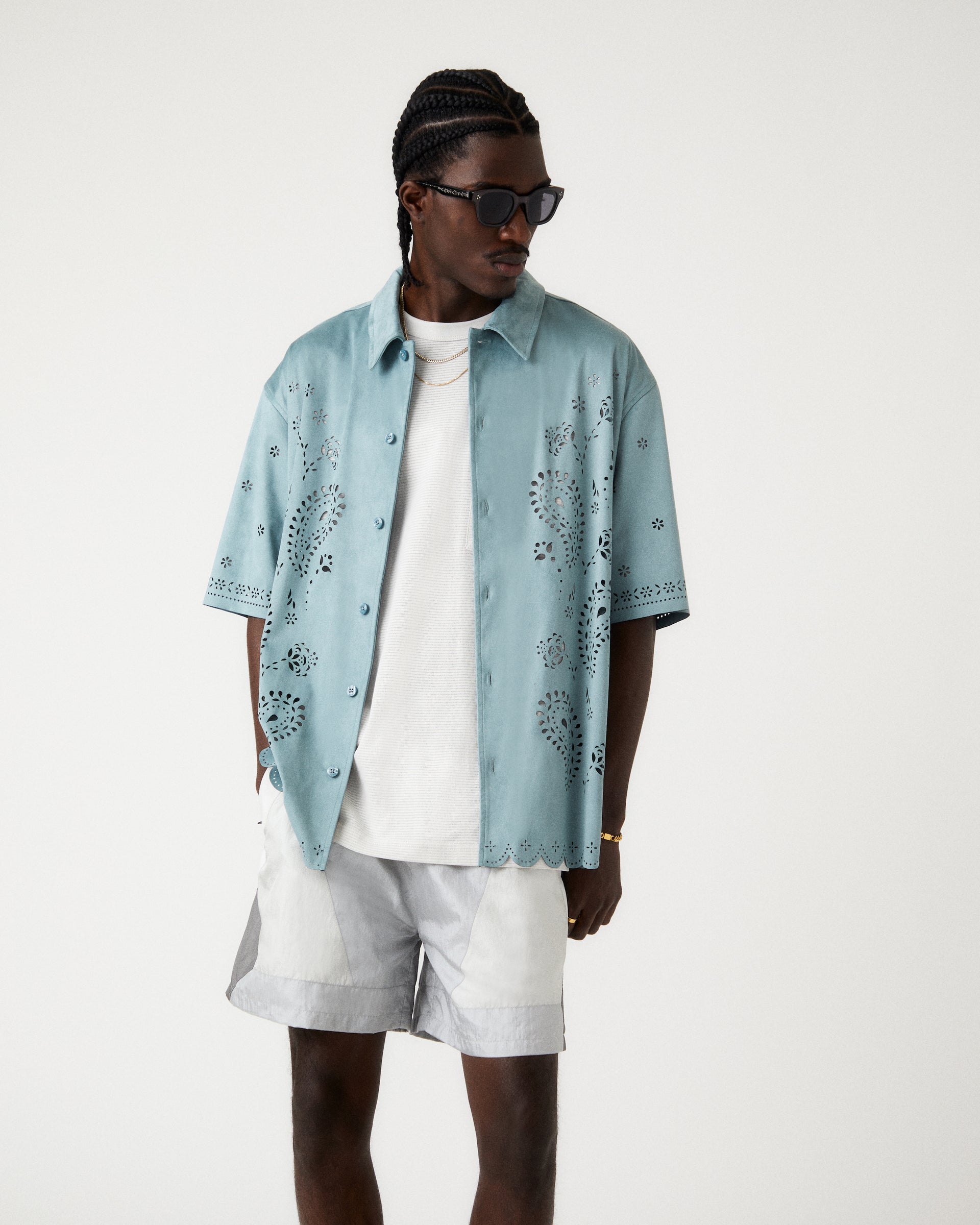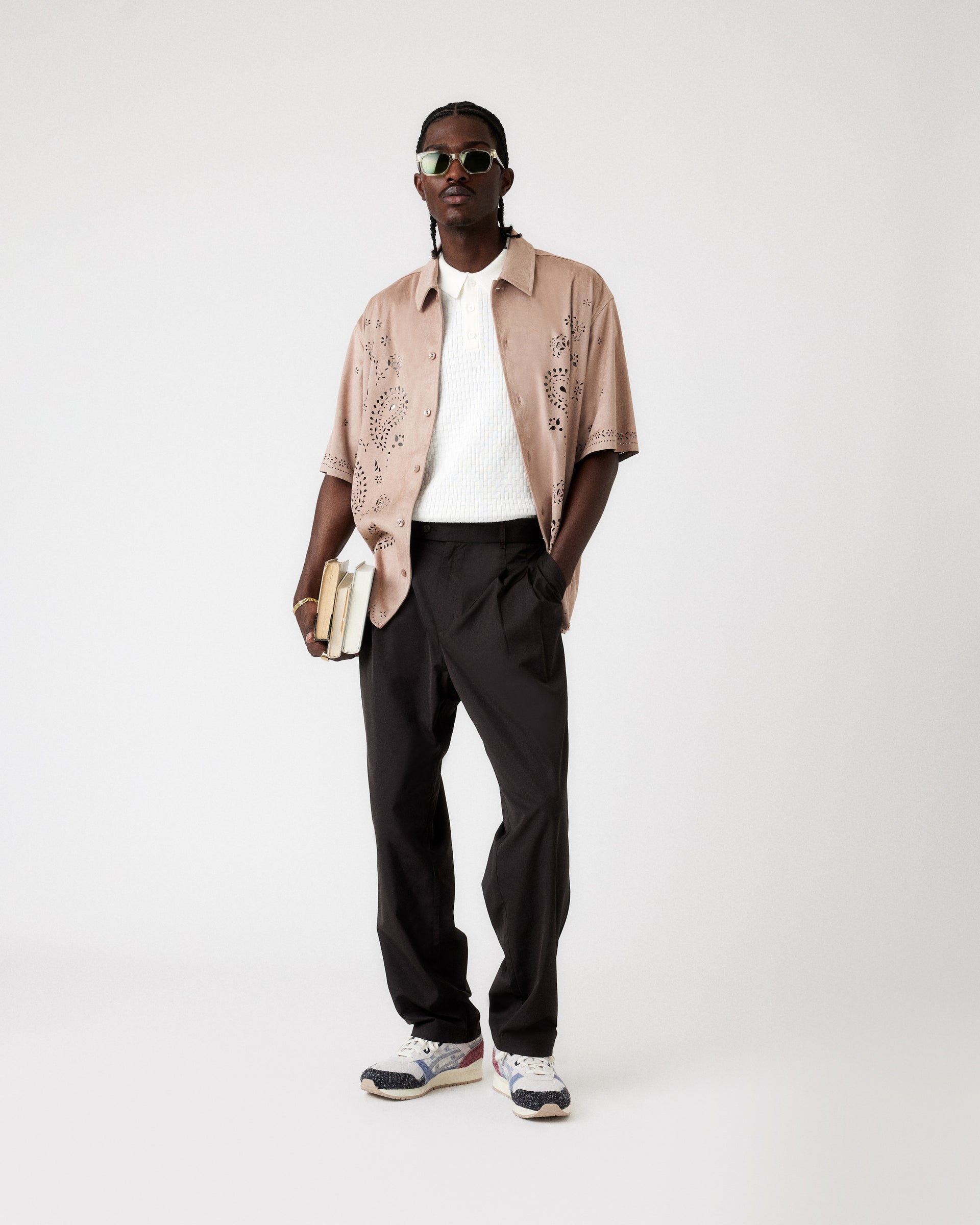 Short & long-sleeve shirting in a variety of prints and patterns, executed in our latest seasonal palette. The Isaac Microsuede Buttondown makes its debut—a breathable design featuring custom laser cut artwork, Kith-branded button closures, and a raw scalloped hem.