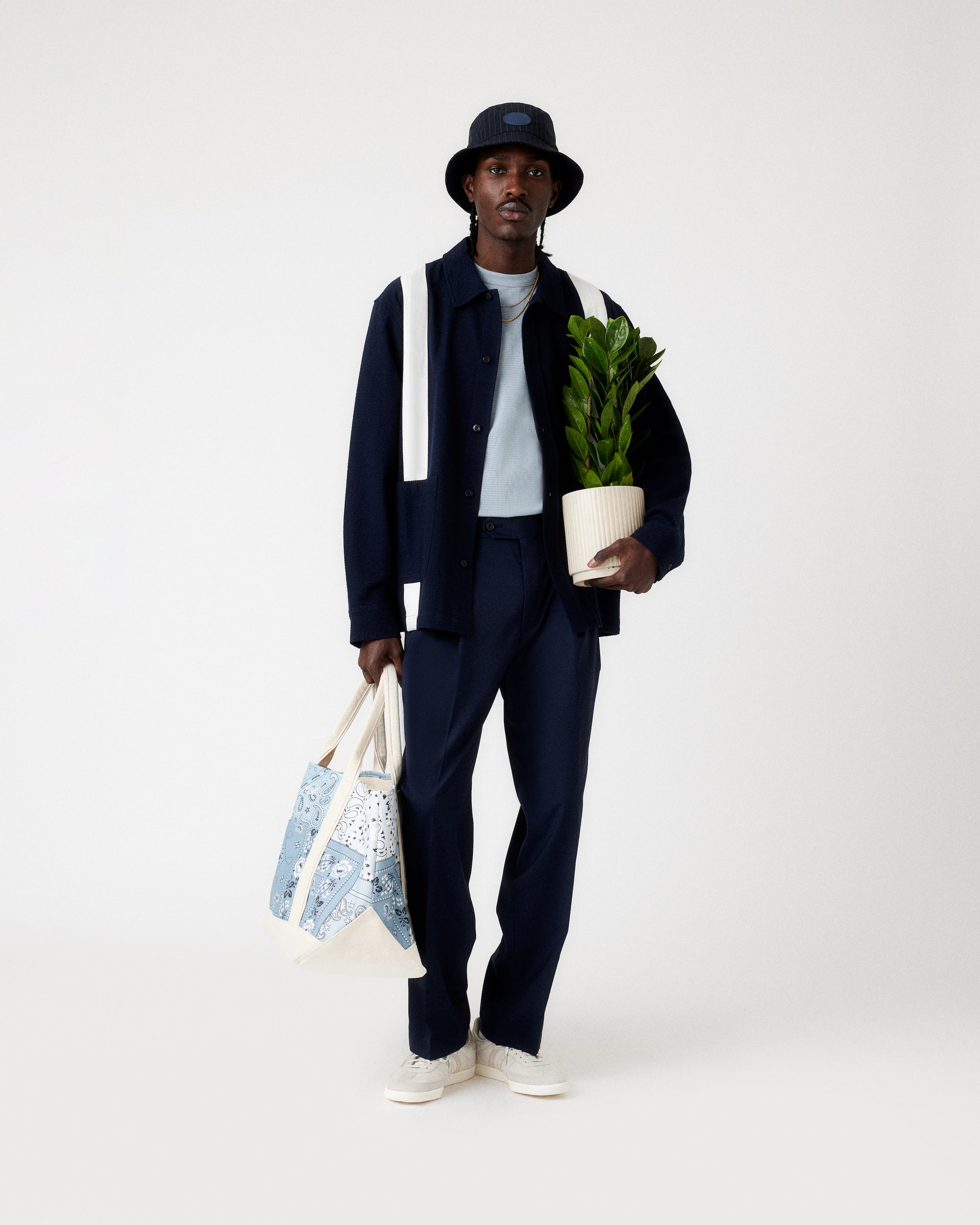 An array of paisley print and monogram silk scarves showcase the Kith Summer 2024 custom designs and palette. The Document Bag and Emmet Crossbody, statement bags designed to elevate your outfit, are crafted from our premium raffia material and are adorned with custom Kith leather branding.