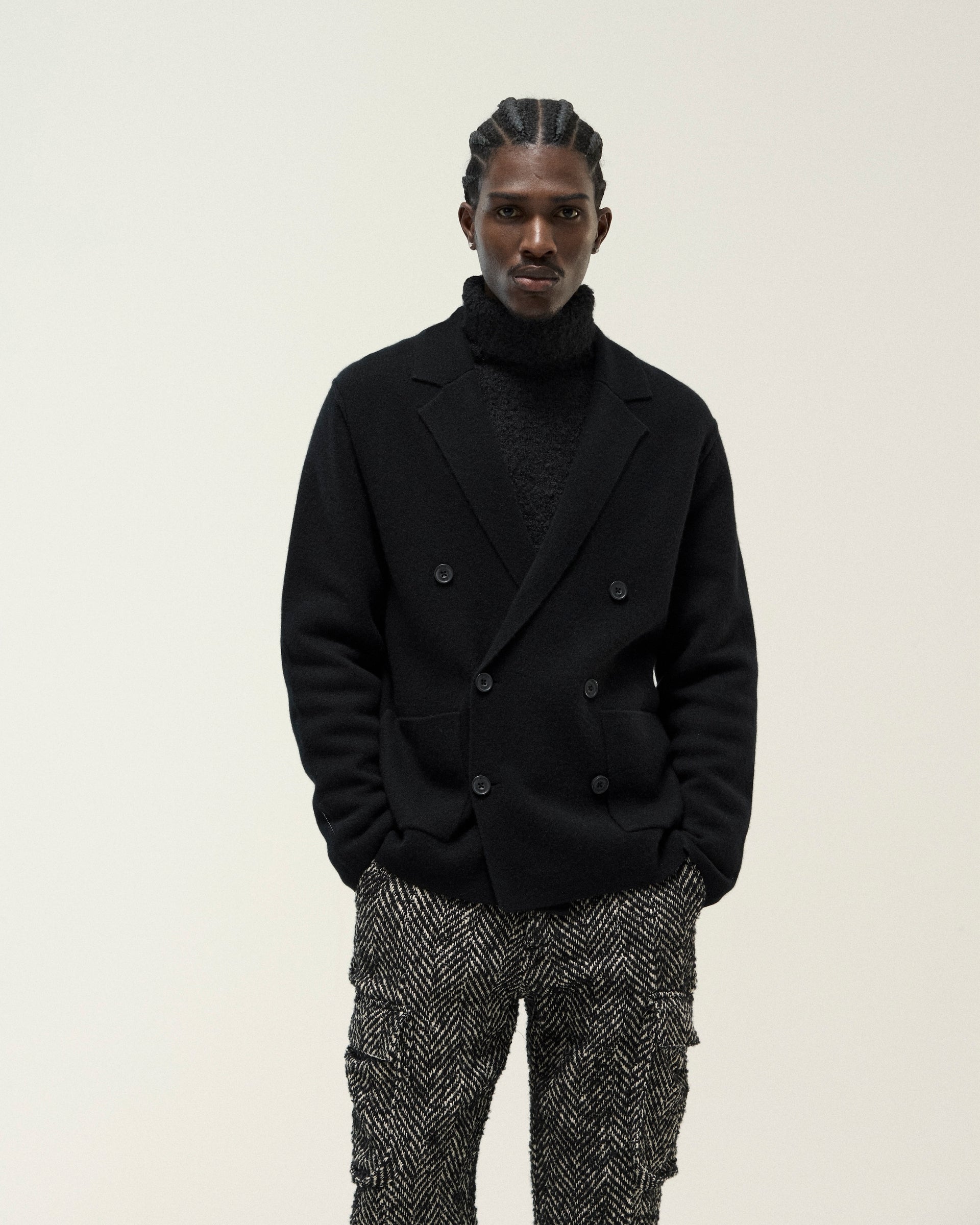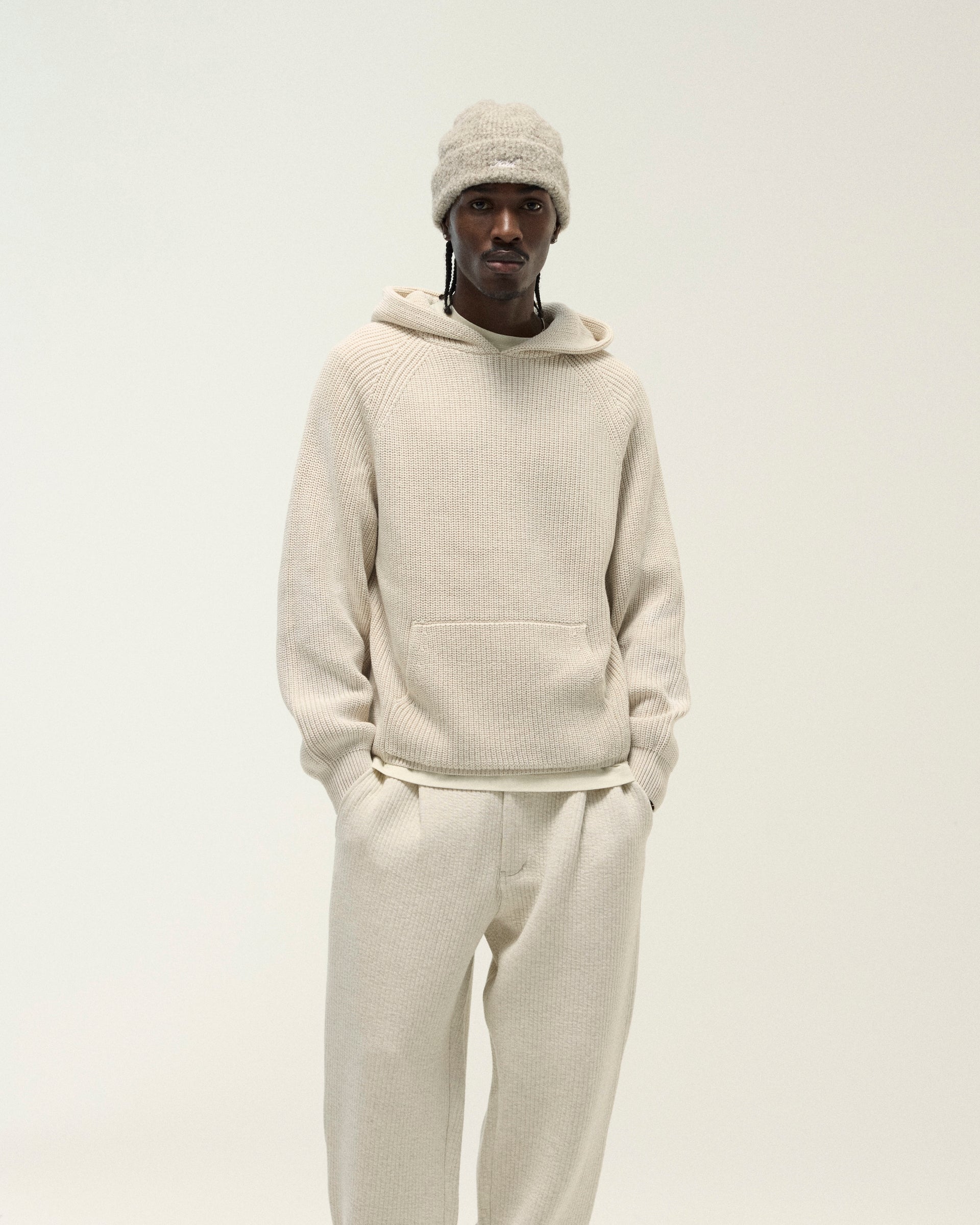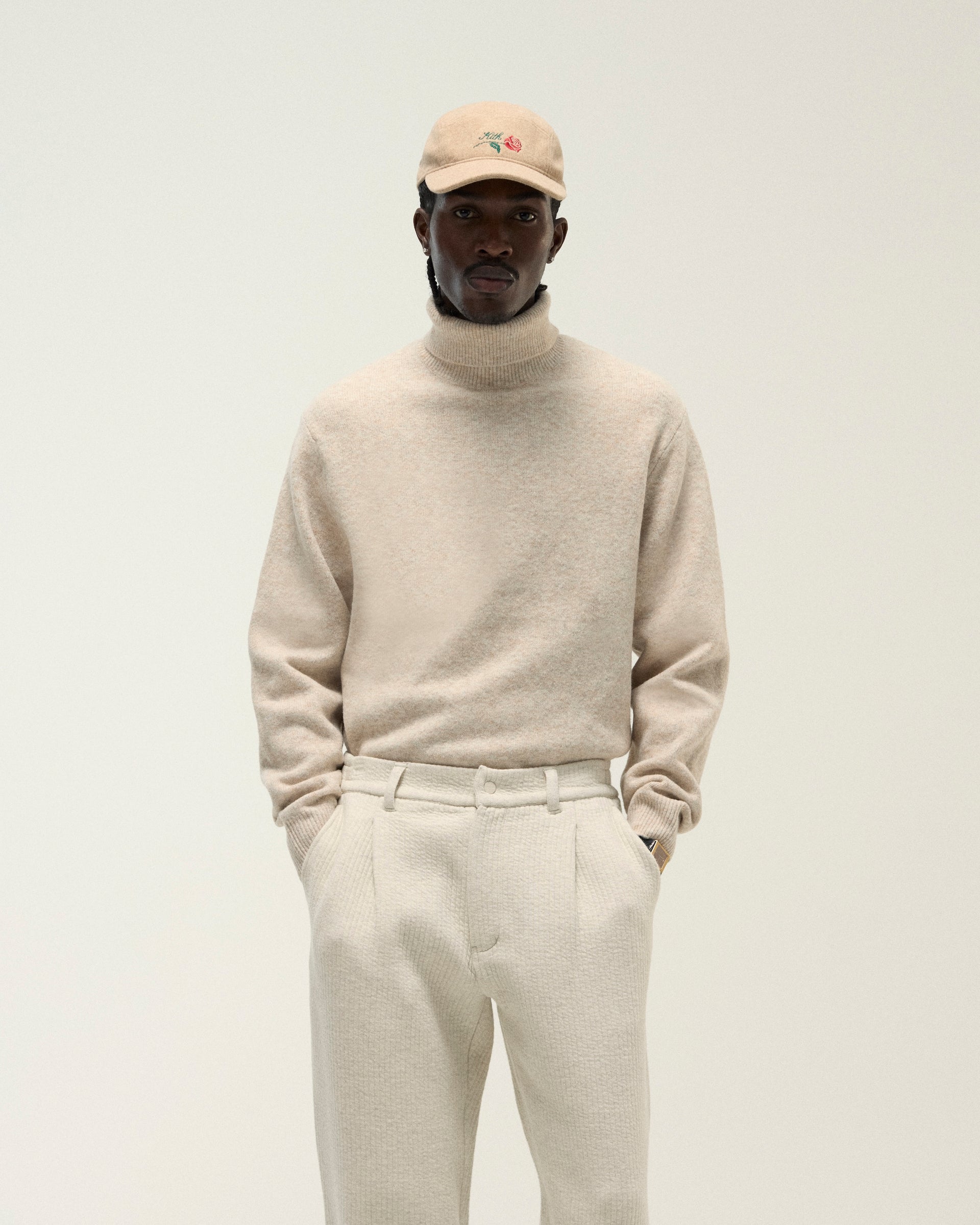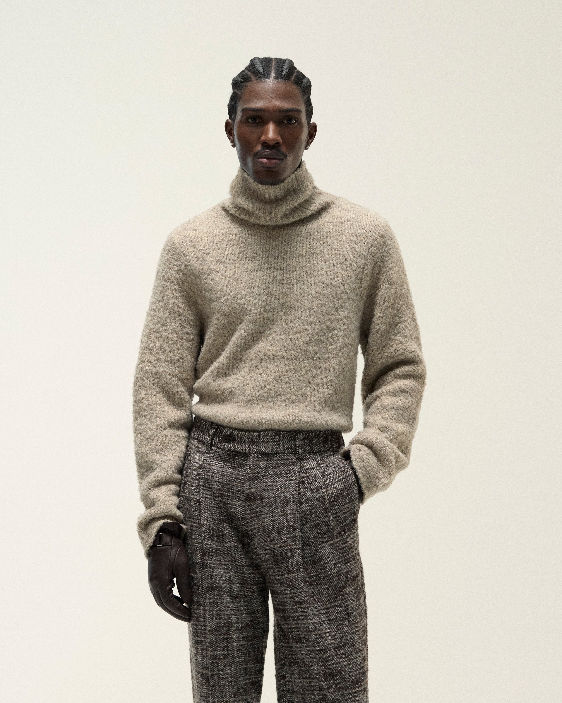 Our latest offering comprises the Ginza Cardigan in super chunky yarn and the Walker Turtleneck crafted from custom speckled boucle yarn. Offered in a variety of neutral tones.