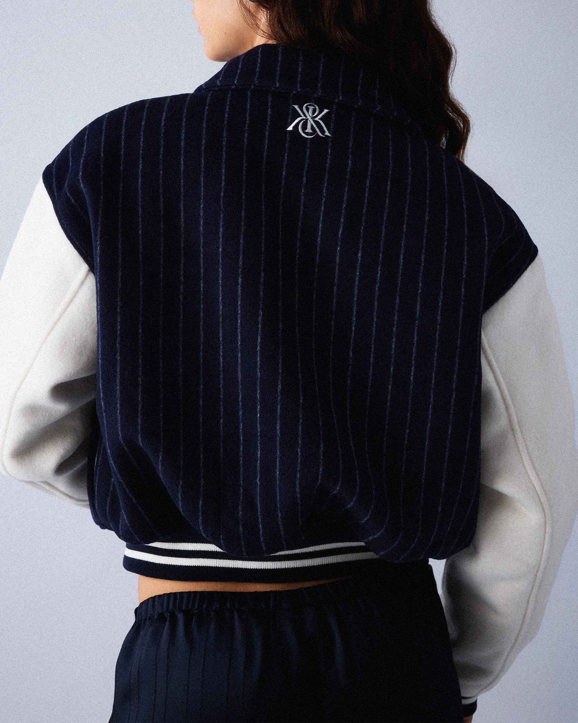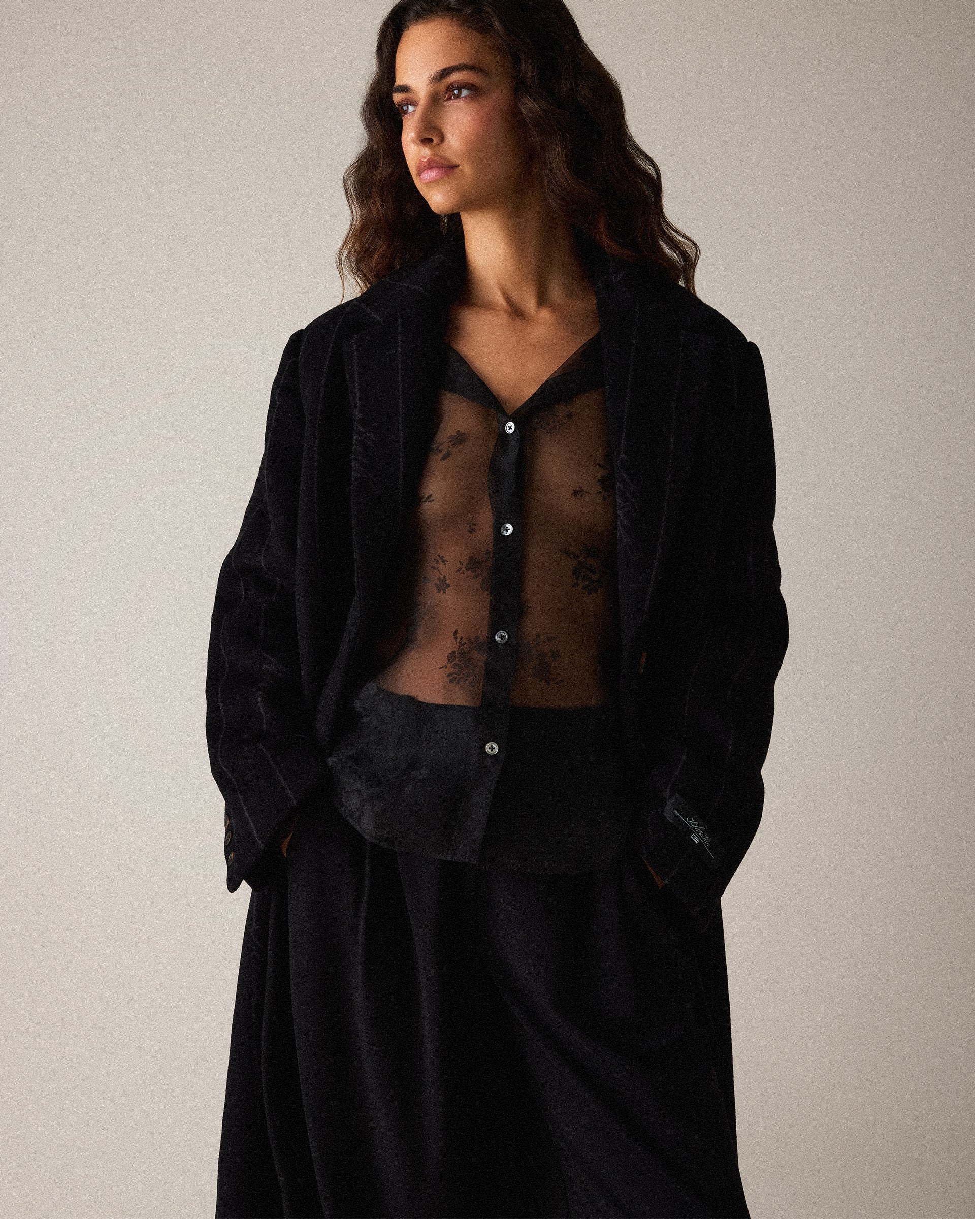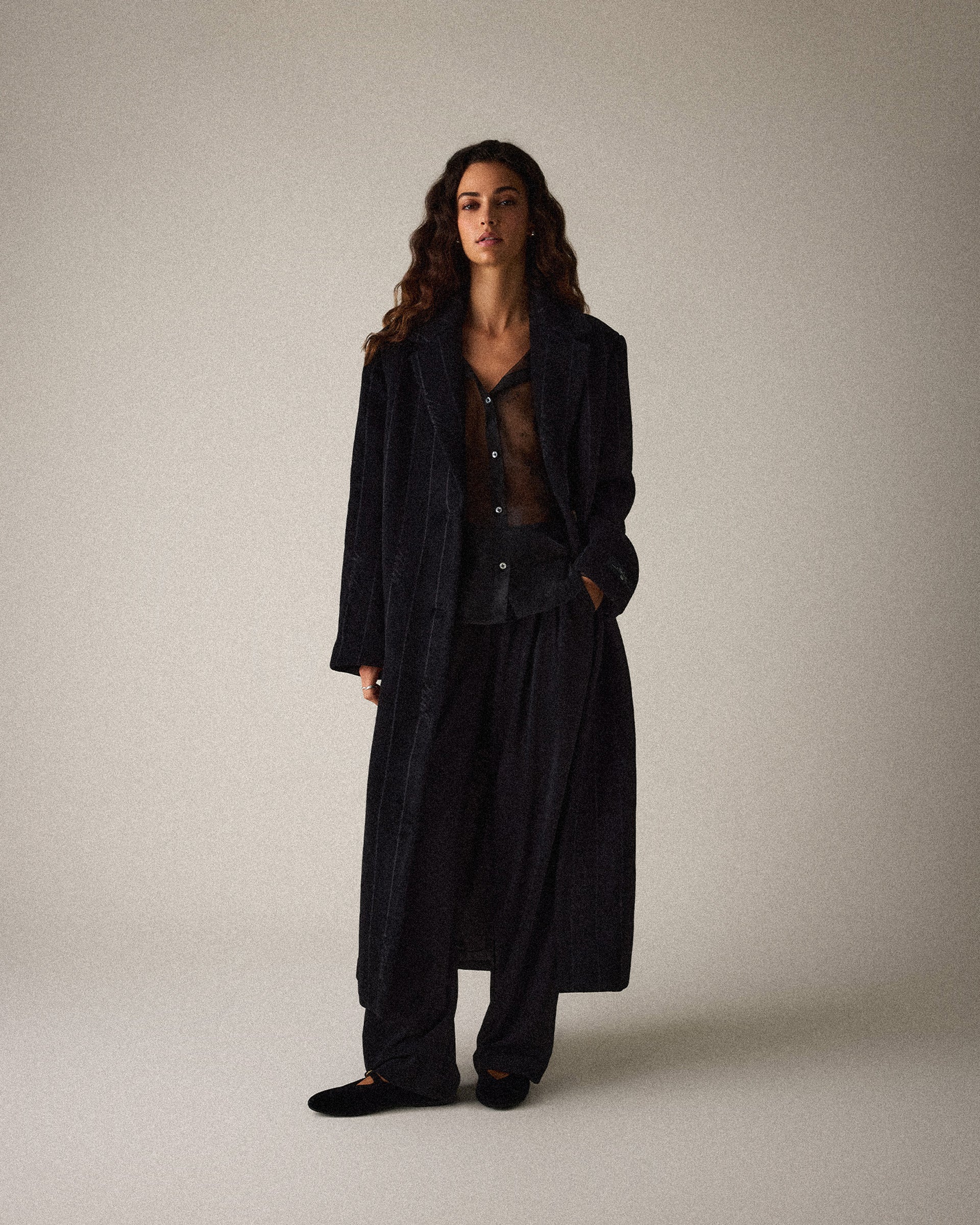 Jackets and coats ranging from lightweight to heavy, seen across fabrics like textured velvet, Kith Script jacquard wool, and pointelle satin. Designed for effortless layering as the seasons change.