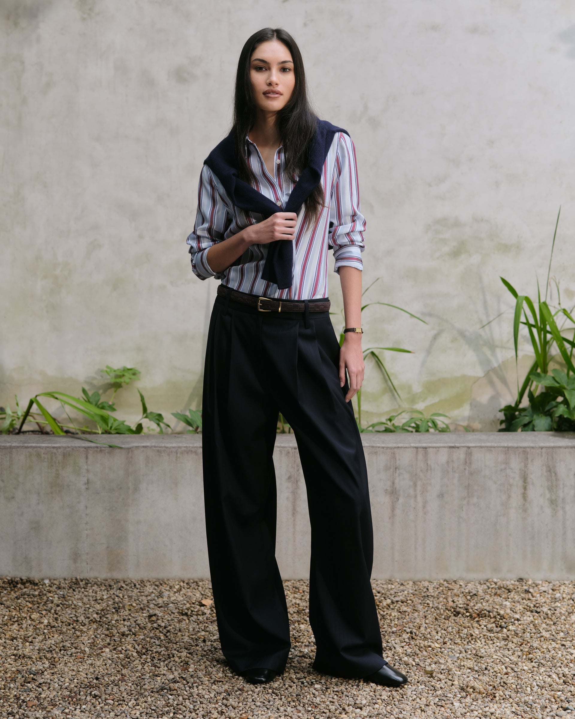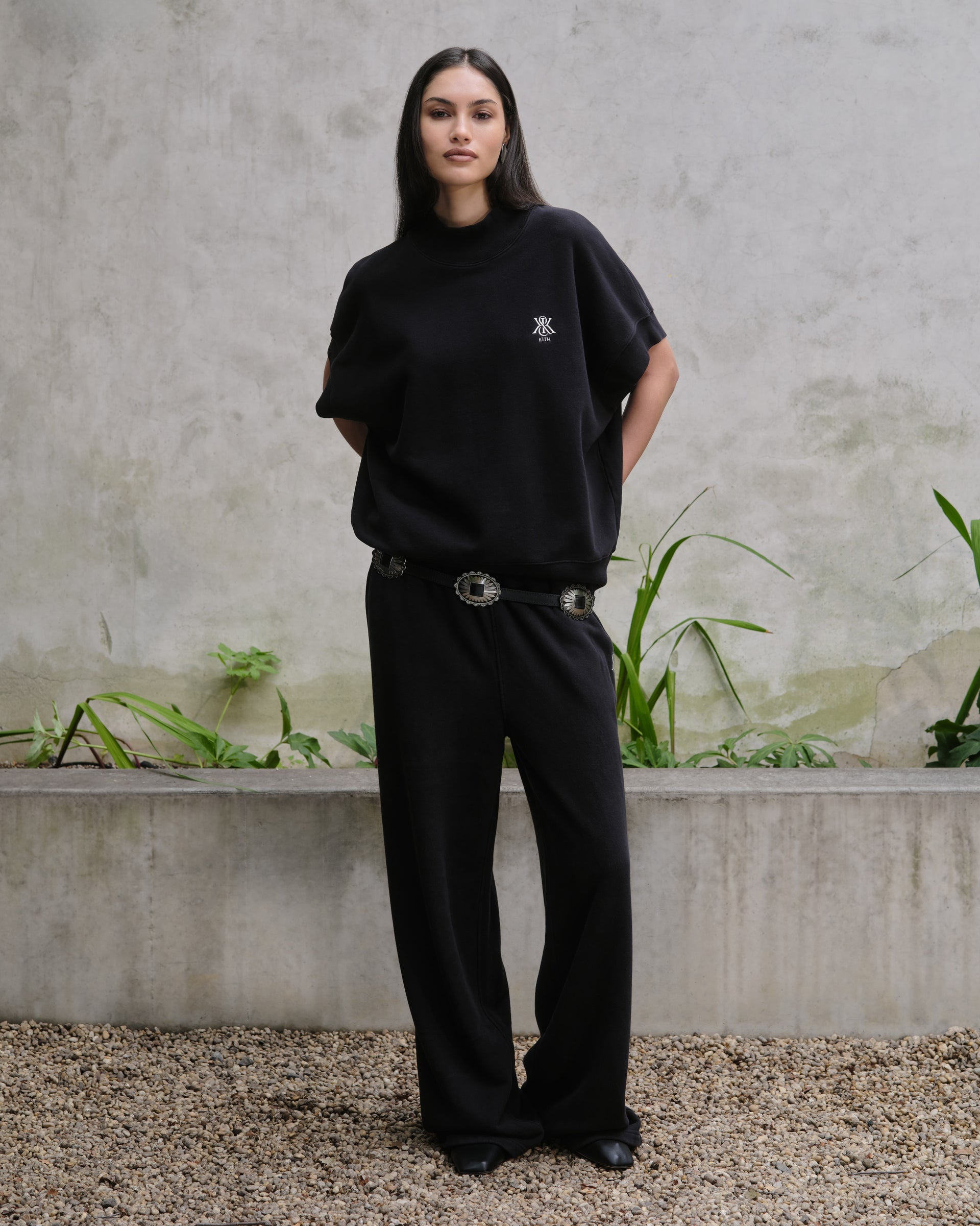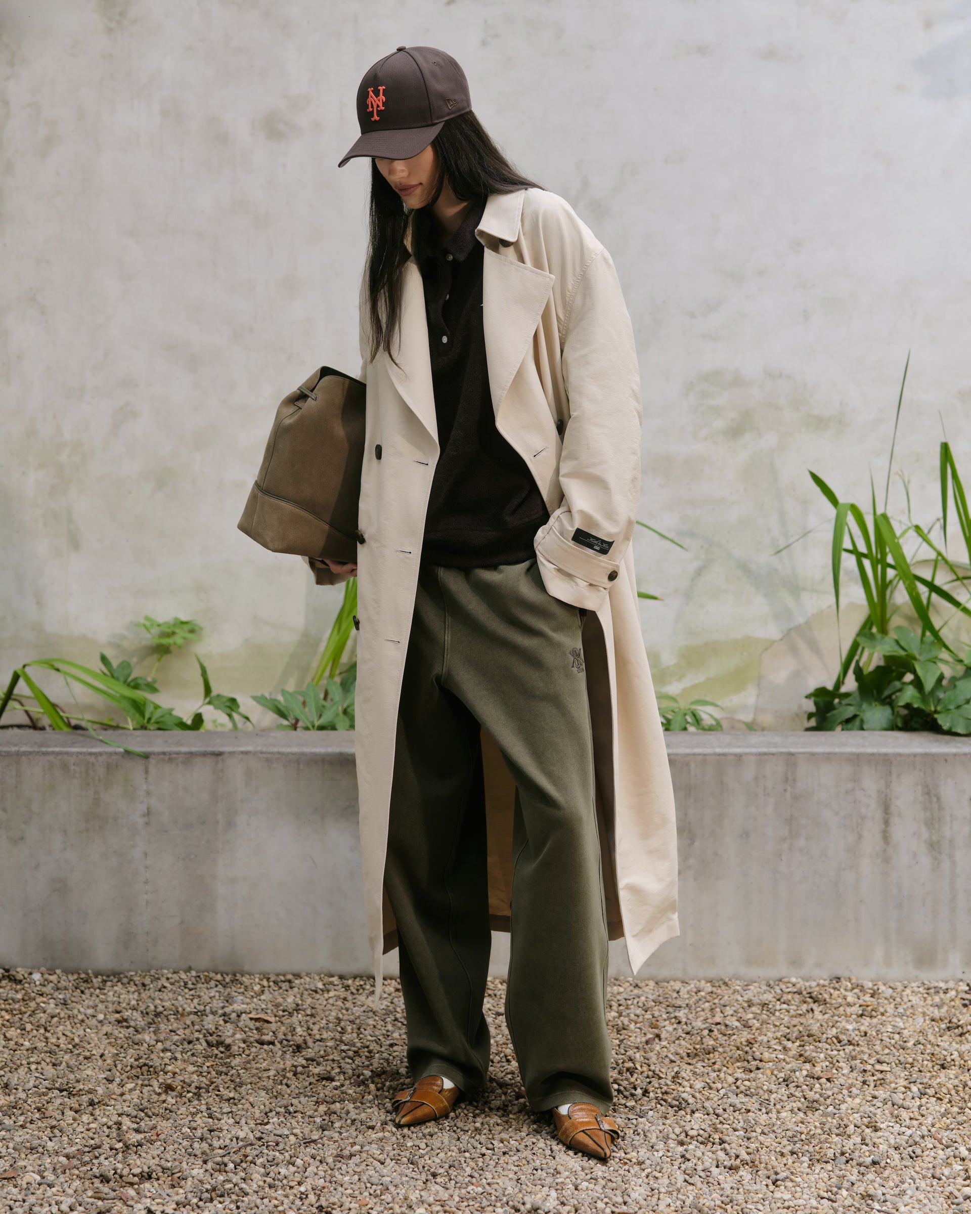 The Miren is featured in felted stretch jersey and bonded microsuede iterations, alongside the Riley II Pleated Trouser, made of double stripe twill ideal for seasonal suiting. Each has a slightly oversized silhouette, complete with subtle Kith branding.