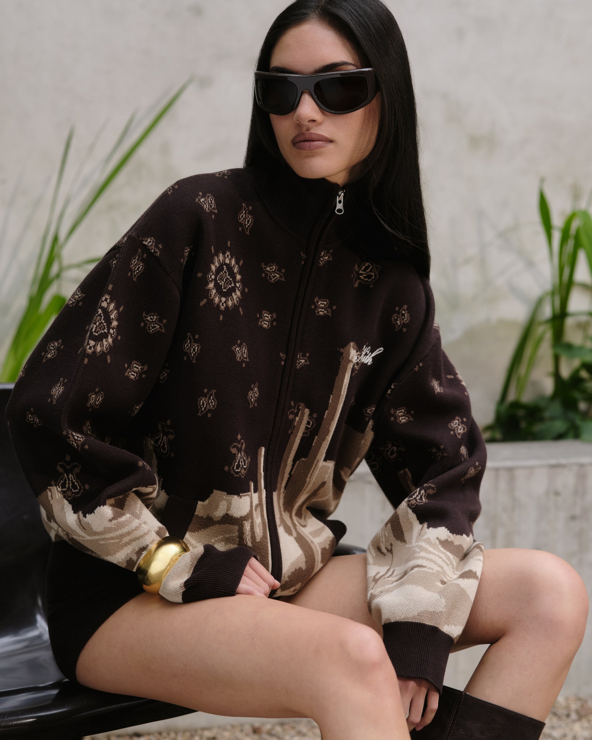 This season’s women’s knitwear assortment is designed for effortless transitioning as the seasons change, comprising lightweight pullovers, zip-ups made of chunky cotton blends, and elevated basics like the Jaden Halter Sweater Tank and the Mina Backless Sweater Hoodie.