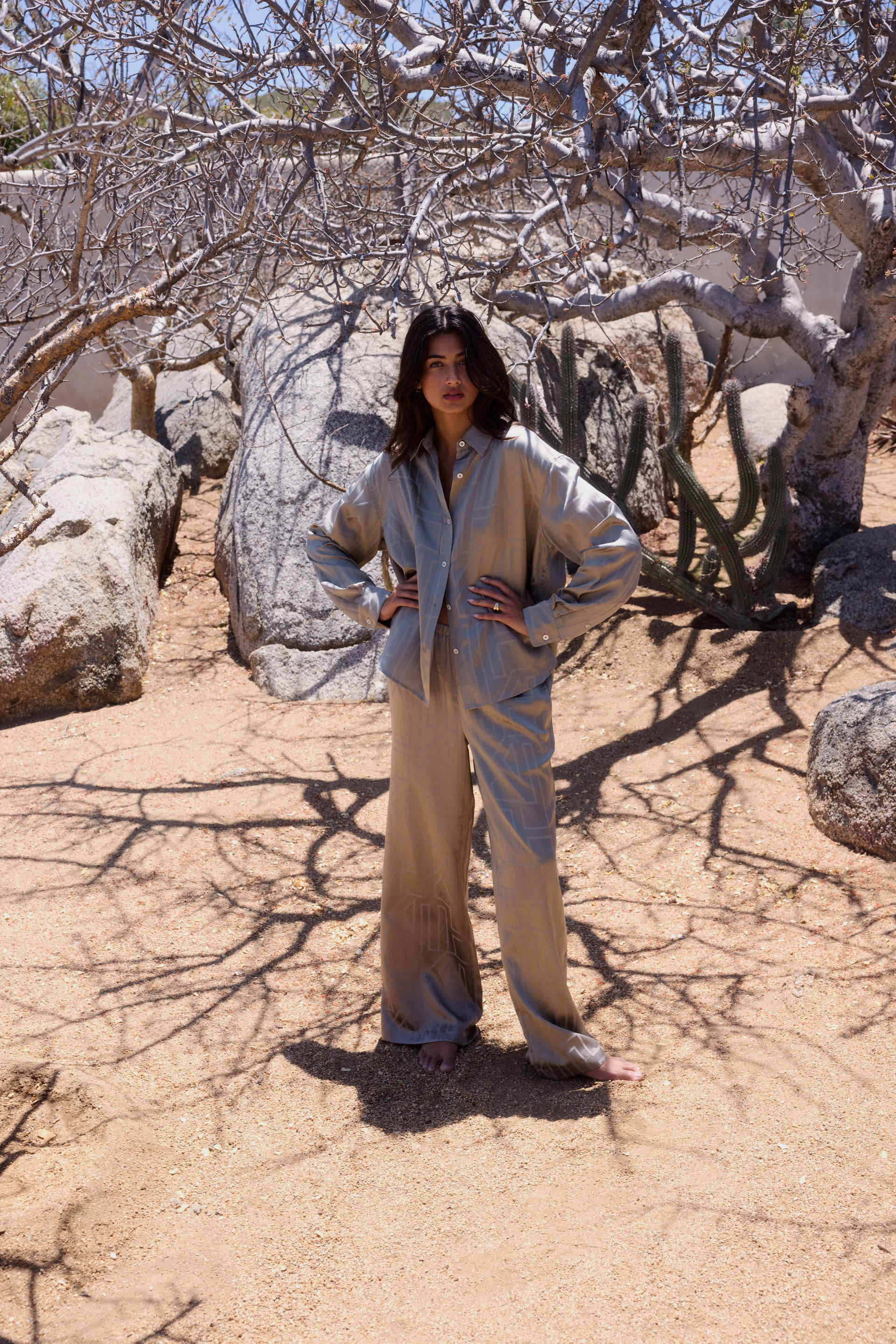 This season introduces the Kavi Pant, an evolution of the Nuru Parachute Pant, in sheer ripstop material. The signature Ida II Pant returns in solid hues with a monogram print. Style with coordinating tops for effortless set dressing.