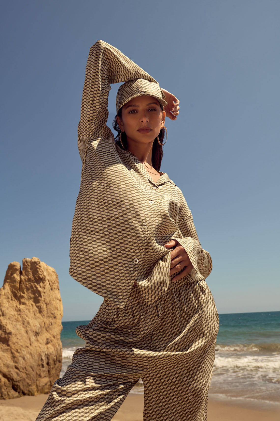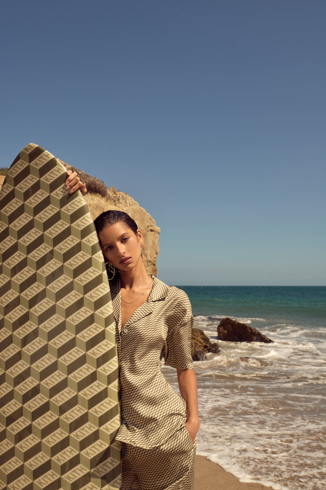Silk & nylon styles get a Deco-monogram update. Style with coordinating tops for effortless, luxurious set dressing.