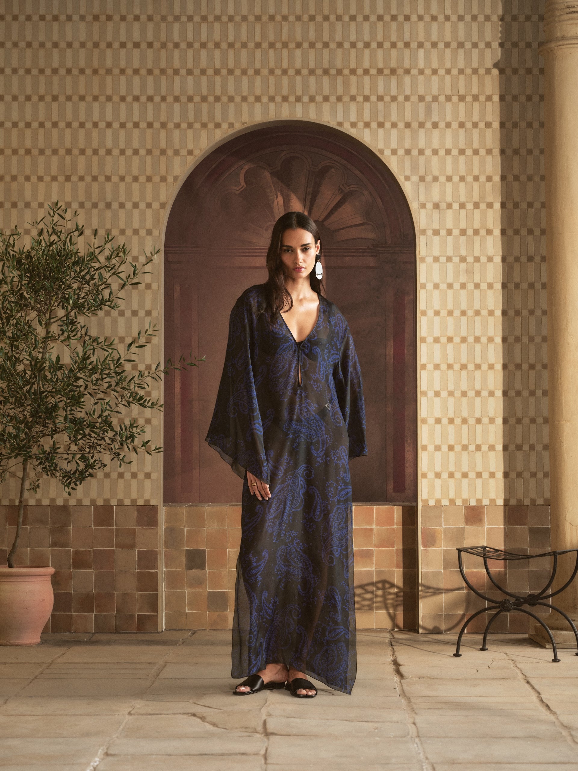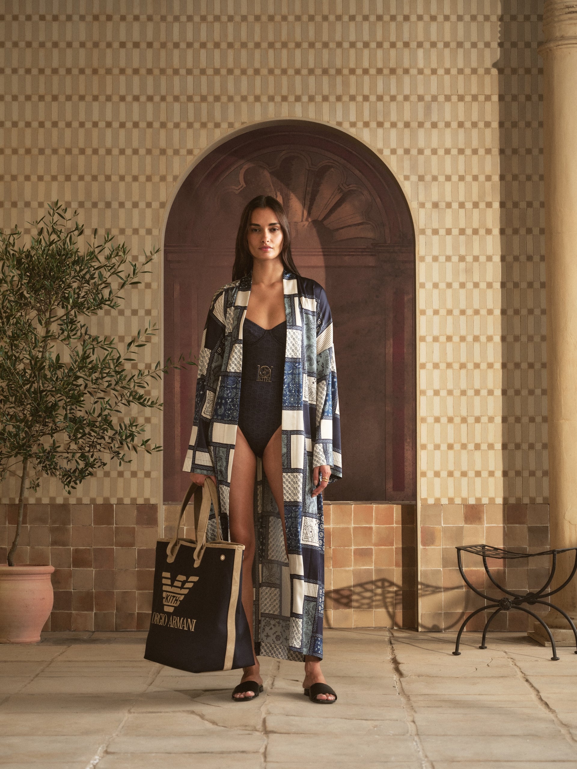 Luxury dresses, kimonos, gowns and cover-ups define the assortment. Crafted from hammered satin silk, the Giorgio Armani & Kith Kimono features a refined patchwork print in shades of blue, with subtle co-branded monogram artwork integrated. It has a structured collar, long and wide sleeves, and is designed to wrap around the waist with a self-tie belt. The Silk Dress is crafted from a luxurious viscose-silk blend, featuring a tonal paisley pattern with a sweetheart neckline and fine back straps. It’s finished with a co-branded pendant at the waist in the back. The cover-up dresses—offered in crossover and deep-neckline silhouettes—are sophisticated in design and material. Each piece is made from an ultra-soft and lightweight silk blend. Completing the offering is an elevated gown ideal for fine dining and nights out.