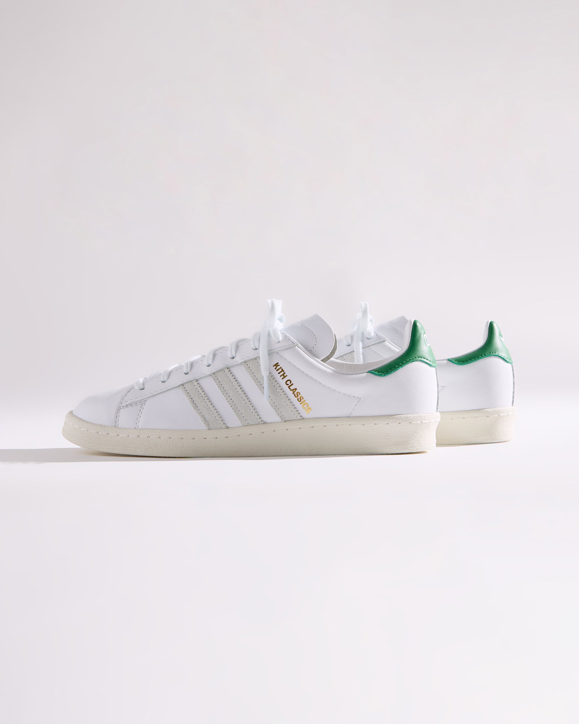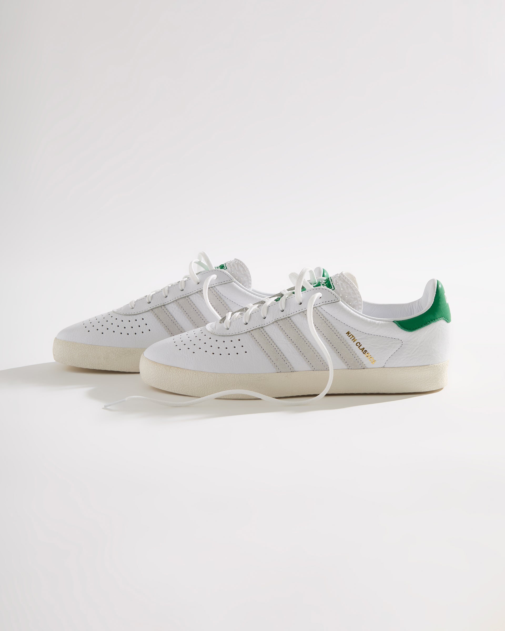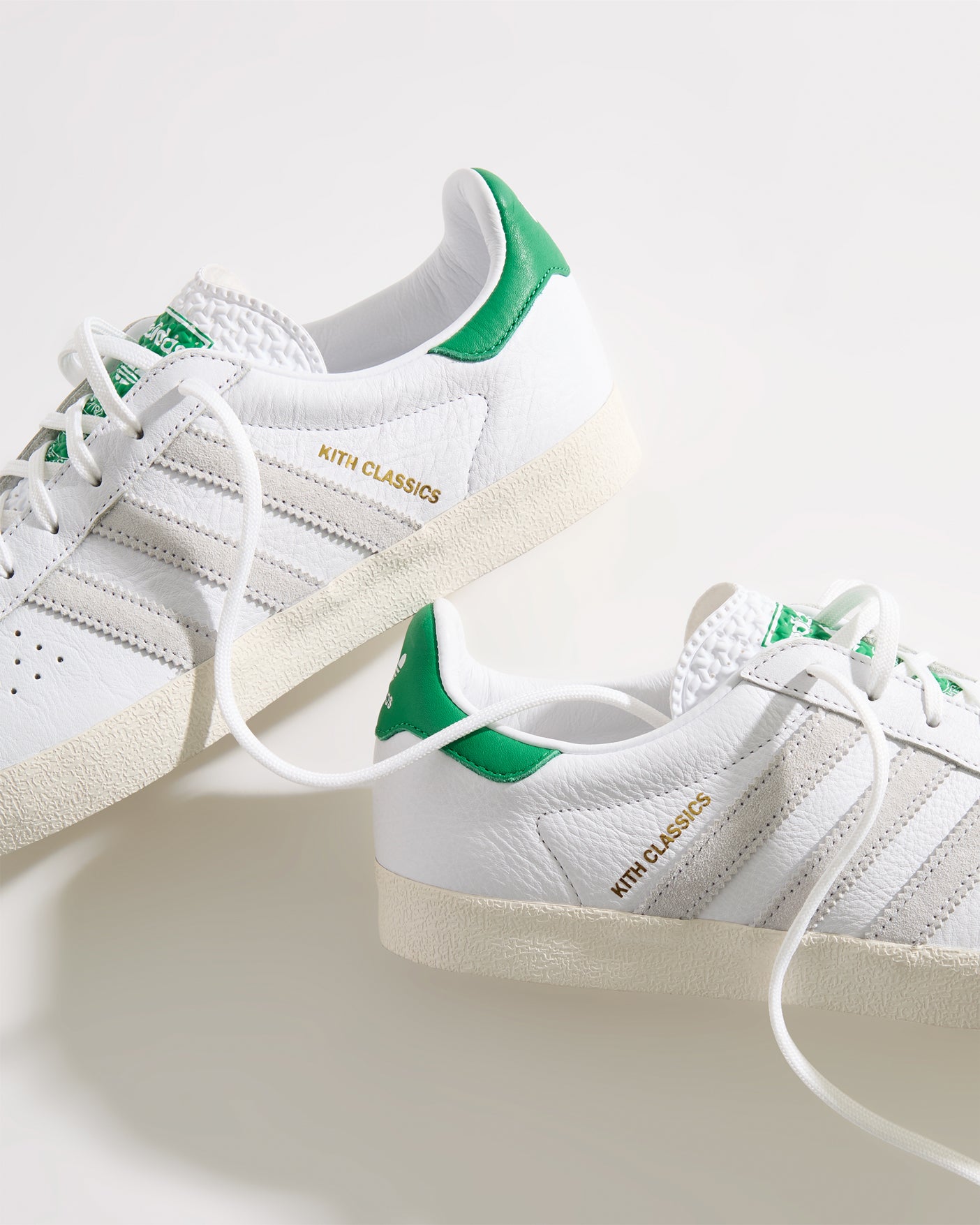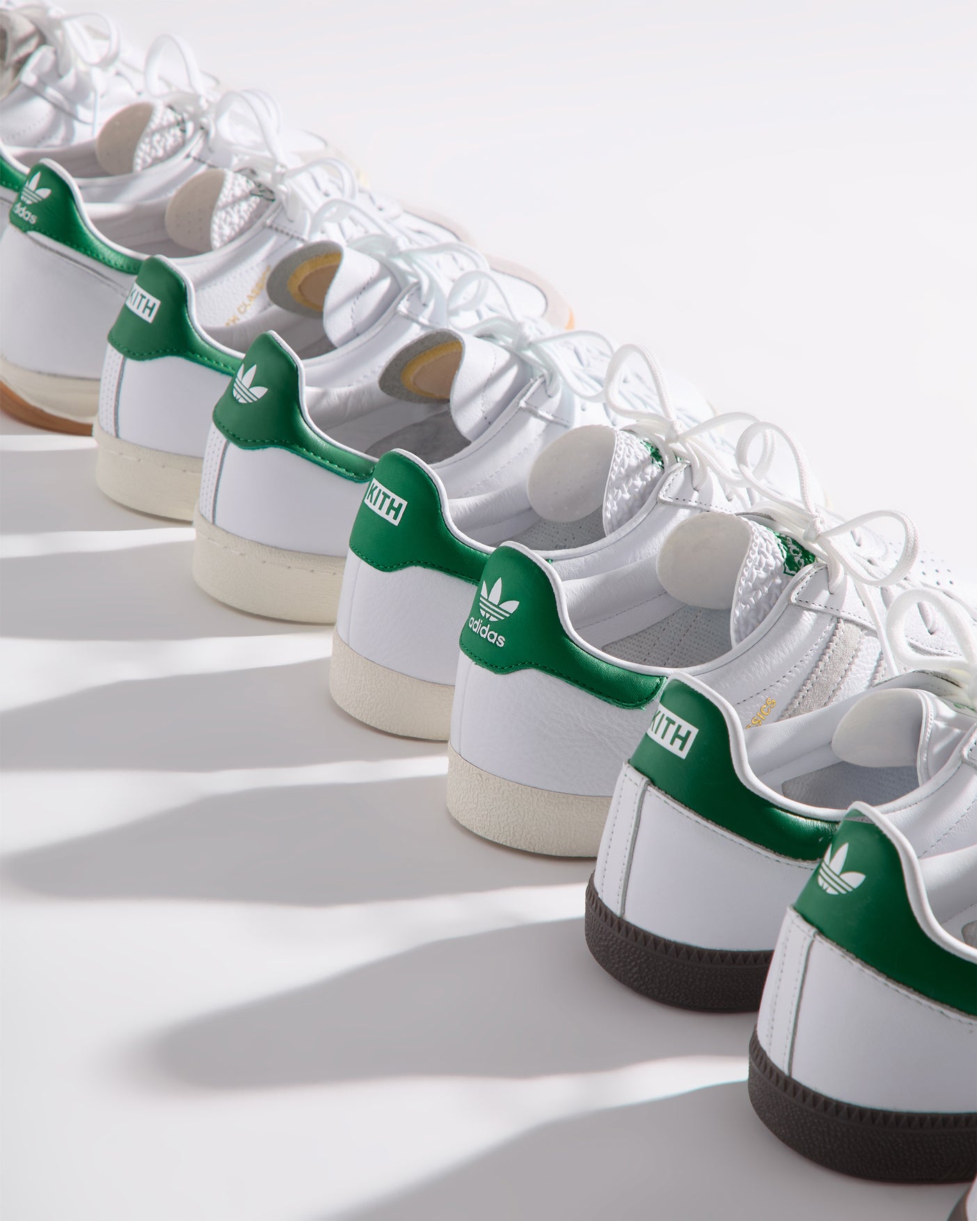 Each style is crafted from premium leather and features the Kith Classic logo with a green backdrop on the heel. Select styles showcase gold-foil Kith Classics branding alongside suede razor-edged adidas stripes.