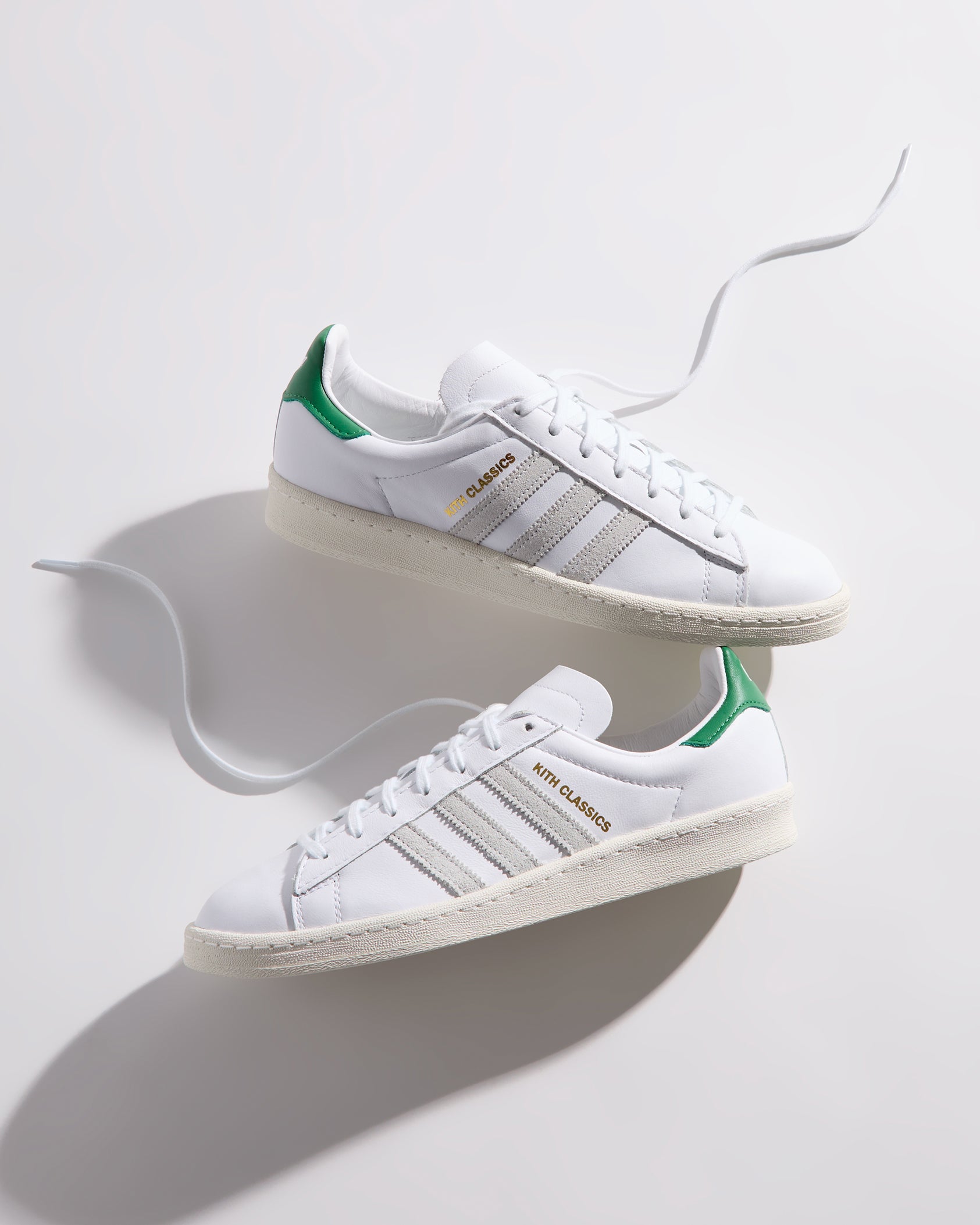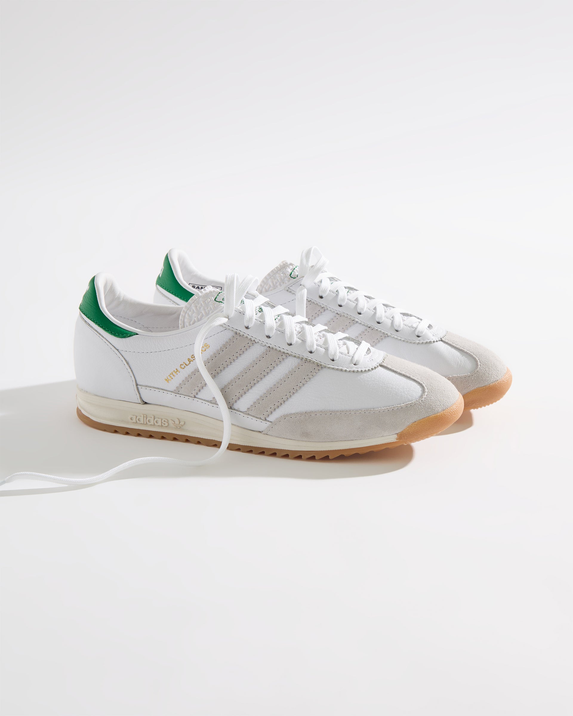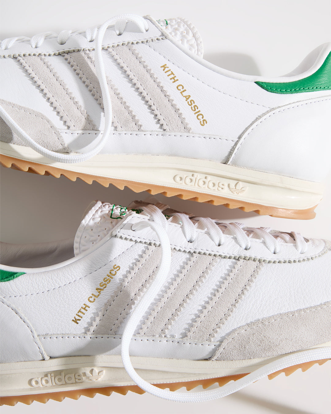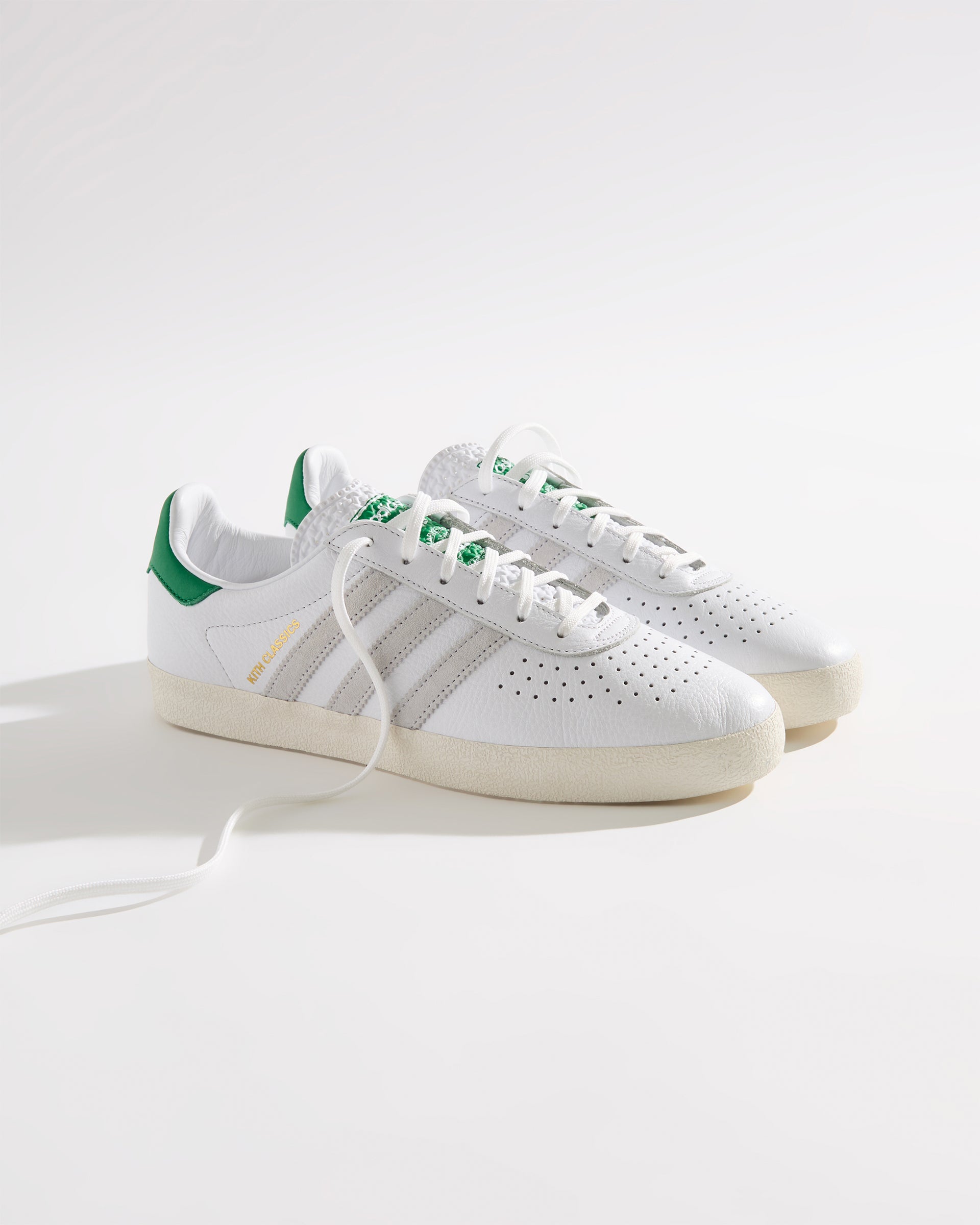 Each style is crafted from premium leather and features the Kith Classic logo with a green backdrop on the heel. Select styles showcase gold-foil Kith Classics branding alongside suede razor-edged adidas stripes.