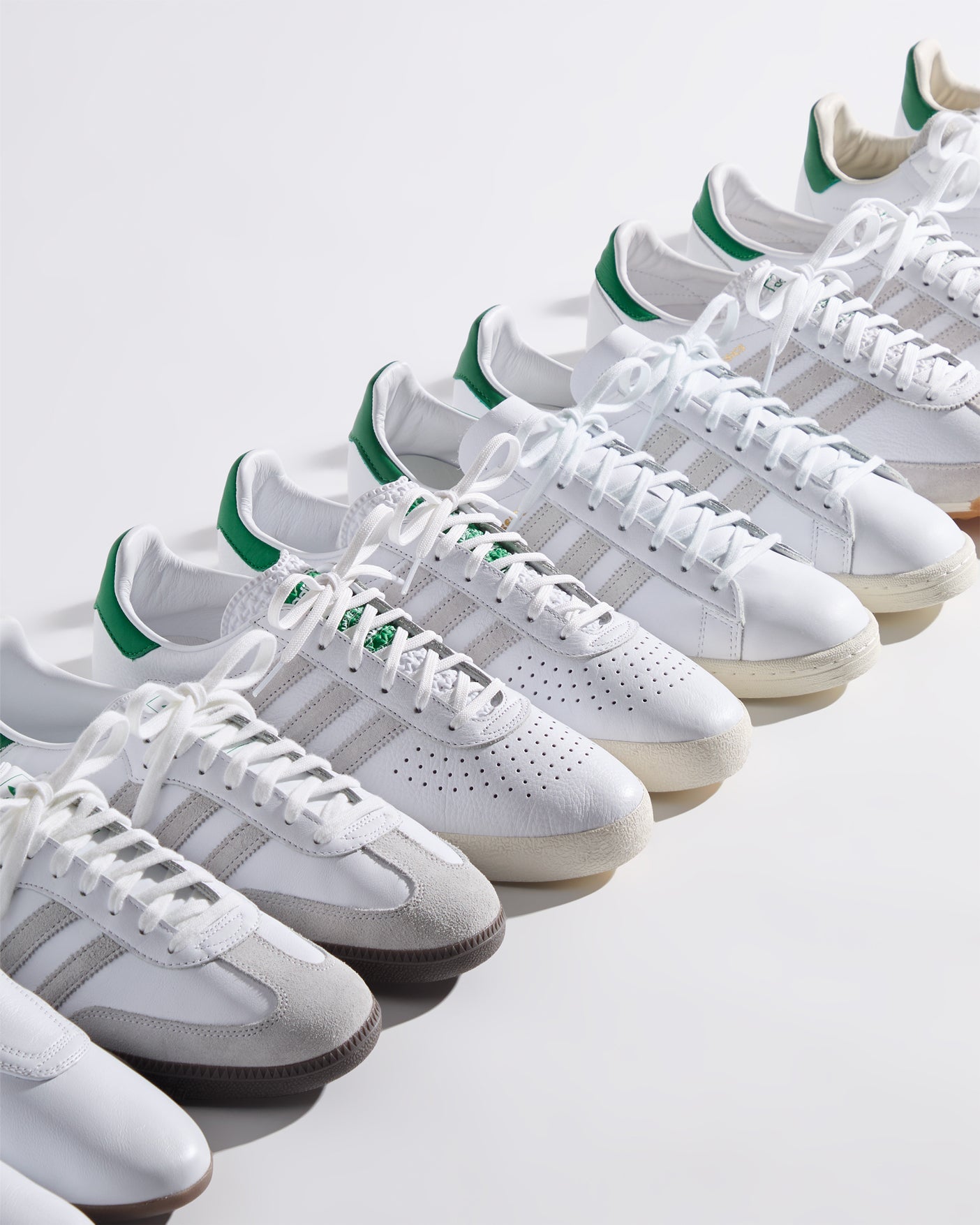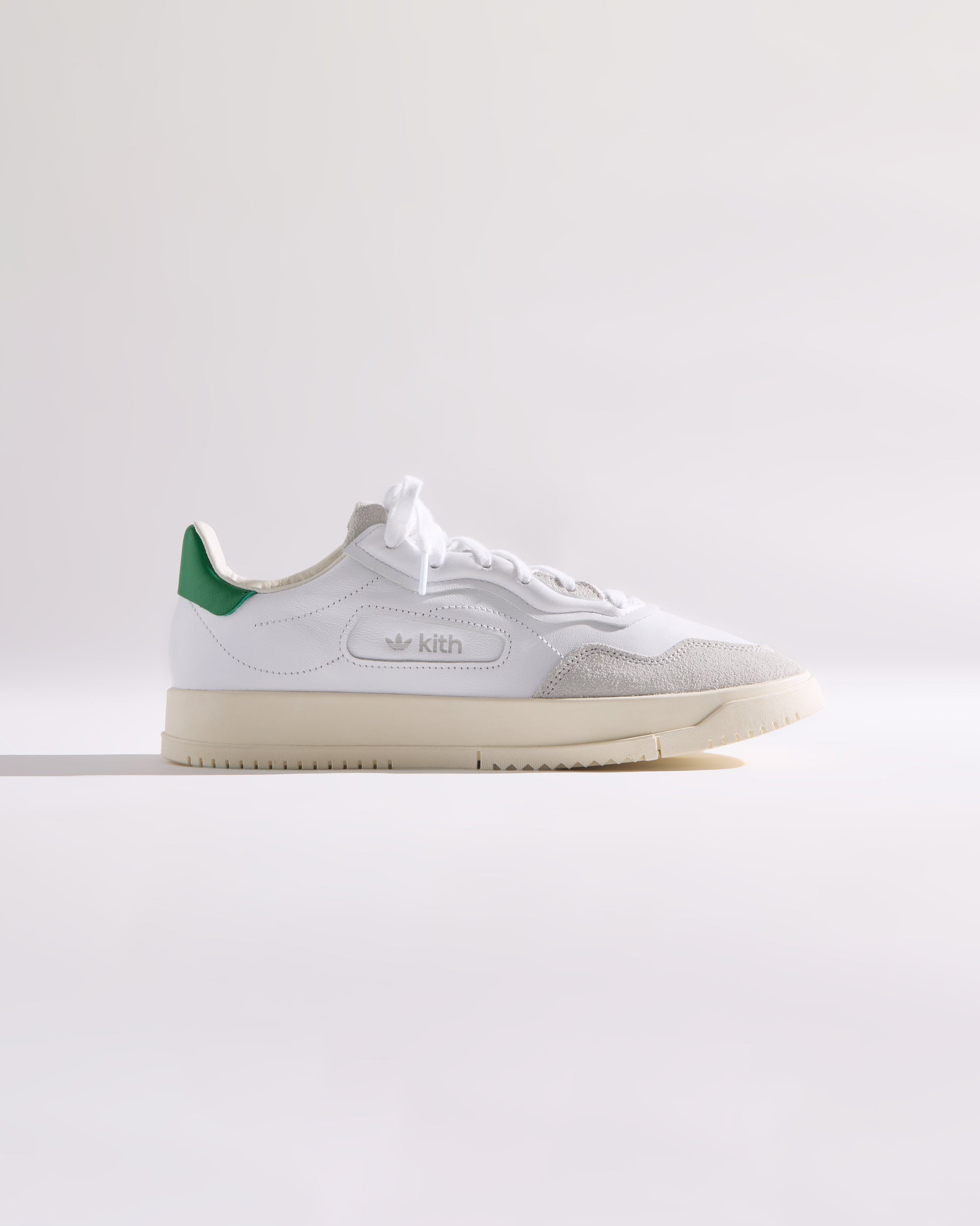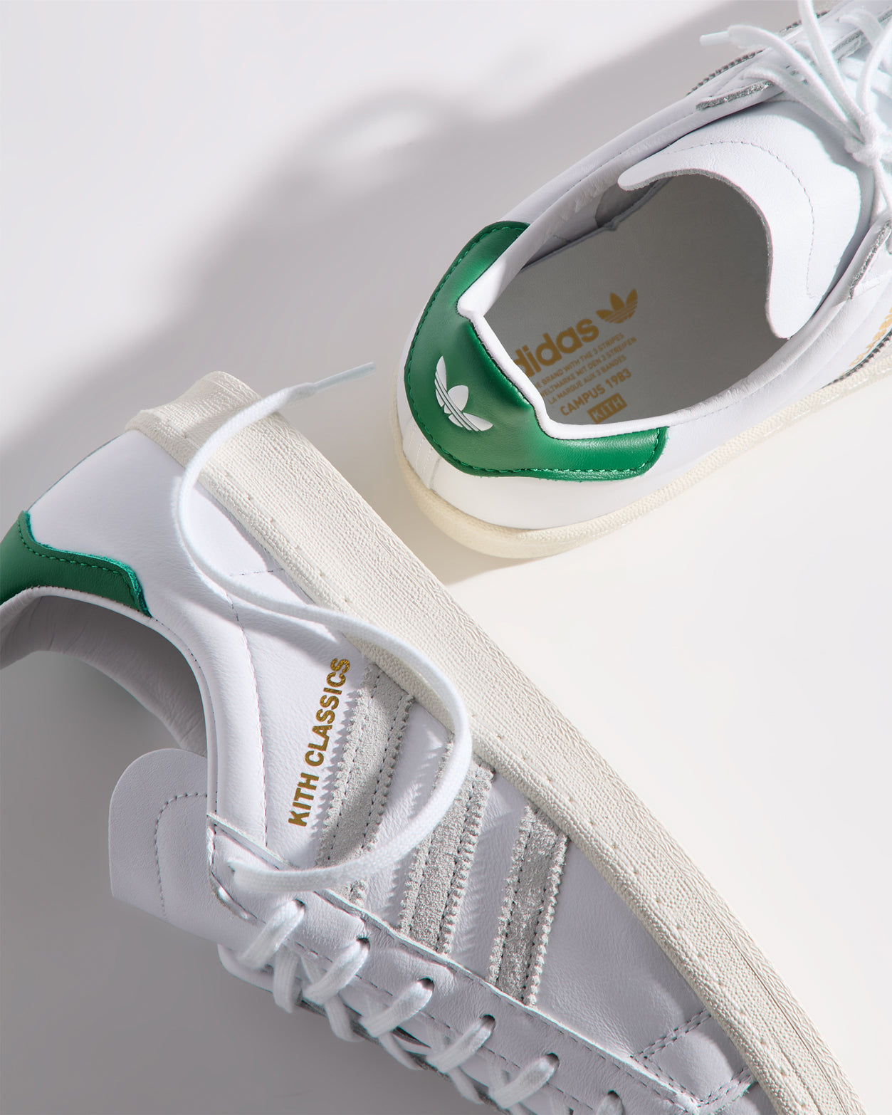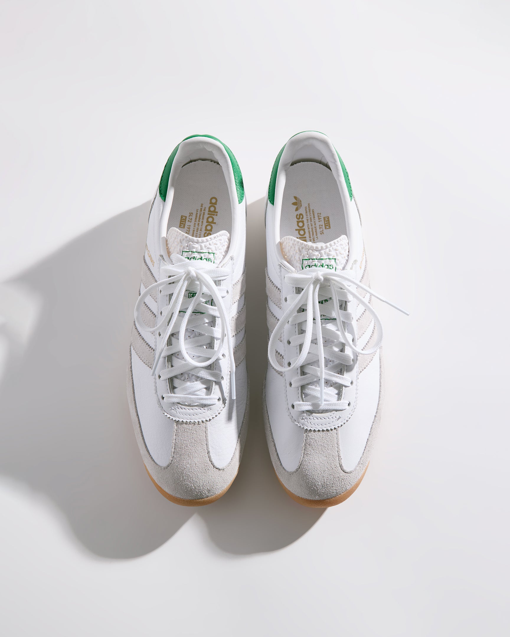 Each style is crafted from premium leather and features the Kith Classic logo with a green backdrop on the heel. Select styles showcase gold-foil Kith Classics branding alongside suede razor-edged adidas stripes.