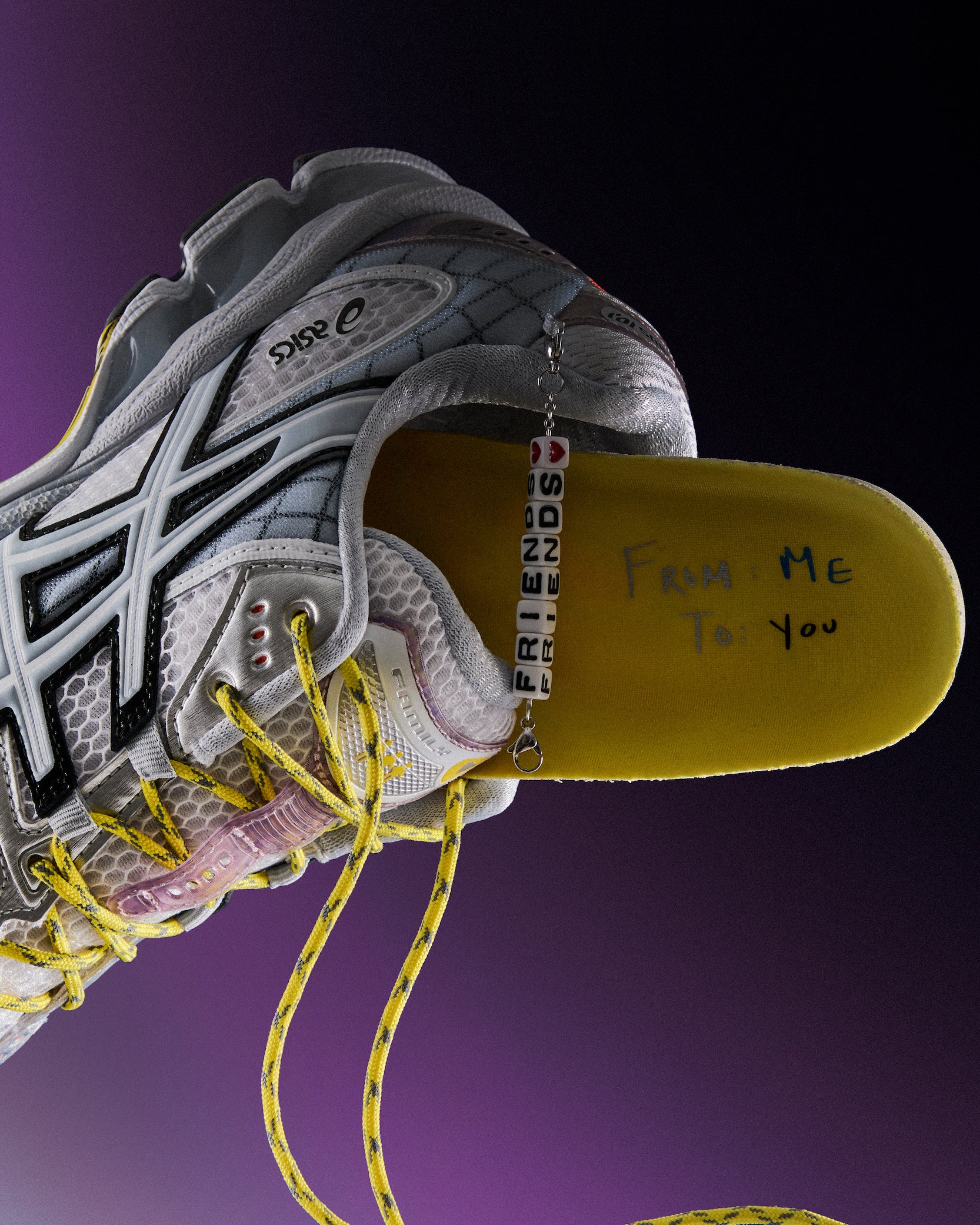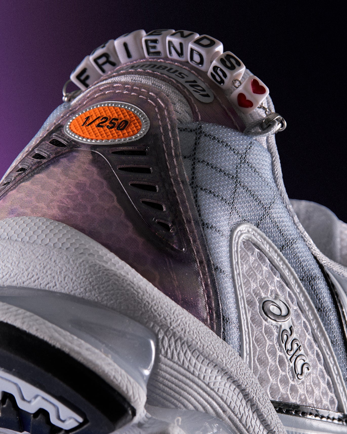 Honoring his biggest motivators, his friends and family, Diggs redesigns the NIMBUS with an innovative heel tab that mirrors the style of a friendship bracelet and the word “Family” on the tongue, accompanied by heart motifs and symbolic stickman artwork. Color plays a pivotal role in the design, with vibrant yellow and metallic pink accents that inject a sense of joy and liveliness into the shoe.