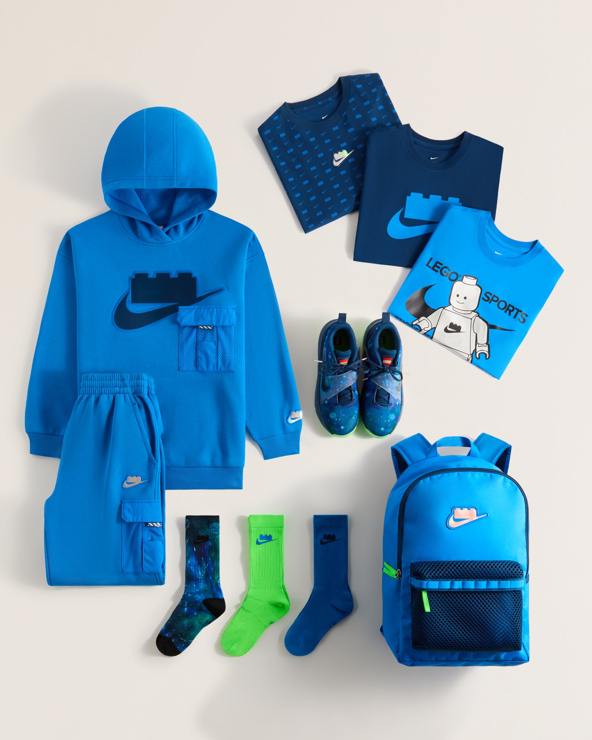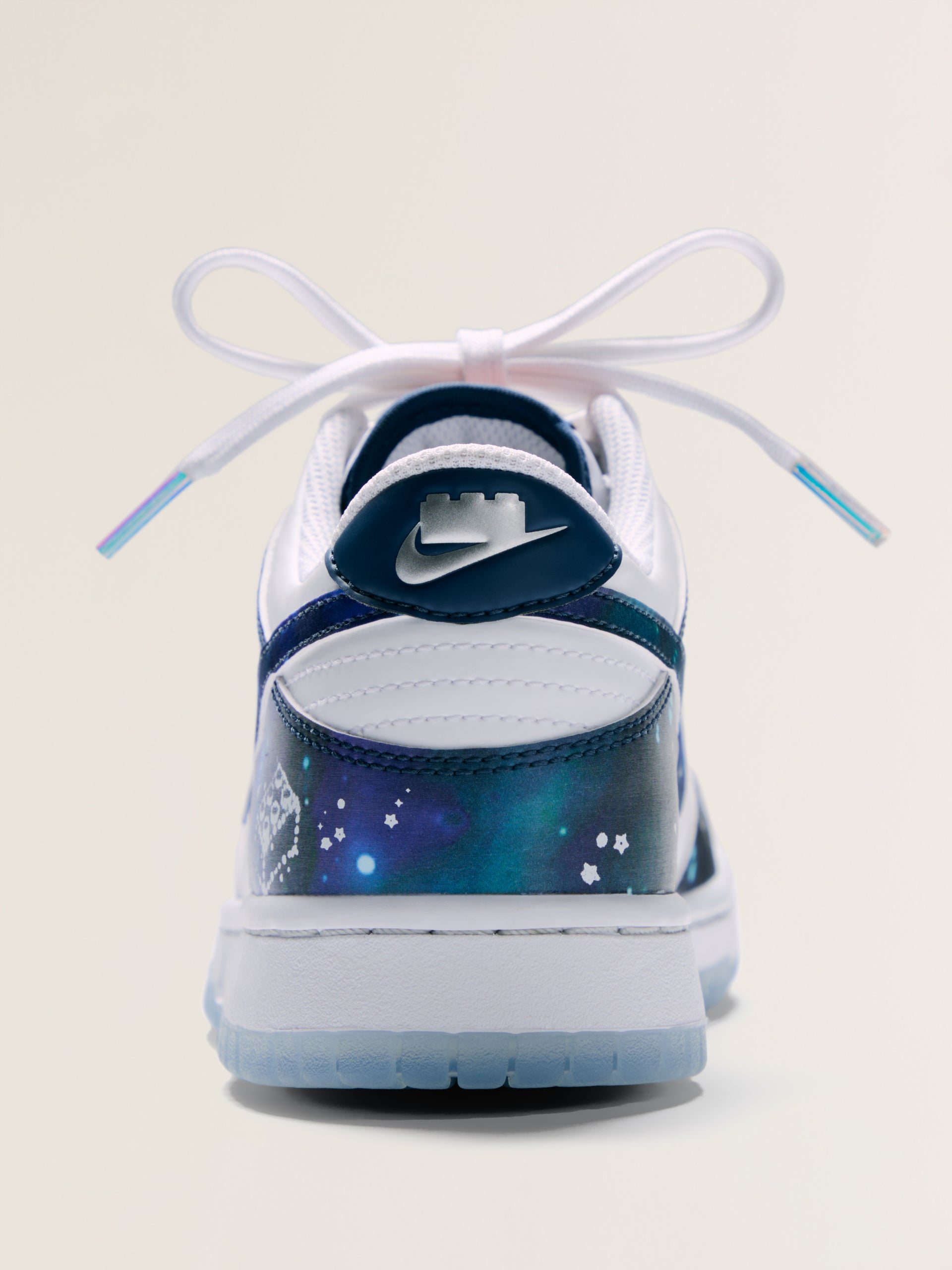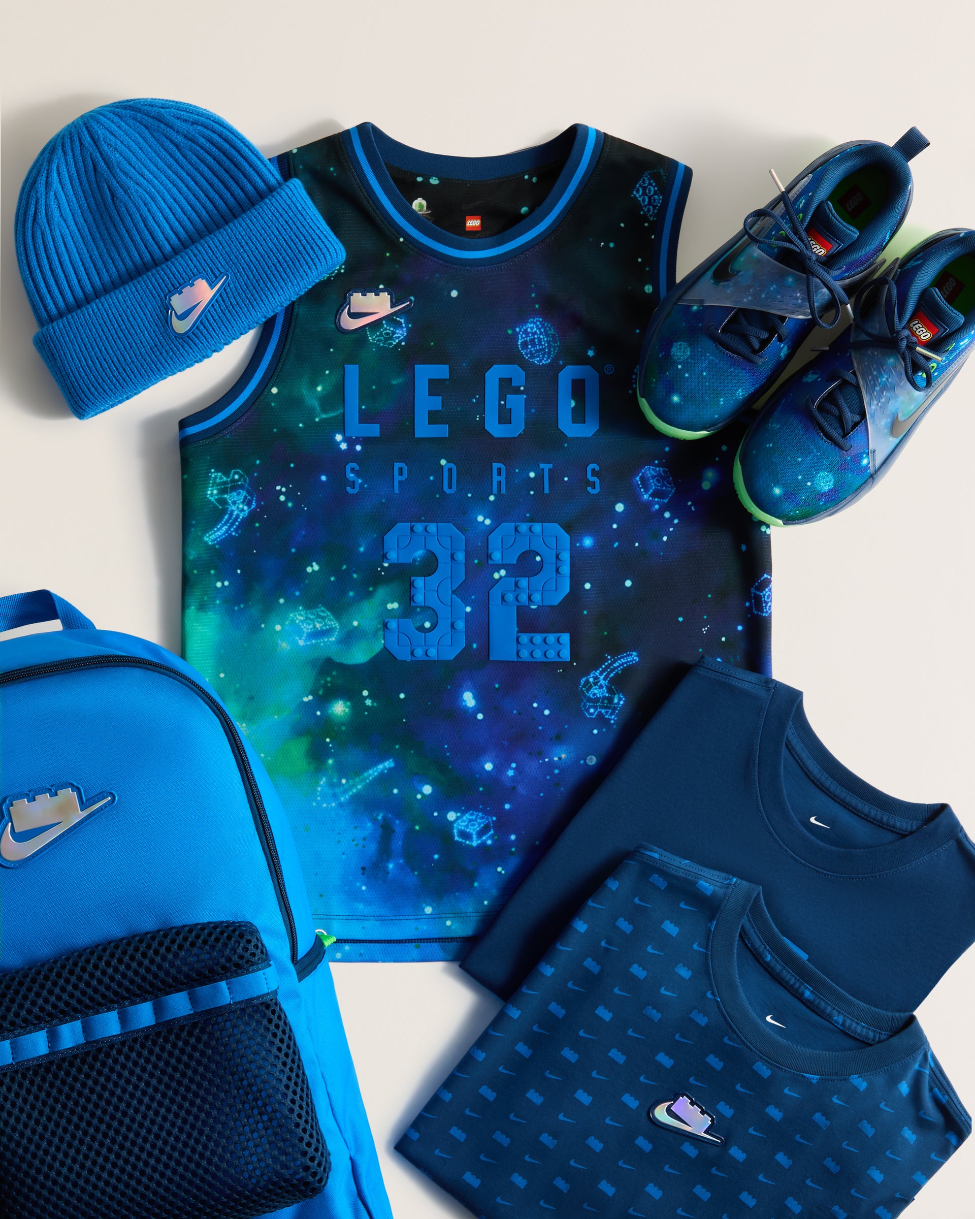 As the third iteration of a three-part collaboration, this assortment from the Nike and LEGO Collection is designed in the Nike Cobalt Blaze and LEGO Dark Azur colorways, featuring galaxy-printed and metallic accents throughout. The footwear component to this release features the Dunk Low in “Brave Blue”, featuring a synthetic leather upper that gains vintage character with each wear, galaxy-printed overlays, and Nike x LEGO® branding throughout, available in both Pre-School and Grade School sizing. The apparel and accessory assortment features the Nike x LEGO Big Kids’ T-Shirt, made from premium cotton with iridescent artwork, the Big Kids’ Dri-FIT Jersey with Brick gradient sublimation, co-branded lettering, and HD silicone numbers, the matching Dri-FIT Crossover Shorts, along with the Oversized Pullover Hoodie and Cargo Pants, also complete with iridescent artwork. The last silhouette, a collaborative Hustle D 12 sneaker, features galaxy-printed mesh and synthetic overlays made up of LEGO constellations, releases later this month on November 15th.