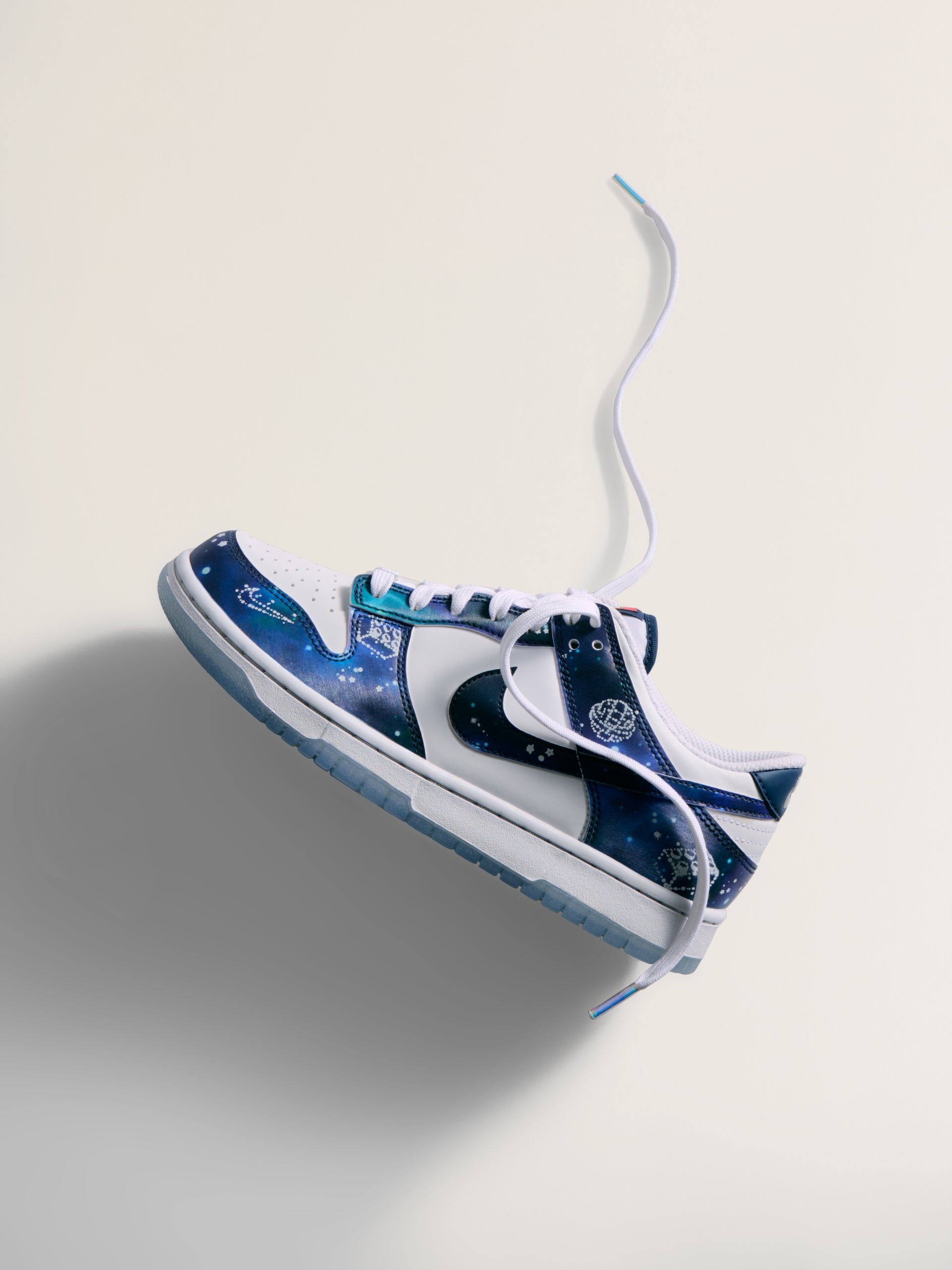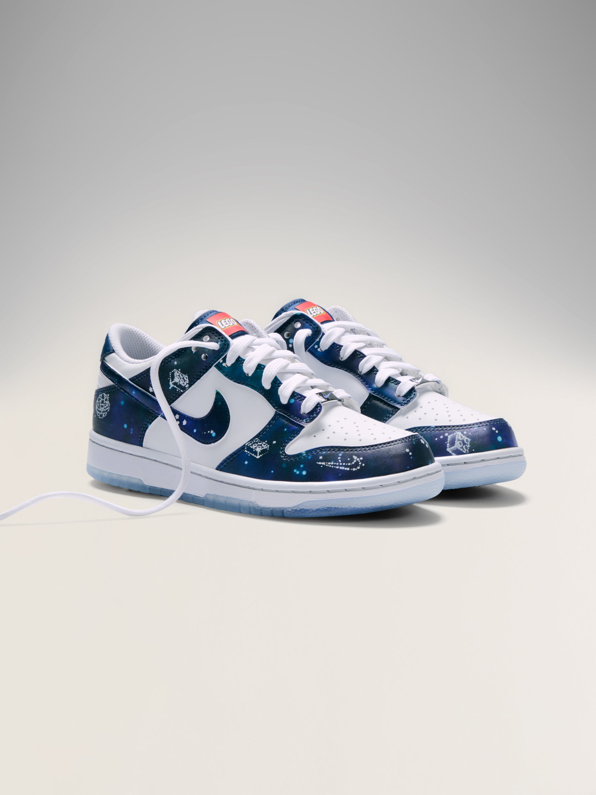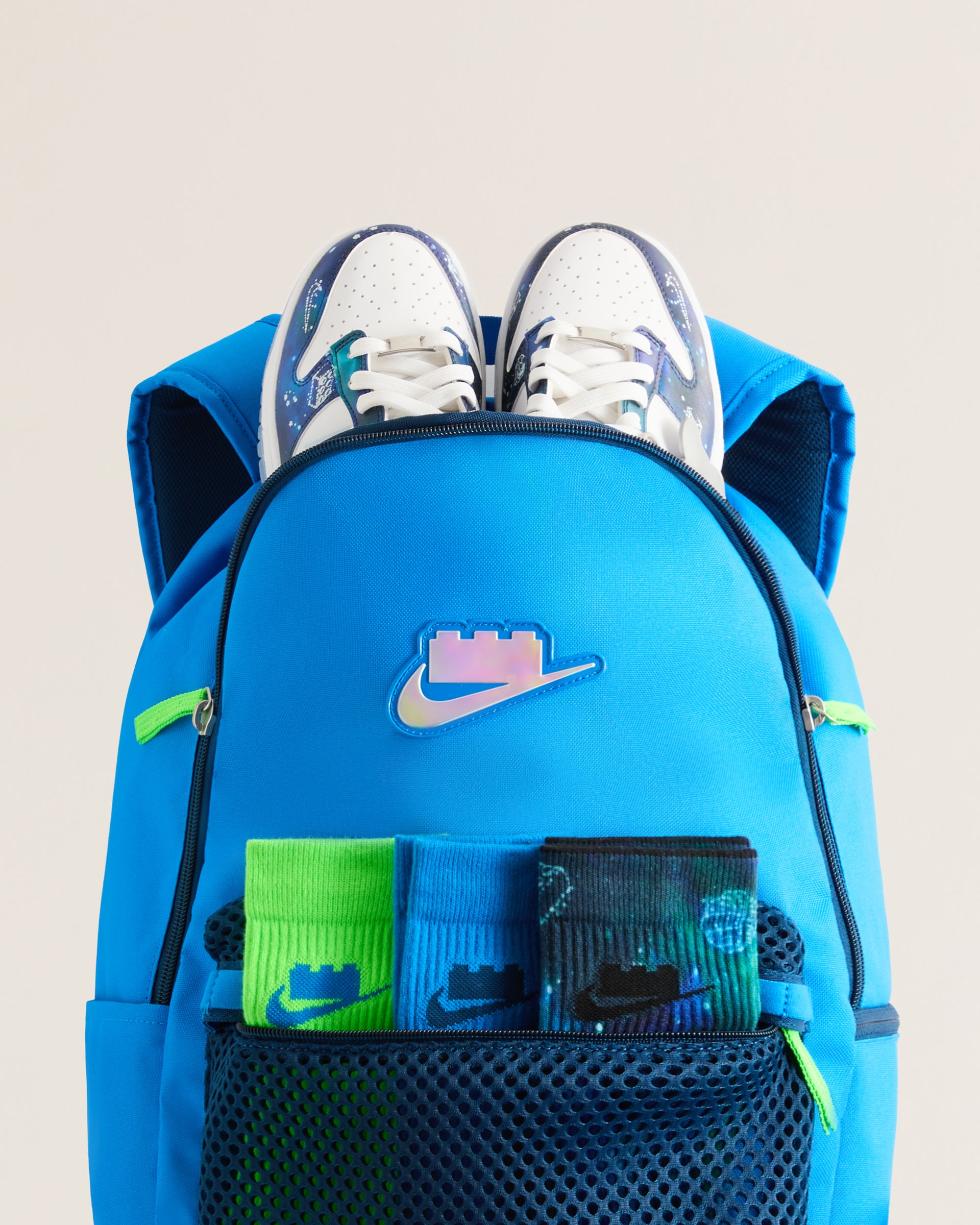 As the third iteration of a three-part collaboration, this assortment from the Nike and LEGO Collection is designed in the Nike Cobalt Blaze and LEGO Dark Azur colorways, featuring galaxy-printed and metallic accents throughout. The footwear component to this release features the Dunk Low in “Brave Blue”, featuring a synthetic leather upper that gains vintage character with each wear, galaxy-printed overlays, and Nike x LEGO® branding throughout, available in both Pre-School and Grade School sizing. The apparel and accessory assortment features the Nike x LEGO Big Kids’ T-Shirt, made from premium cotton with iridescent artwork, the Big Kids’ Dri-FIT Jersey with Brick gradient sublimation, co-branded lettering, and HD silicone numbers, the matching Dri-FIT Crossover Shorts, along with the Oversized Pullover Hoodie and Cargo Pants, also complete with iridescent artwork. The last silhouette, a collaborative Hustle D 12 sneaker, features galaxy-printed mesh and synthetic overlays made up of LEGO constellations, releases later this month on November 15th.