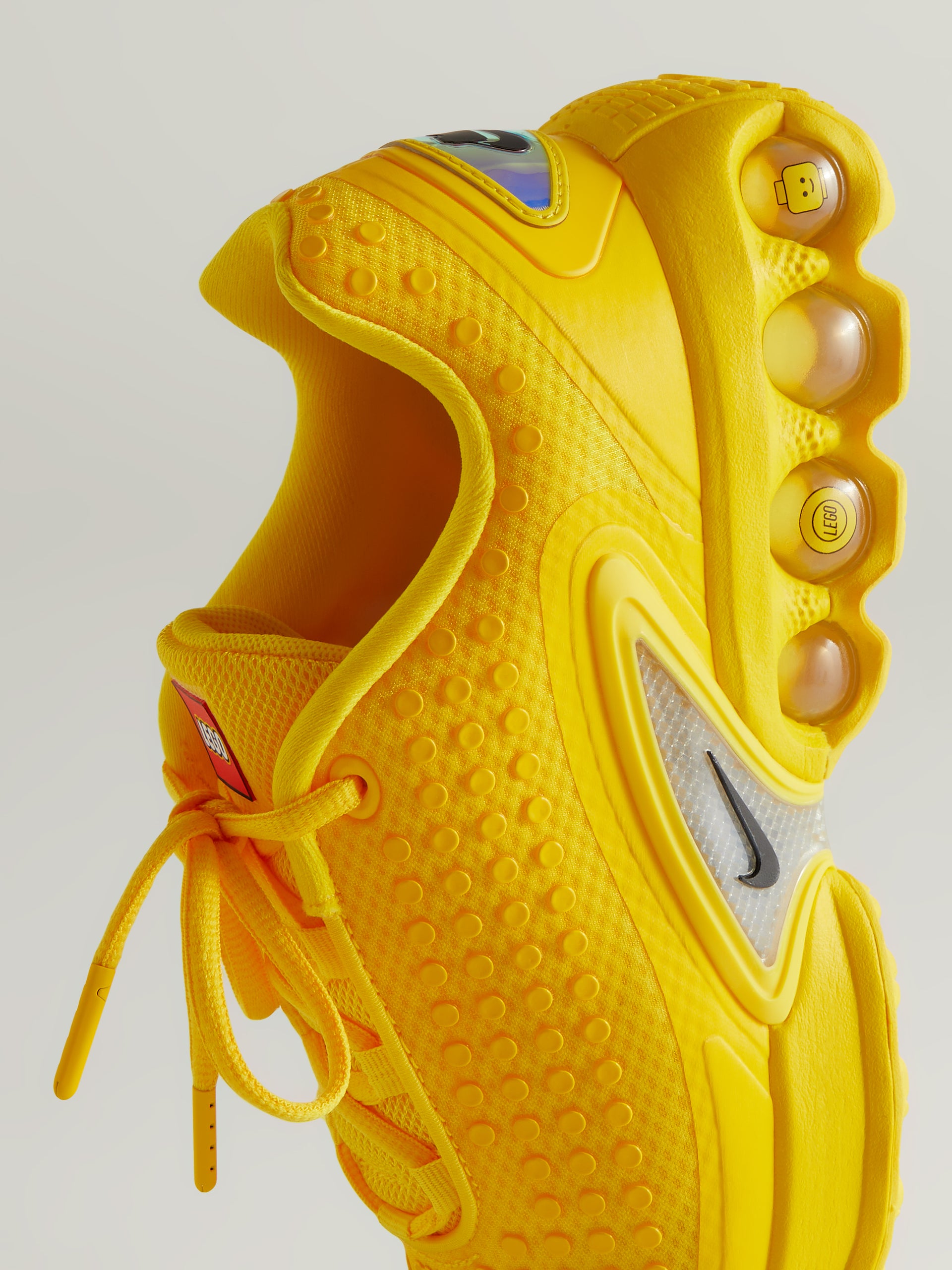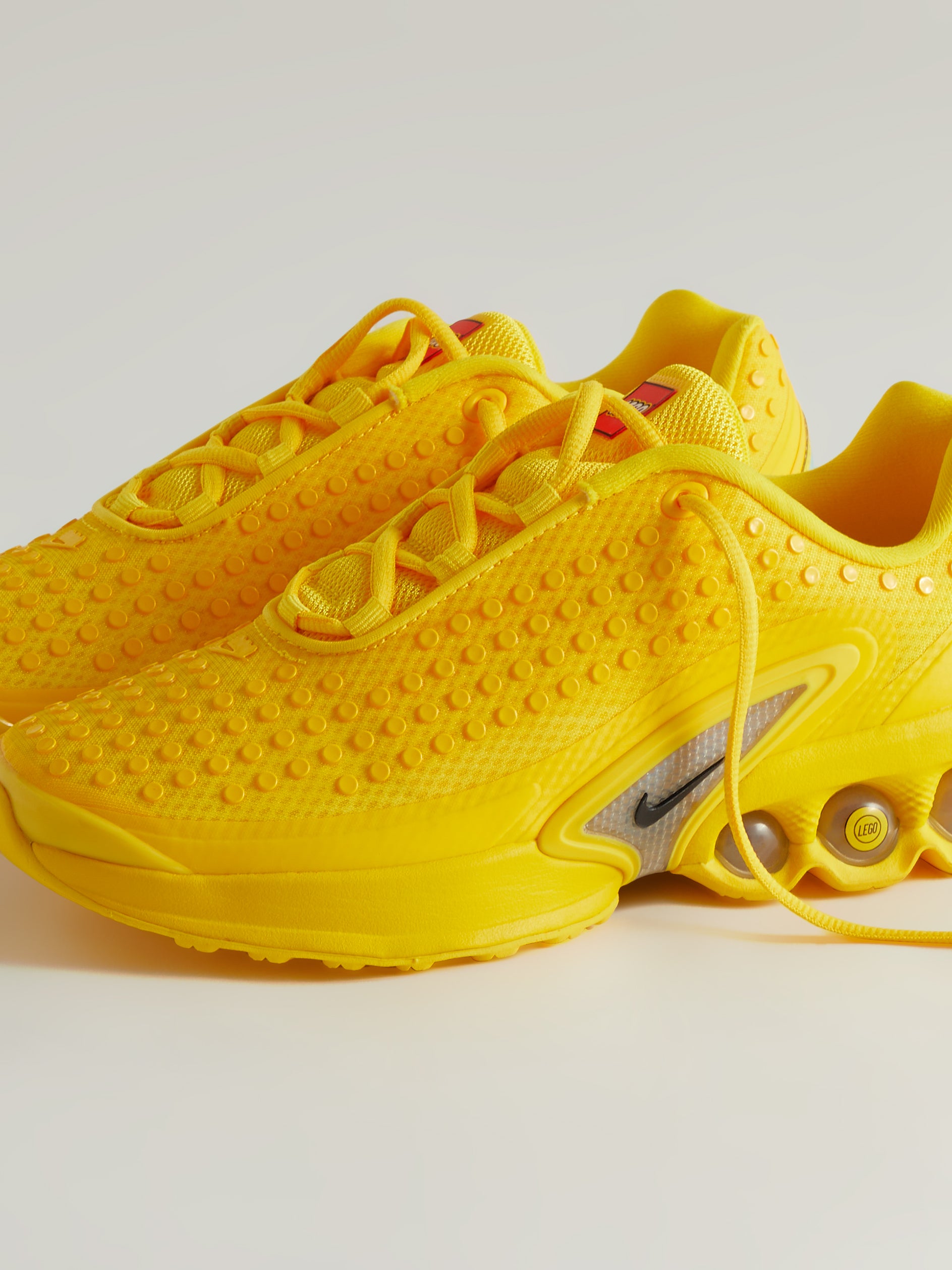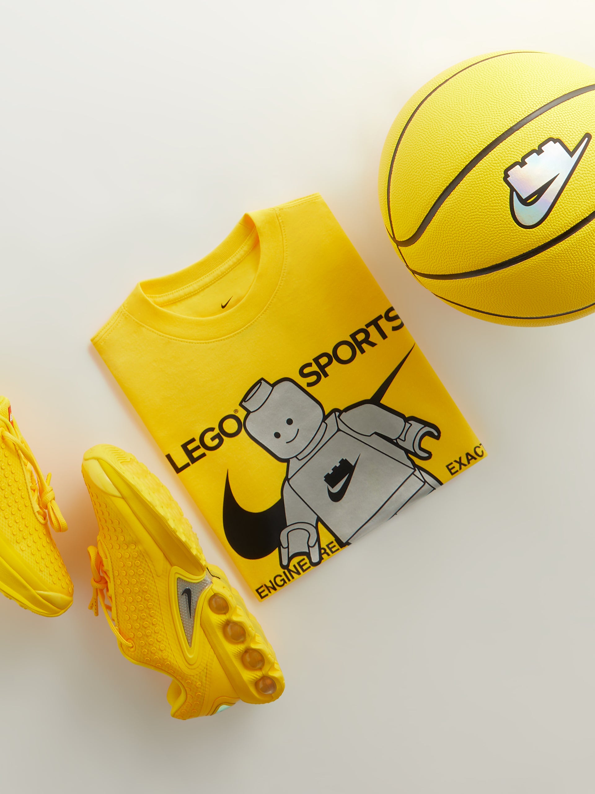 As the introduction to a three-part collaboration, The Nike and LEGO® collection showcase styles designed in gradients of Nike Tour Yellow and LEGO® Logo Yellow, along with BrickSwoosh artwork, a first-of-its-kind co-branded logo treatment. The first silhouette is the Nike x LEGO® Grade School Air Max Dn, featuring BrickSwoosh artwork at the heel, and iridescent halo finishing. With Max and LEGO® Minifigures printed on the windows, the Dynamic Air unit brings cloud-level bounce for on and off the court. This is followed by the Nike x LEGO® New Tee OxO, made from premium cotton, featuring iridescent LEGO® Minifigure and Nike Basketball artwork on the front.