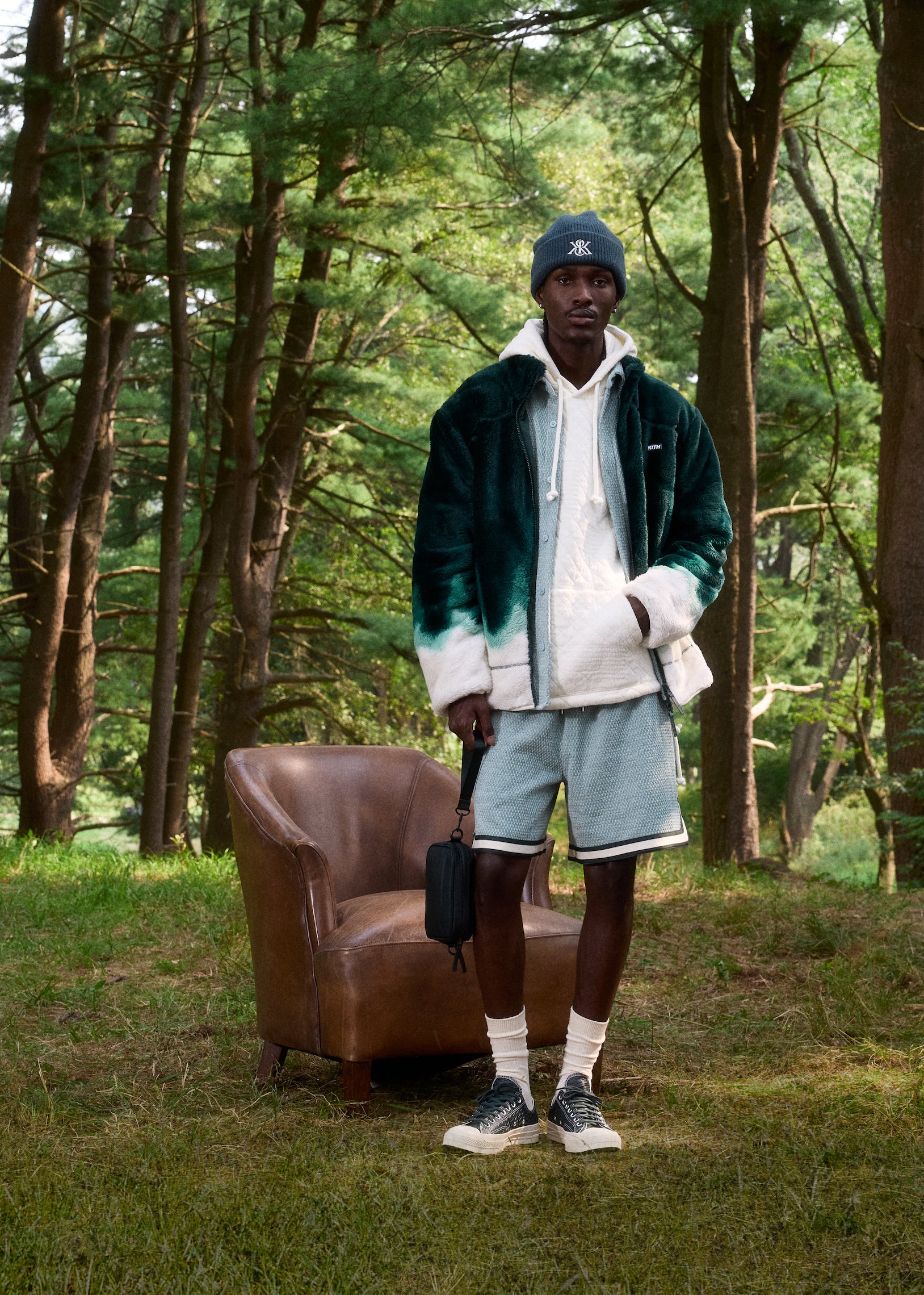 Accessories include collaborative & signature headwear, crossbody & duffle bags, totes, scarves, belts and more. Kith reprises its partnership with ’47 to bring back beanies and fitted caps executed in this season’s color palette. Kith also continues to offer its signature bucket hats, beanies, and caps ideal for any occasion. This assortment is rounded out with an offering of all-new Monogram suede duffle bags & utility crossbody bags as well as the debut of Kith-branded leather and suede belts.