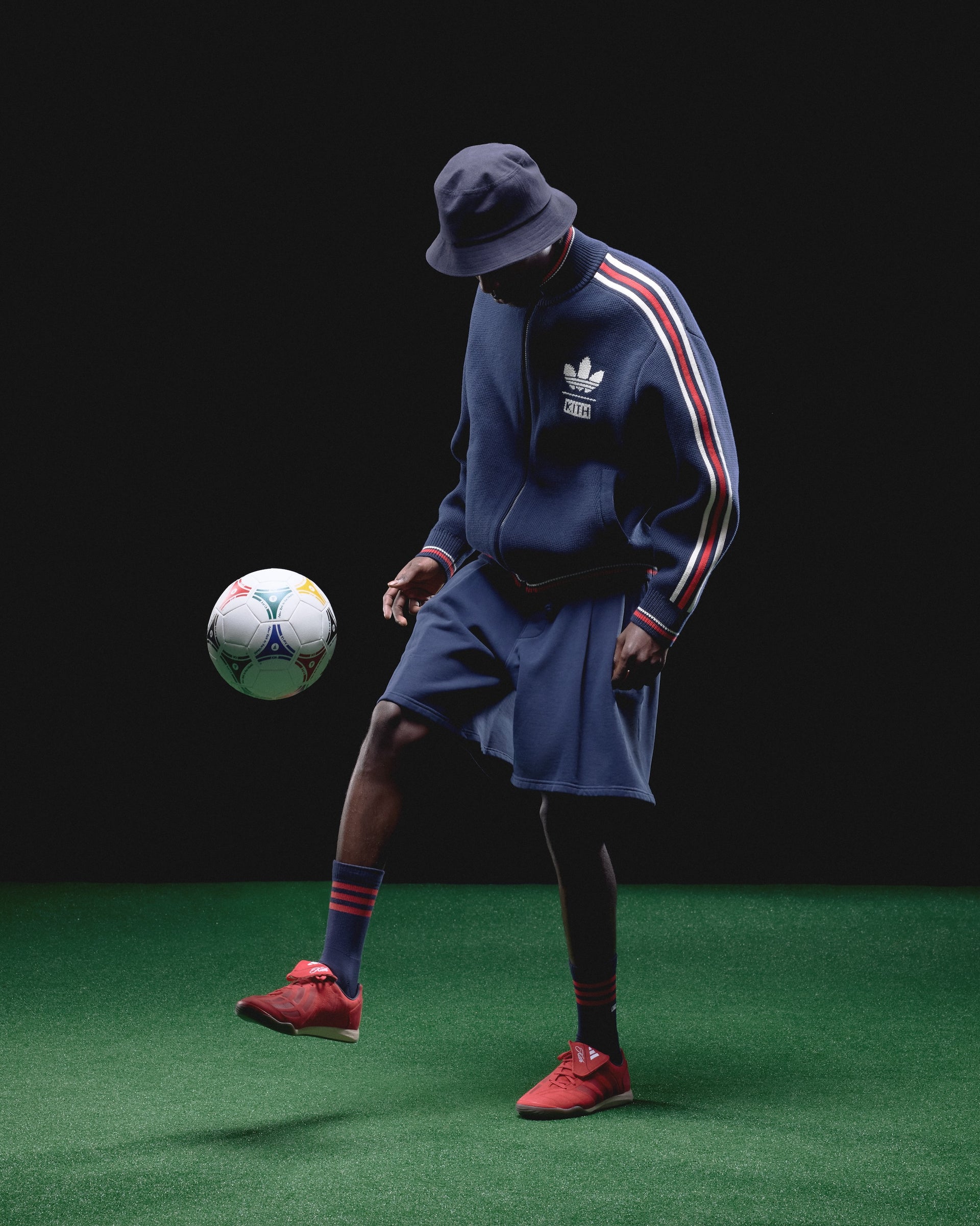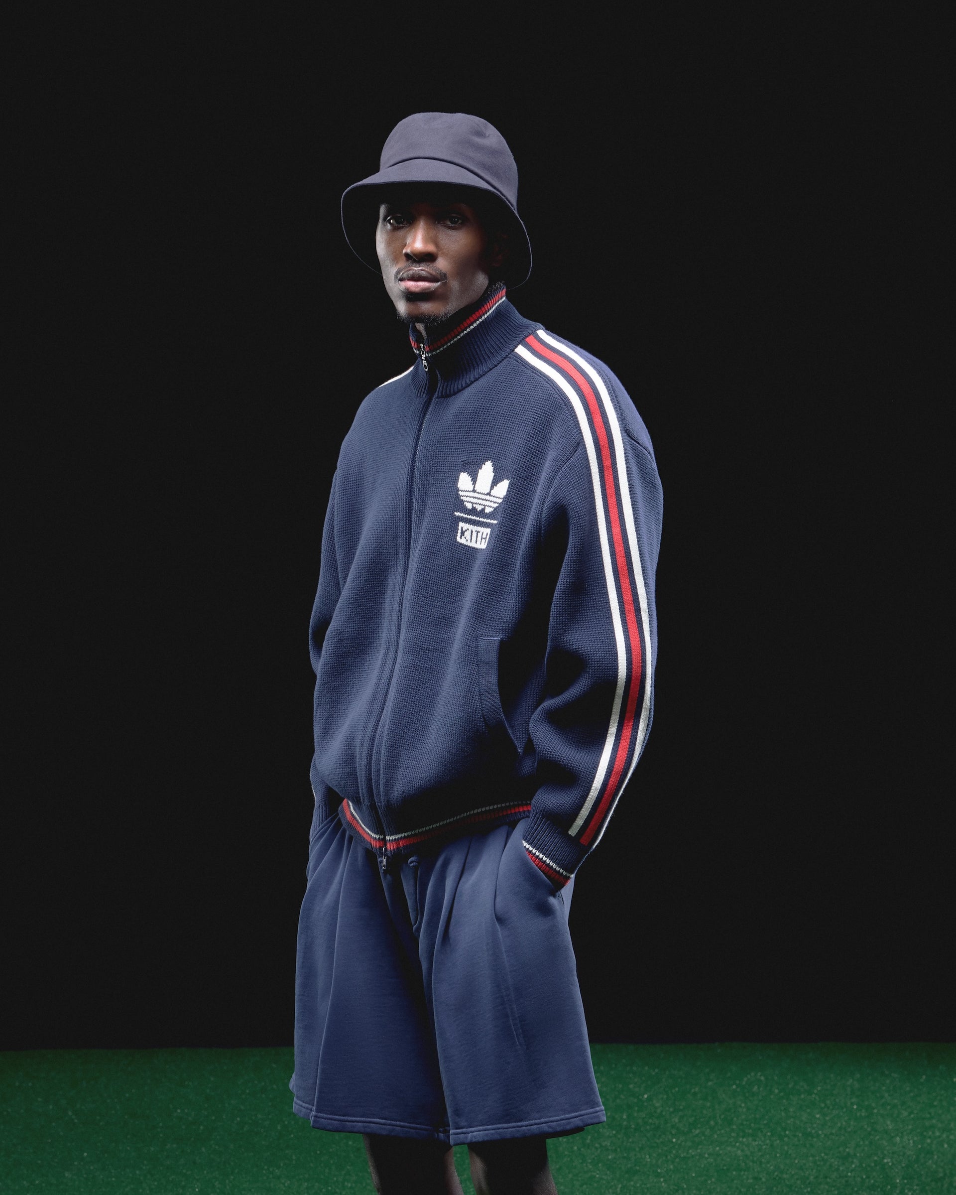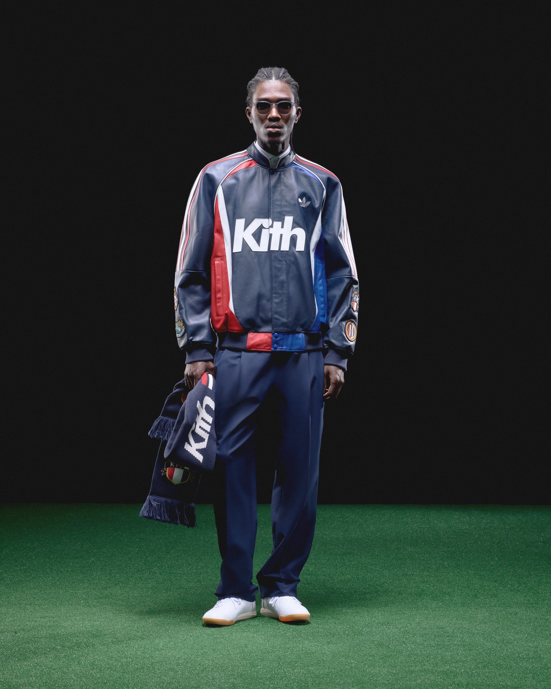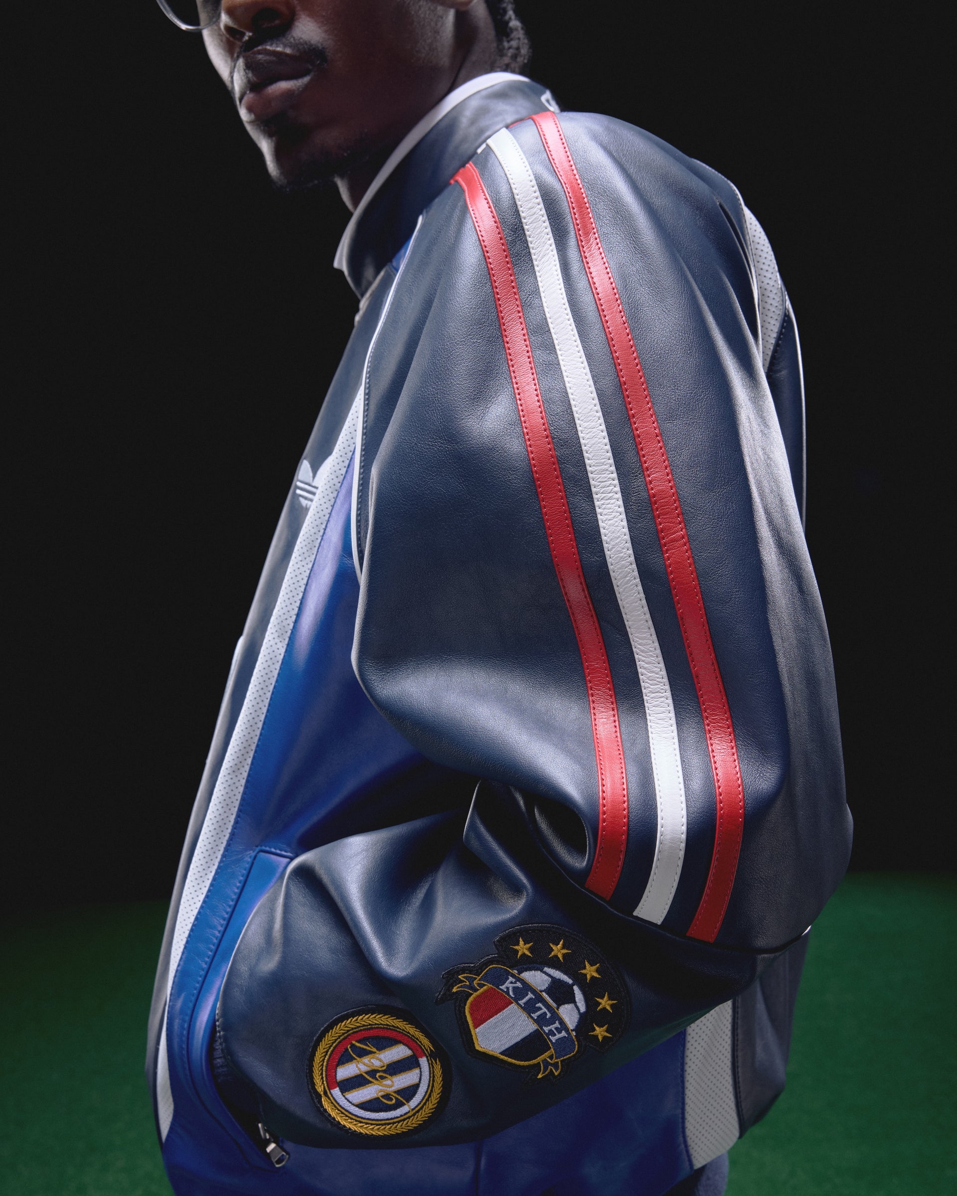 This collection comprises adidas & Kith signature silhouettes, highlighting debut co-branded logos and artwork. Explore elevated outerwear, jerseys, tracksuits, tees, and knitwear. Standouts include the Stadium Coat, Suit Jacket & Pant and Tracksuit. The Stadium Coat is an elevated yet relaxed silhouette crafted from premium leather. Details include signature adidas stripes along the back & hood as well as a built-in wraparound belt. The Suit Jacket & Pant, based on Kith’s Julius Blazer and Kylan Pant, epitomizes the intersection of luxury and football. Made from a premium wool-polyester blend, this suit features a double-breasted jacket and double-pleated trousers. The Kith for adidas Football Tracksuit is inspired by adidas’ iconic tracksuit. The duo came together to reimagine the style with a custom knit execution & piping details along the front. The set is offered in Beige & Green executions and is complete with a co-branded label.