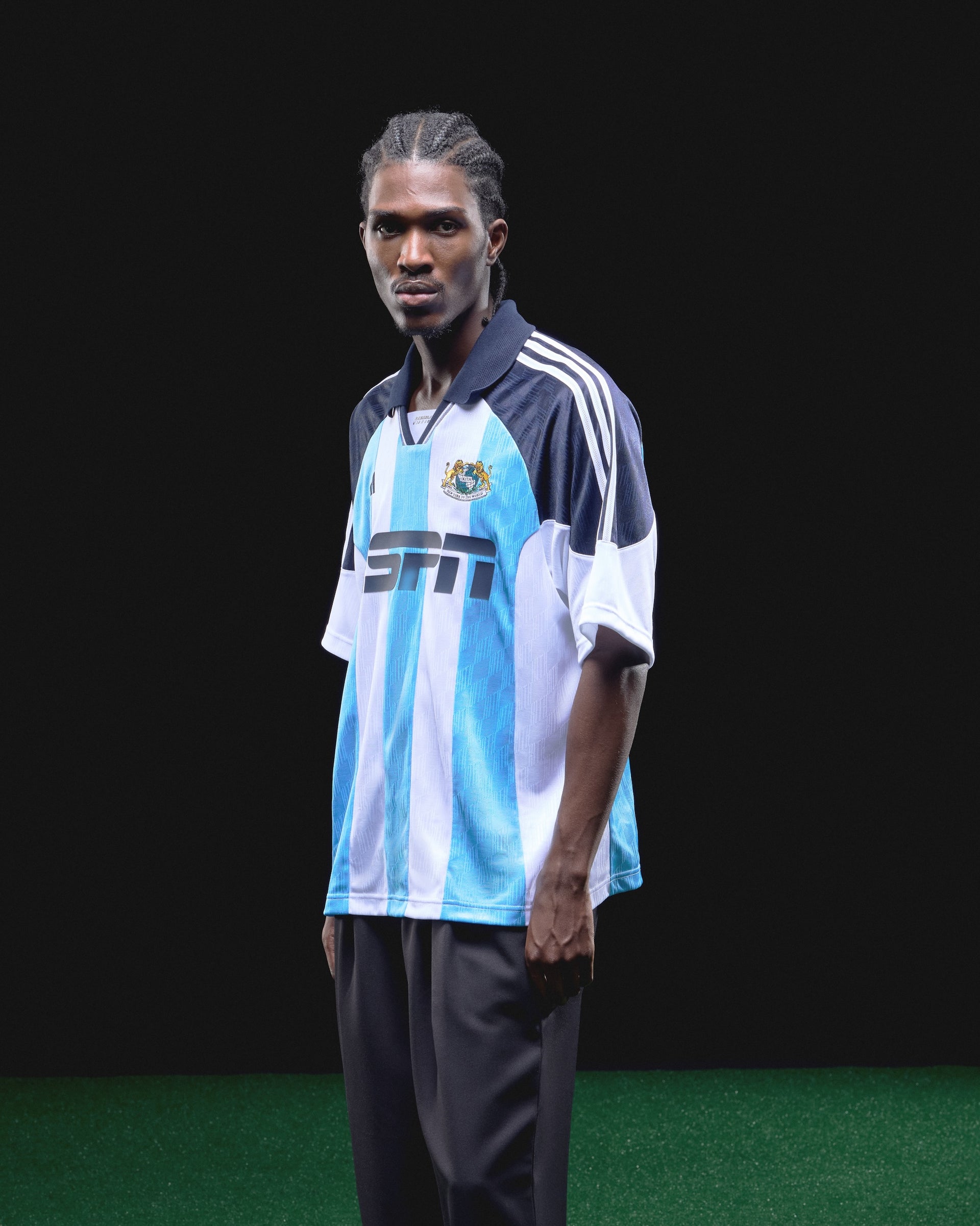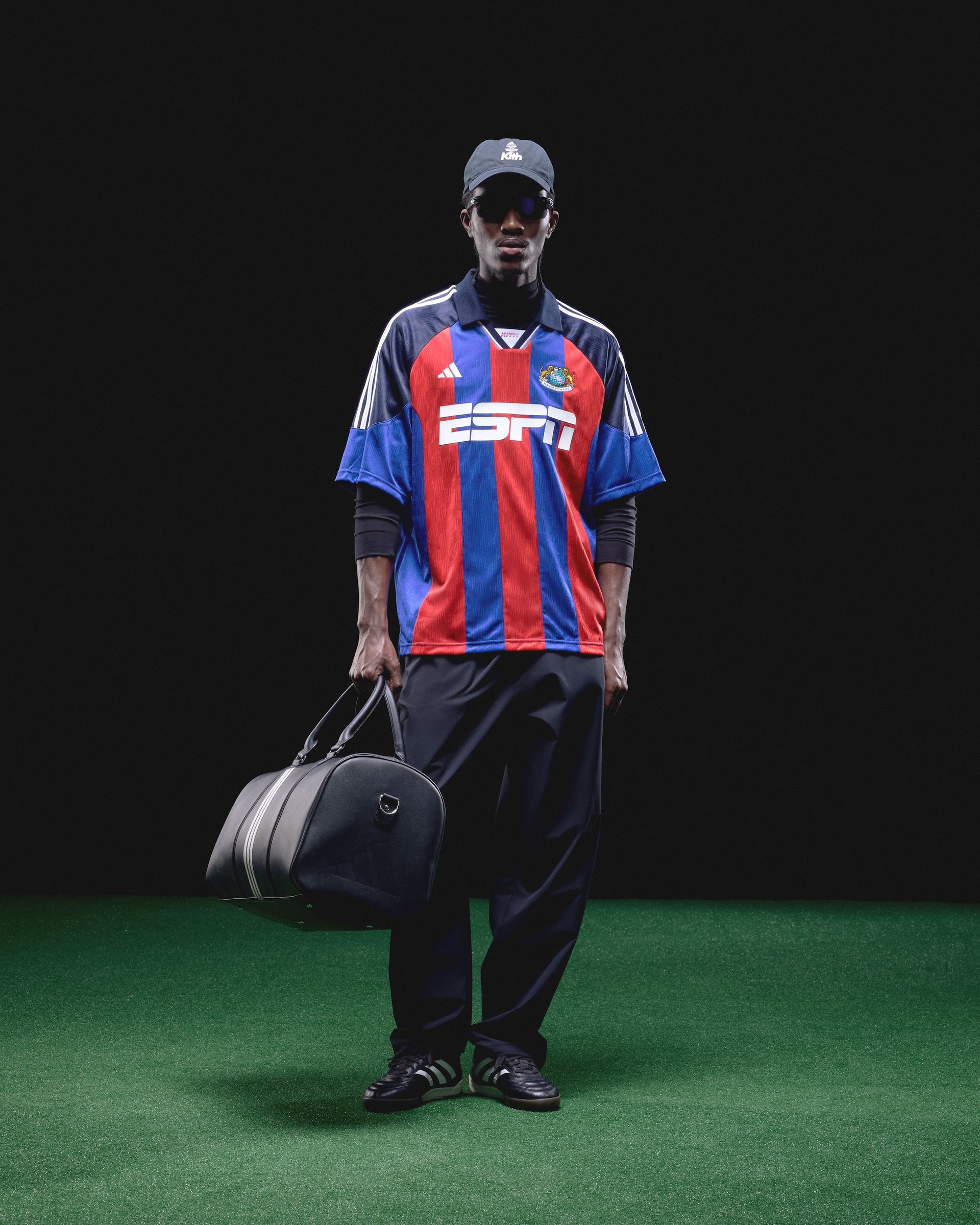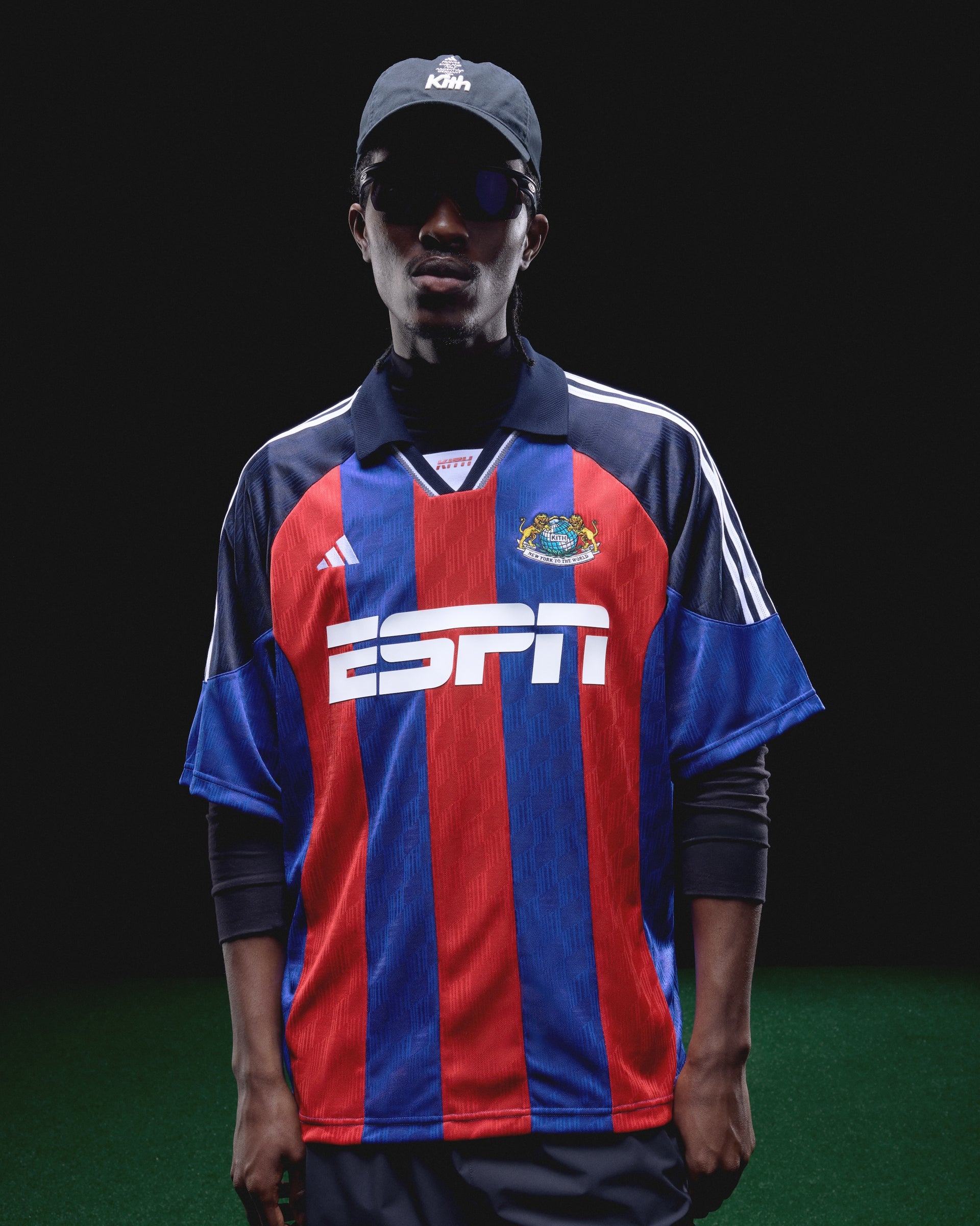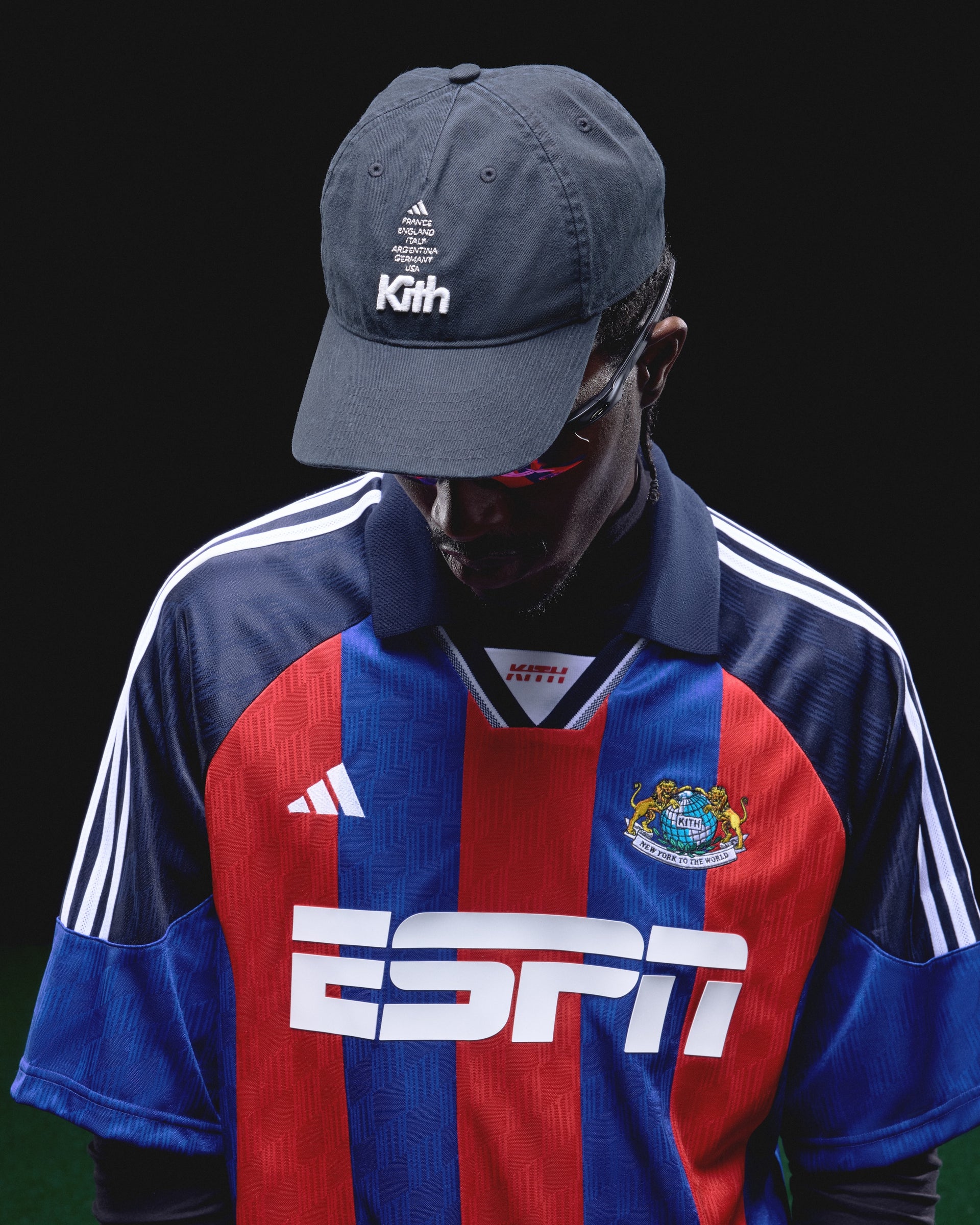 Kith and adidas collaborated with ESPN on custom soccer jerseys and an elevated jacket. The Kith & adidas Football for ESPN Jersey, made from lightweight polyester, has a color-blocked composition and showcases italicized Kith Monogram artwork as well as Kith, adidas and ESPN branding. The Hybrid Trench Coat, crafted from genuine Nappa leather, features striped detailing along the sleeves, a zipped interior and a multi-colored ESPN-branded satin lining.