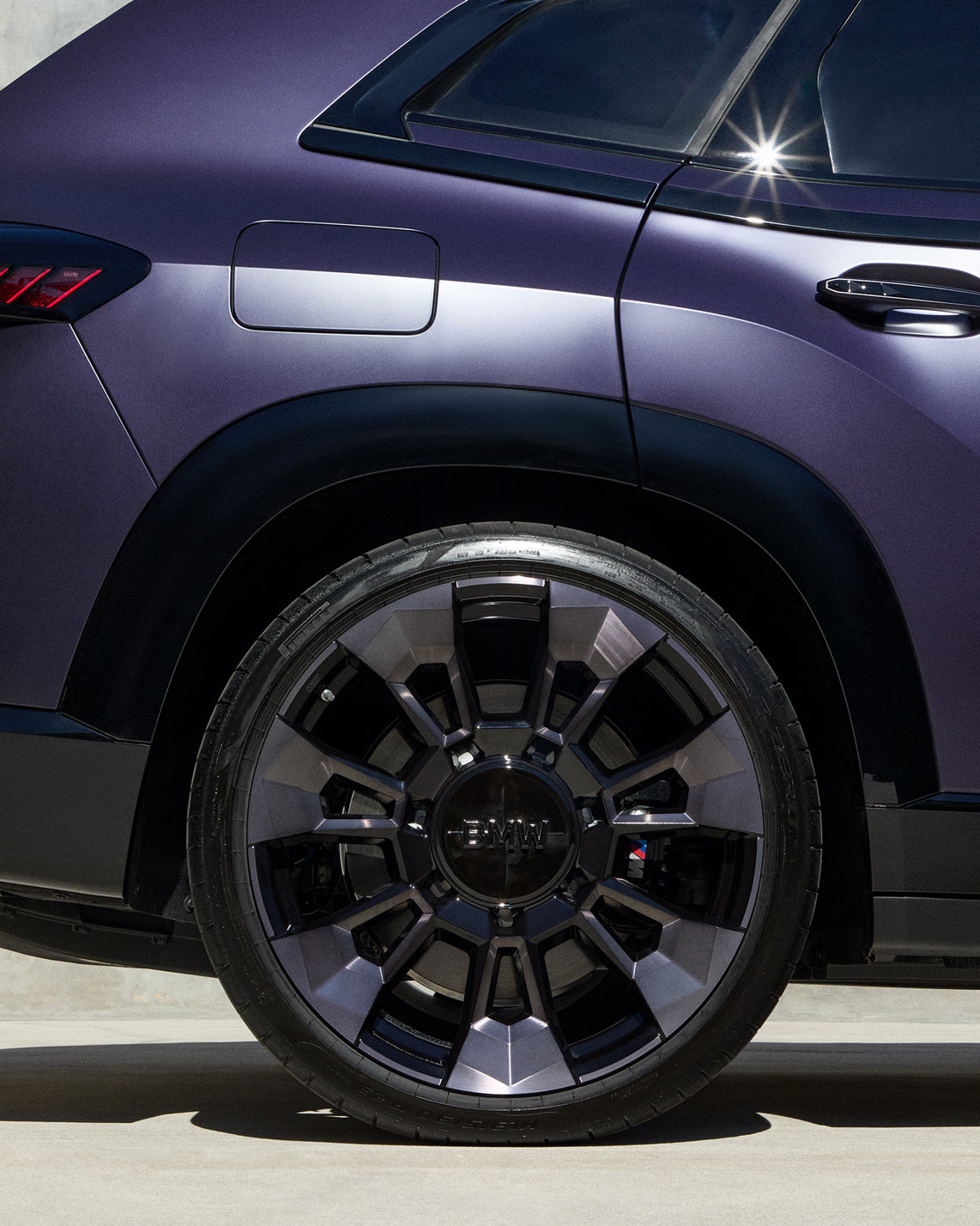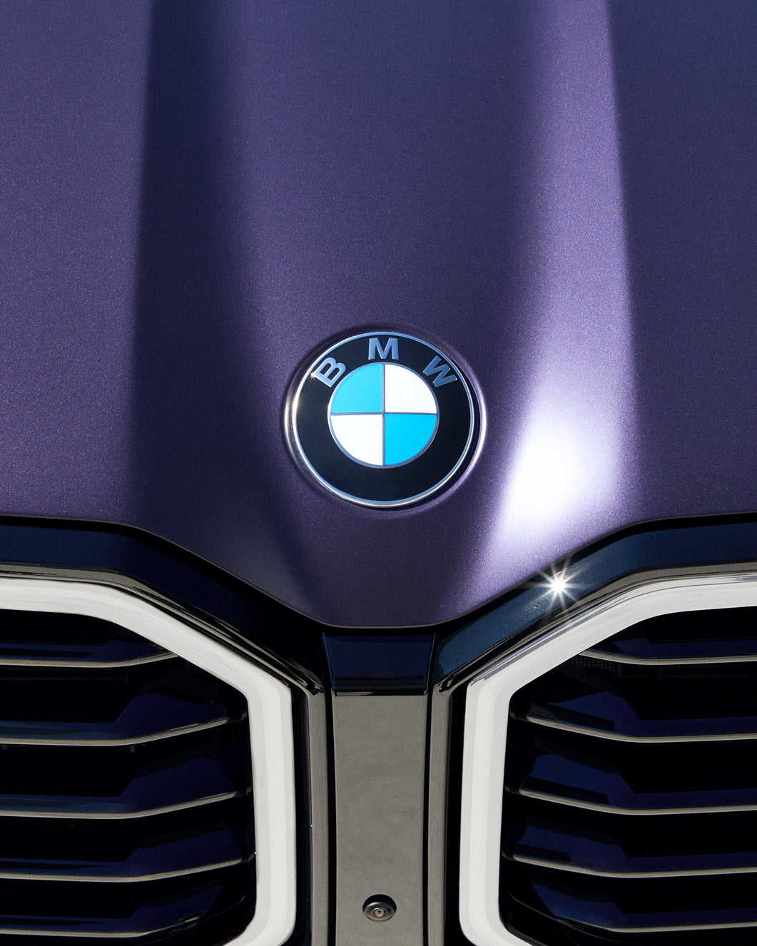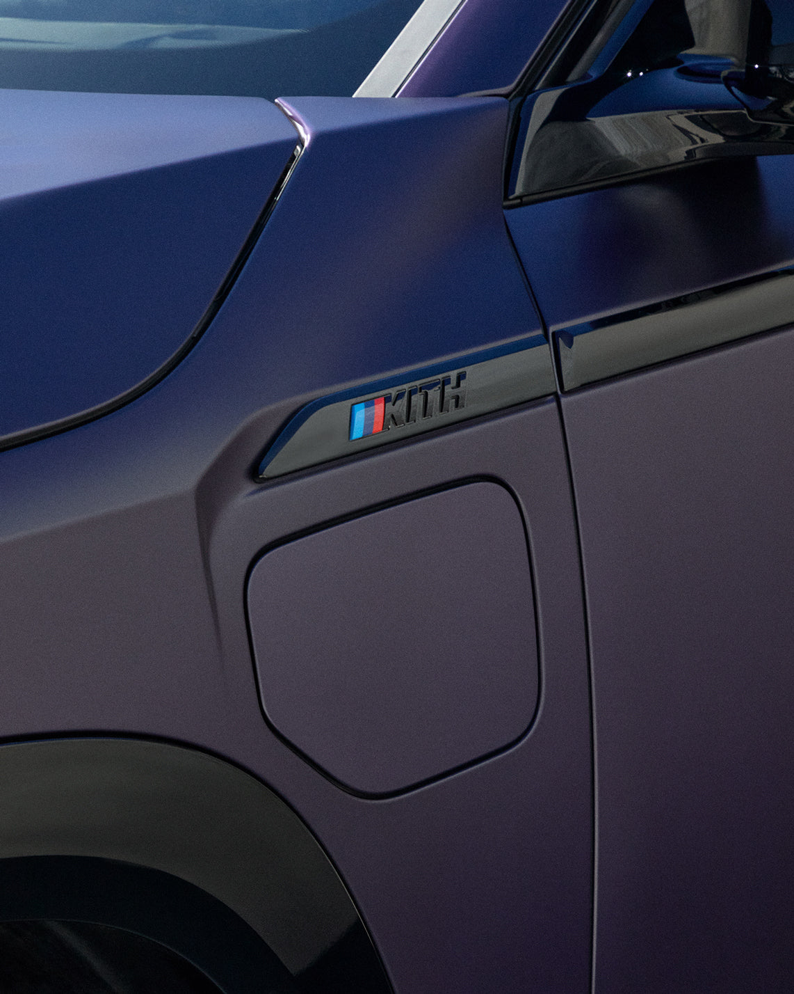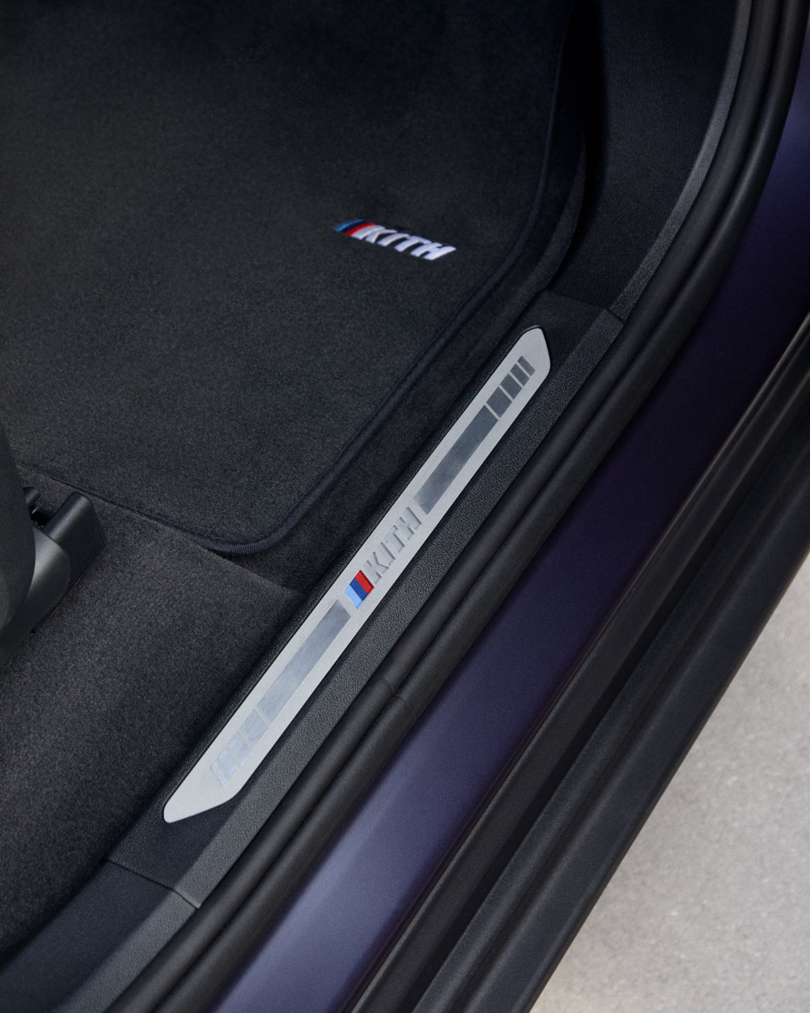 Inspired by the Techno Violet color of the 1981 BMW M1 E26 by Ronnie Fieg, we developed a new paint color exclusively for this partnership—Frozen Techno Violet. This evolution of Techno Violet highlights the past-and-present connection to the BMW M1 when seen alongside the Ronnie Fieg’s M1. The rims are also painted with a special clearcoat containing purple color pigments. Lastly, the shade is used on the custom Kith BMW M badge on the tailgate, while classic colors are applied to the illuminated 3D Kith badge on the accent band panel. The violet theme is further enhanced by custom lighting effects, allowing the kidney grilles and headlights to glow purple. Beneath the headlights are custom Kith BMW M LED logos that share the purple hue, as do the hockey stick side panels, which fully illuminate with repeating Kith logos.