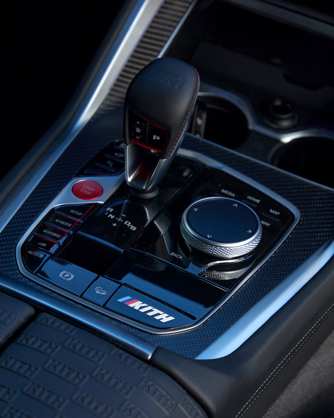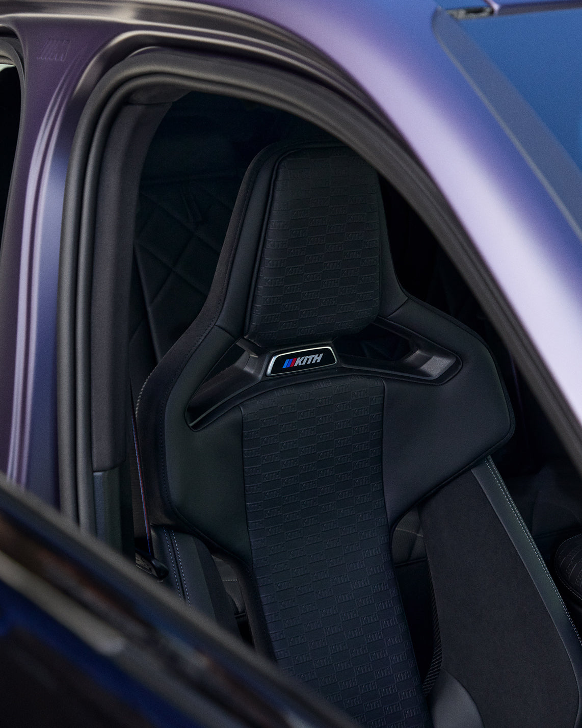 The chassis dimensions have been increased in width by 40mm on each axle with wheel spacers and lowered by 30mm on the front axle and 35mm on the rear axle. The front seats have been replaced with fully carbon-motorsport seats, featuring Kith monogram-embossed BMW Individual black Merino leather and illuminated headrest badges. This custom leather is also applied throughout the interior, including the armrest, backseats, and backseat pillows.