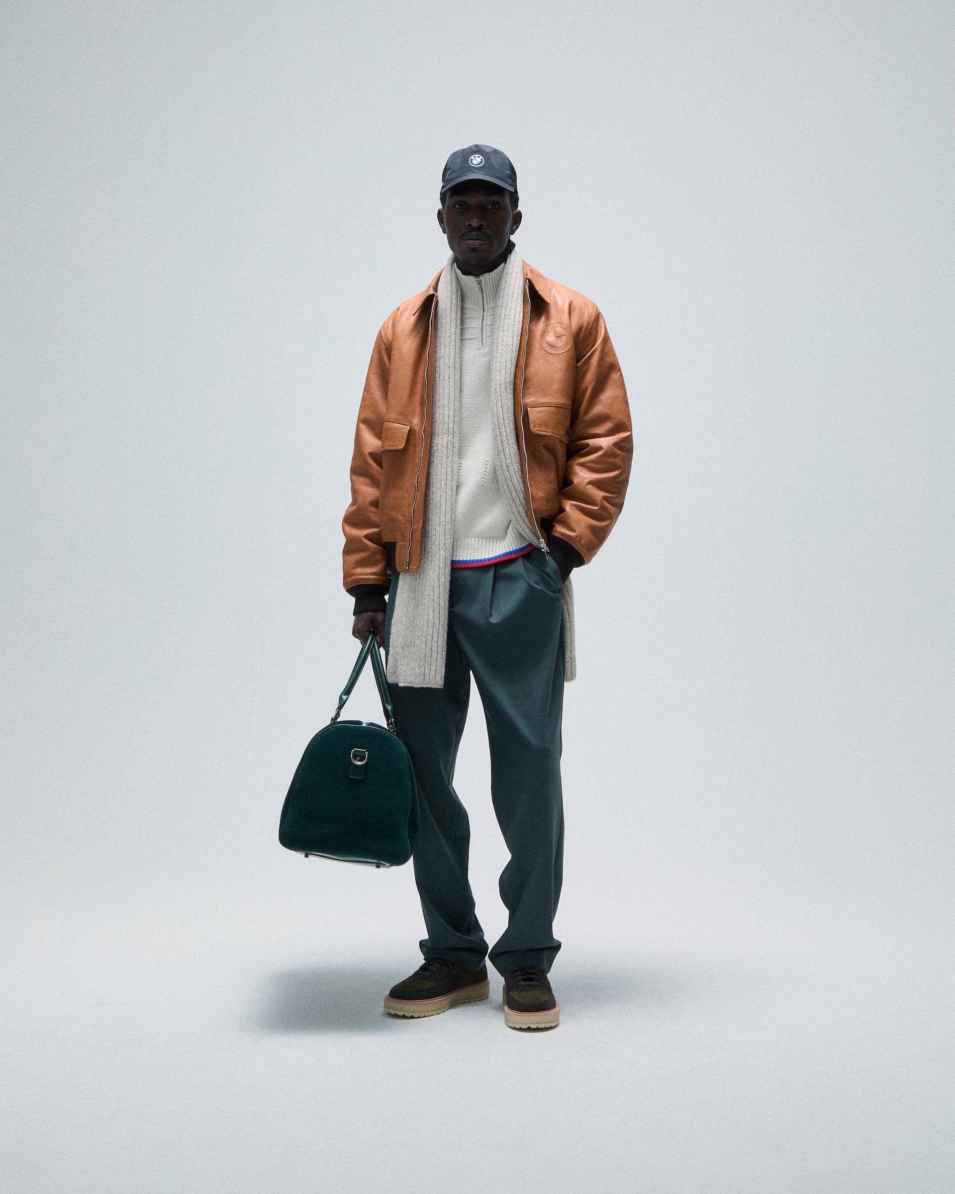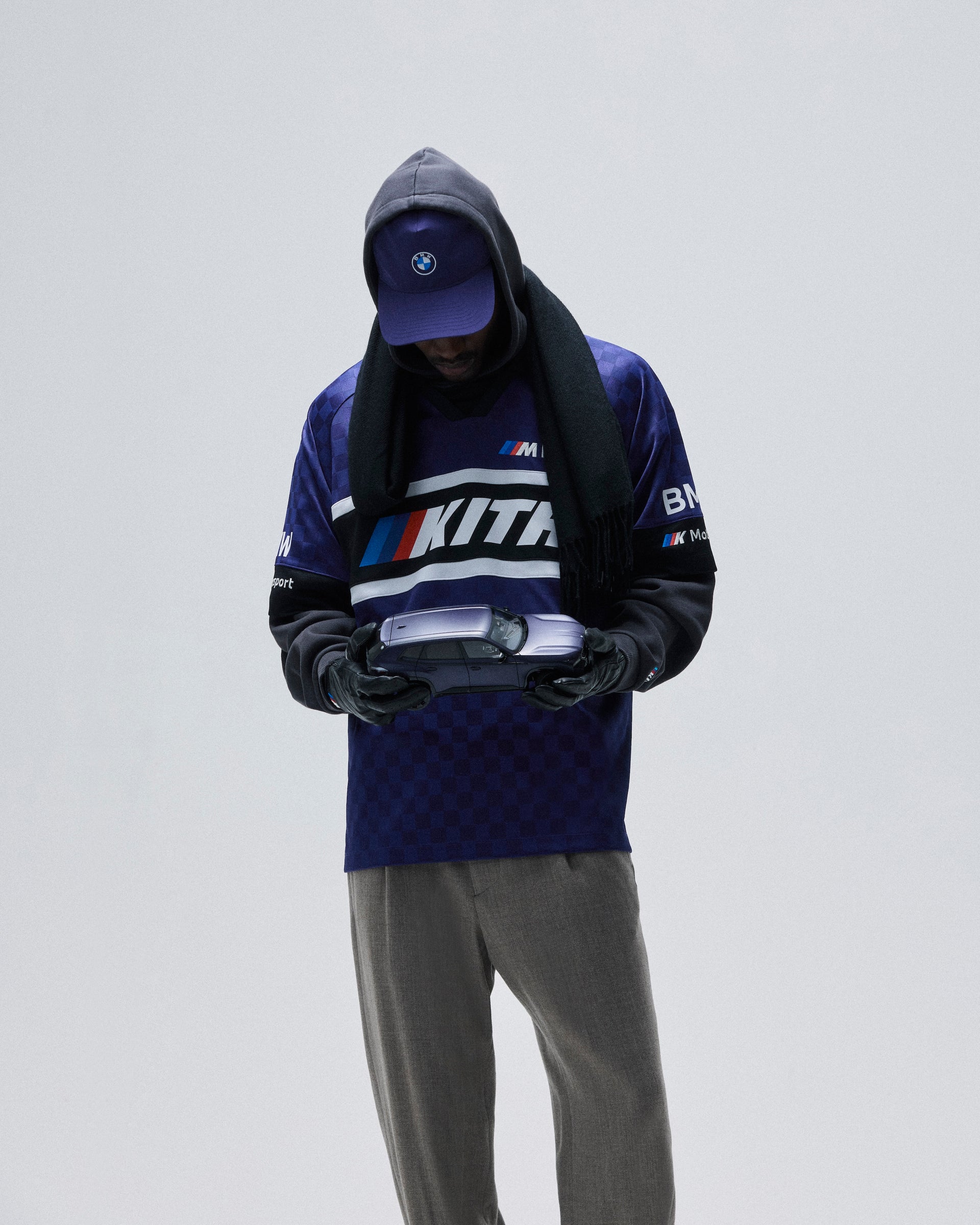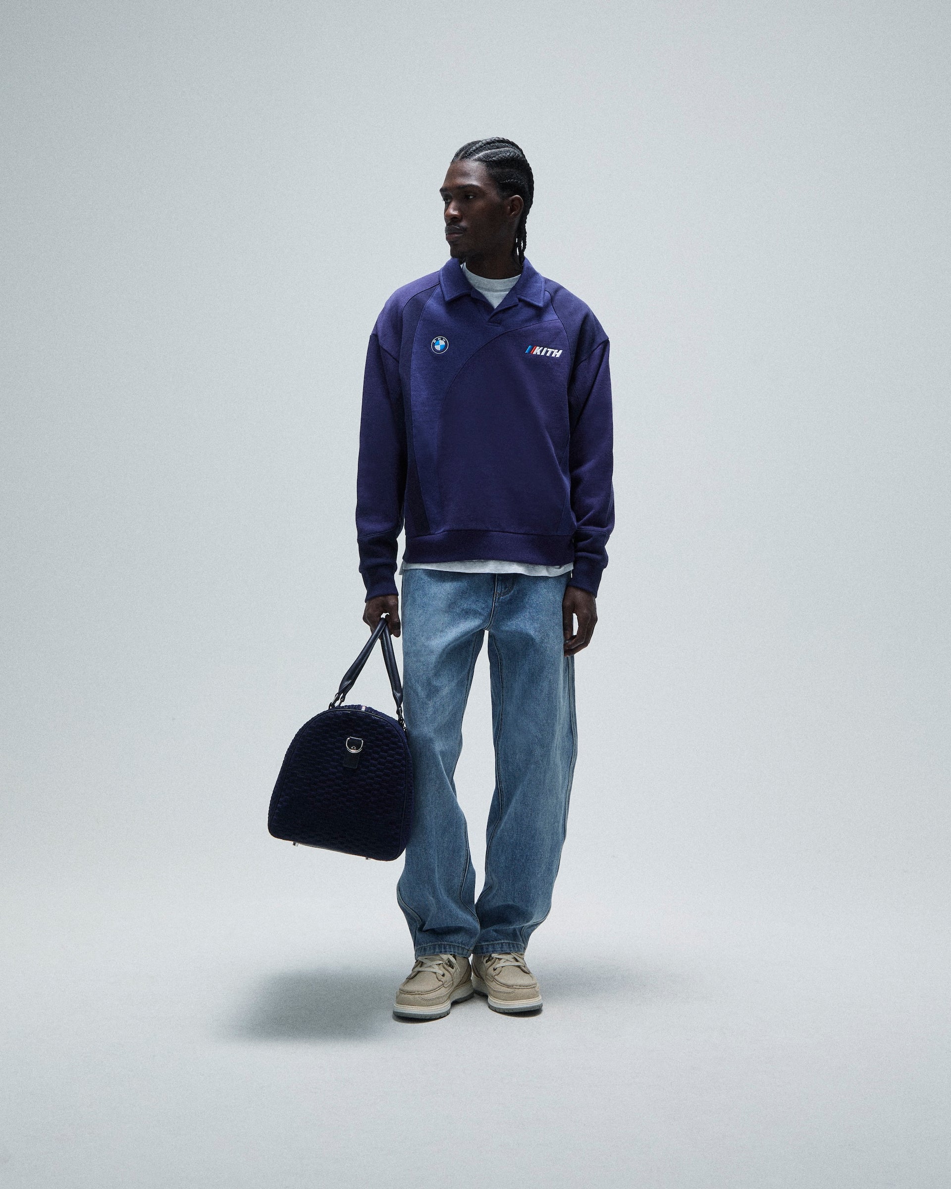 A large selection of accessories inspired by the BMW lifestyle are also offered. The headwear offering comprises signature and collaborative styles. Signature beanies and caps are updated with co-branded Kith for BMW M1 and Roundel logos. Fitted 59FIFTY caps made in partnership with New Era complete the offering. Car-centric items include leather driving gloves & key rings as well as car plates, microfiber towels and floor mats. This accessory collection also debuts suede Kith for BMW duffle bags and a camera bag.