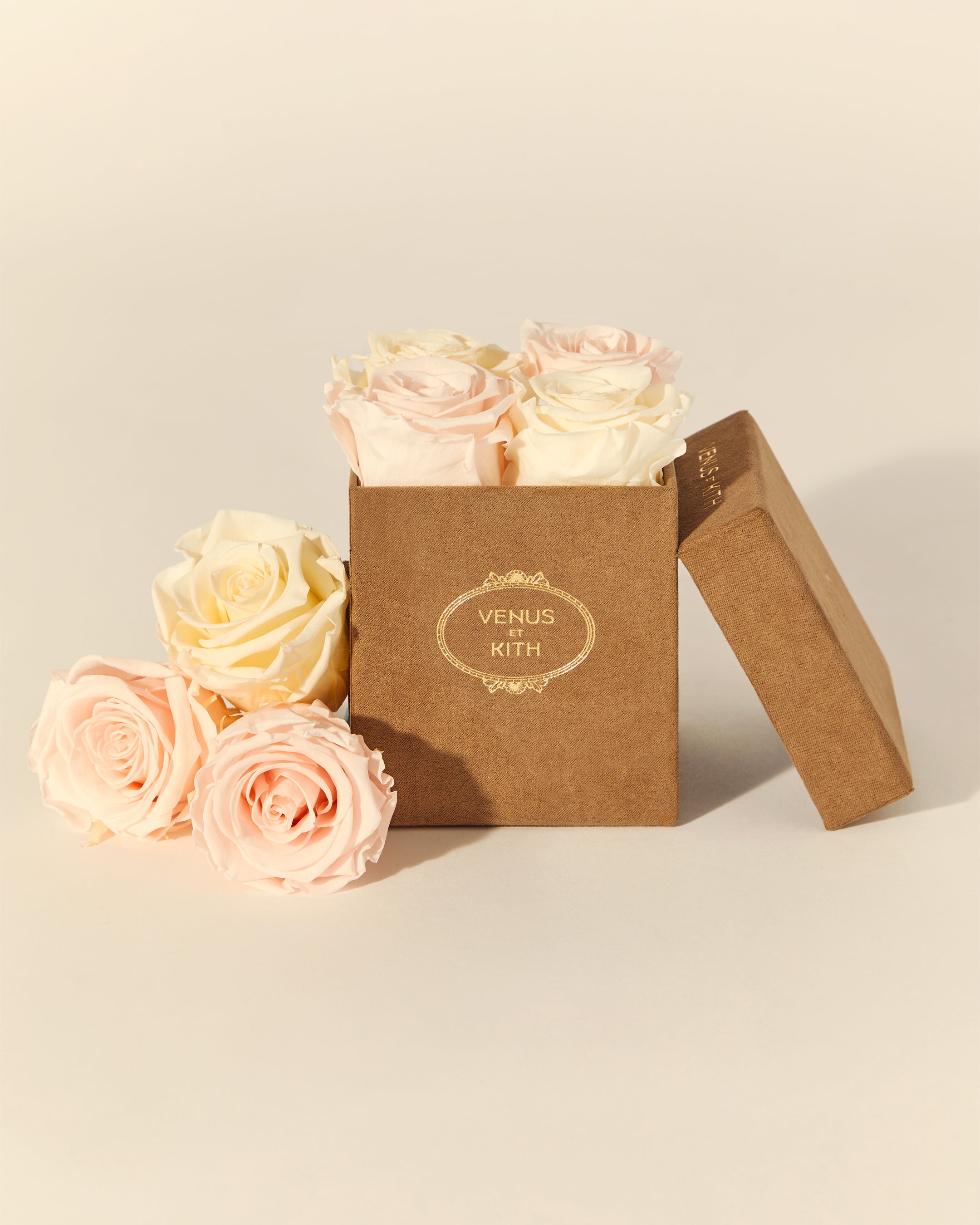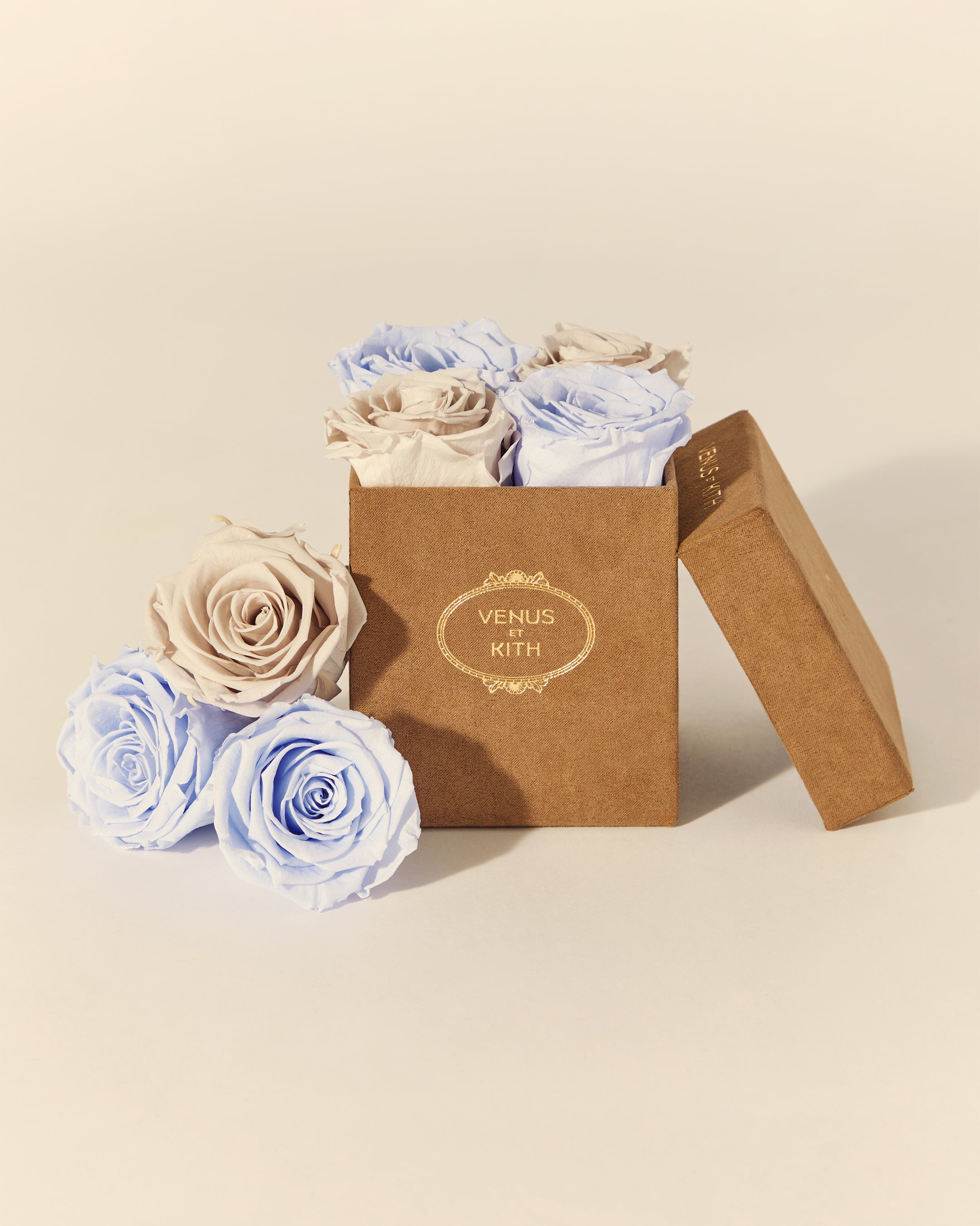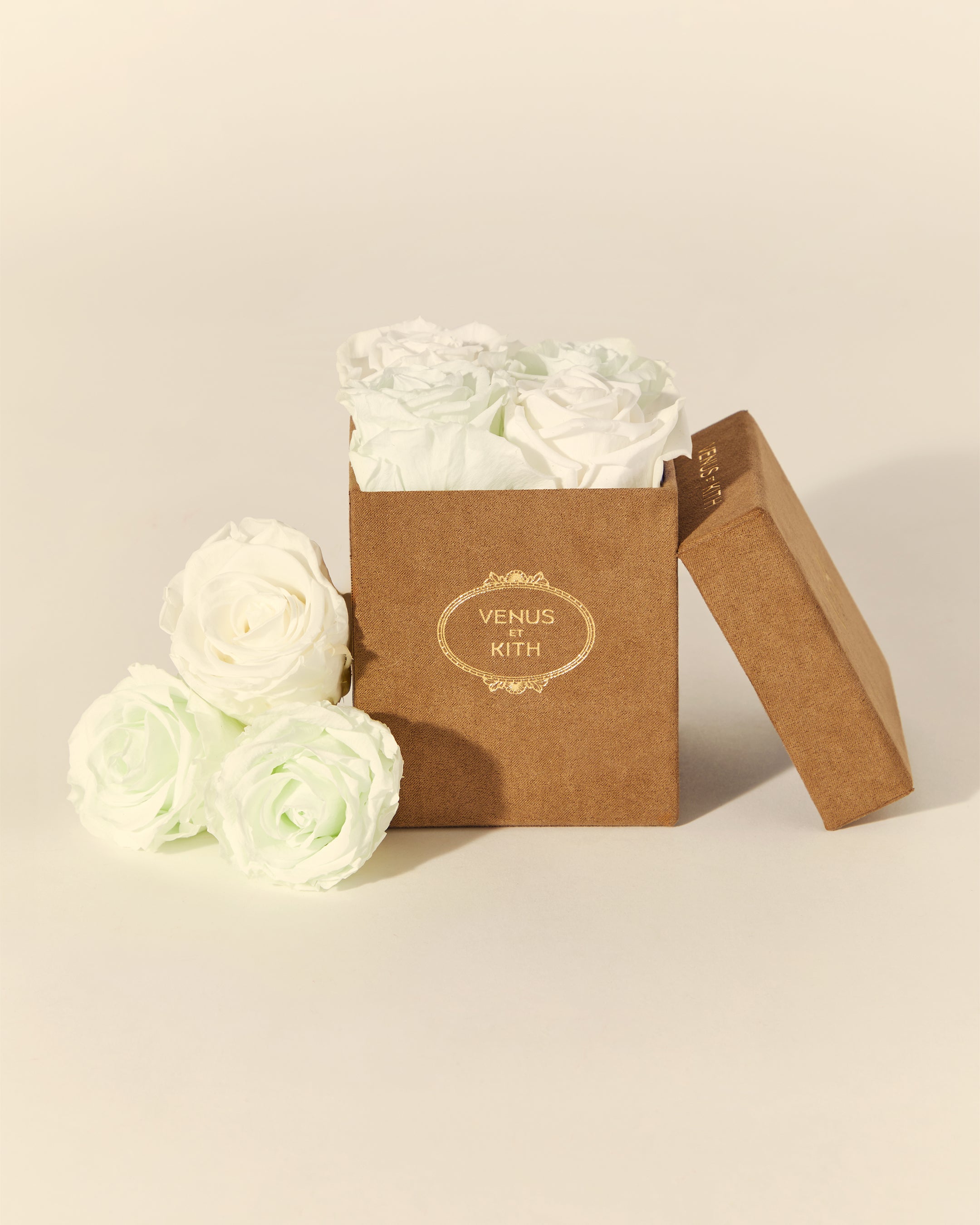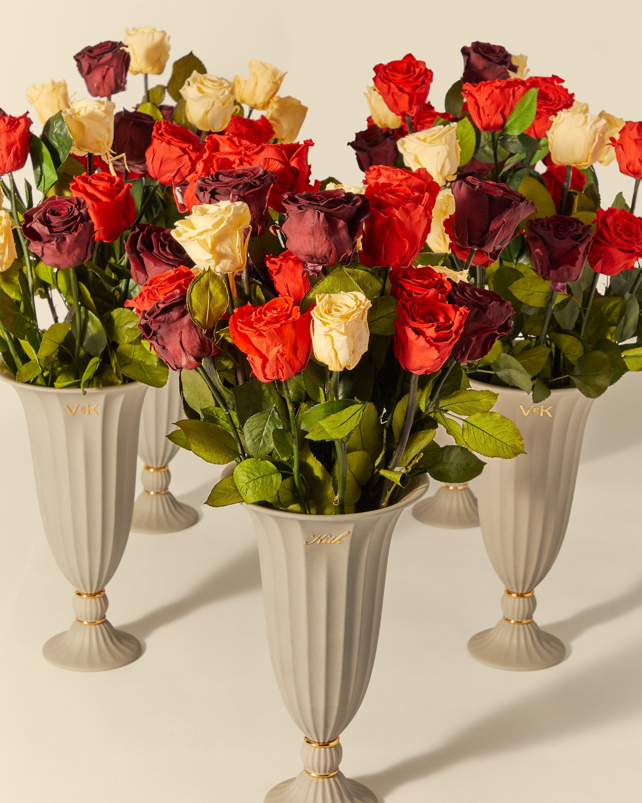 The Kith for Venus et Fleur Le Petit features four Venus et Fleur Eternity® Roses expressed in colorways inspired by global Kith Flagships—Paris, Toronto, New York, Miami, Los Angeles and Hawaii. The roses are packaged in a brown suede hat box, complete with custom gold co-branding. Complementing the Le Petit offering is the Kith for Venus et Fleur Aphrodite Porcelain Vase—a dozen long-stemmed Eternity® Roses presented in a custom porcelain vase that showcases a collaborative ‘Venus et Kith’ logo. Each Eternity® Rose is specially treated to last a year long.