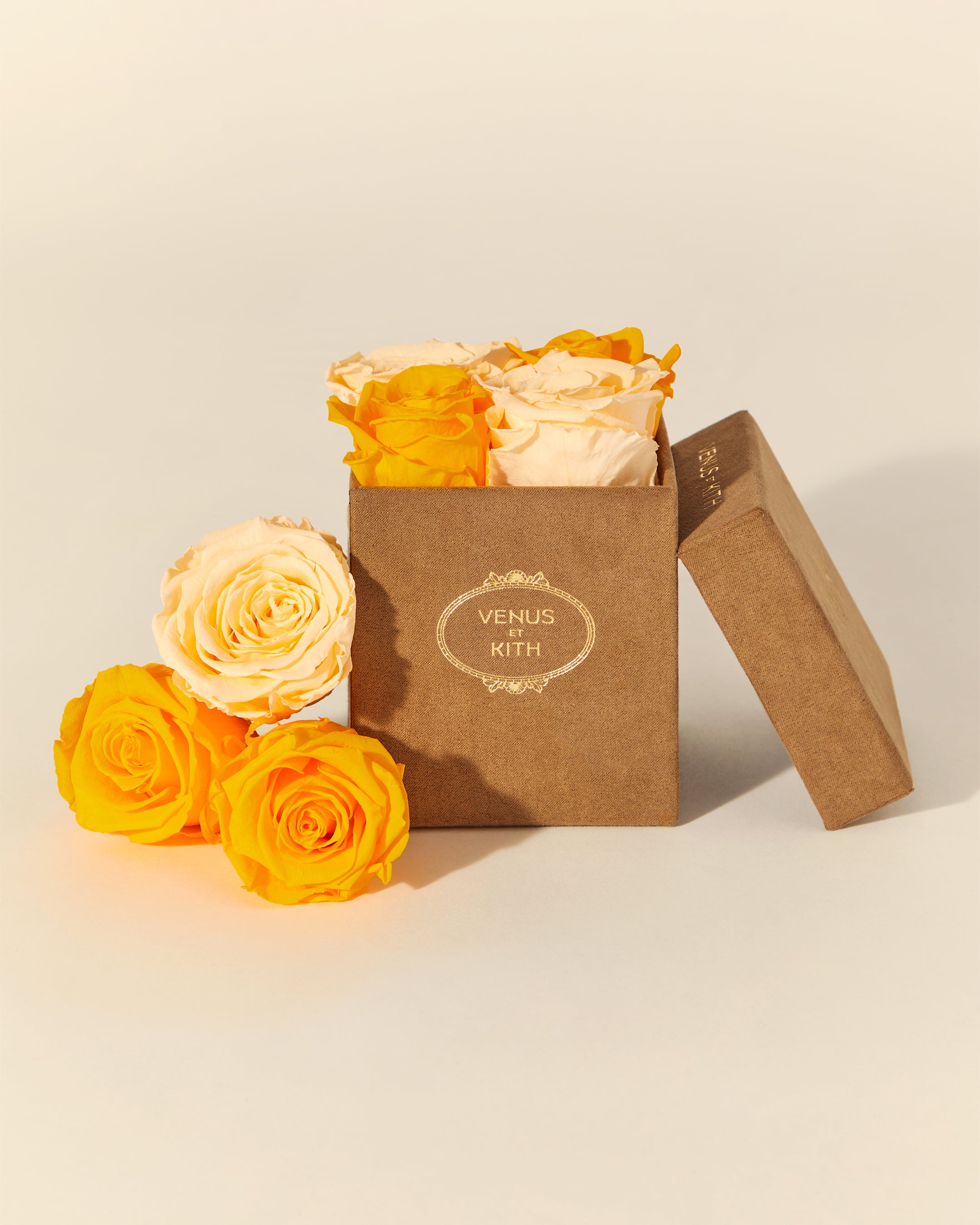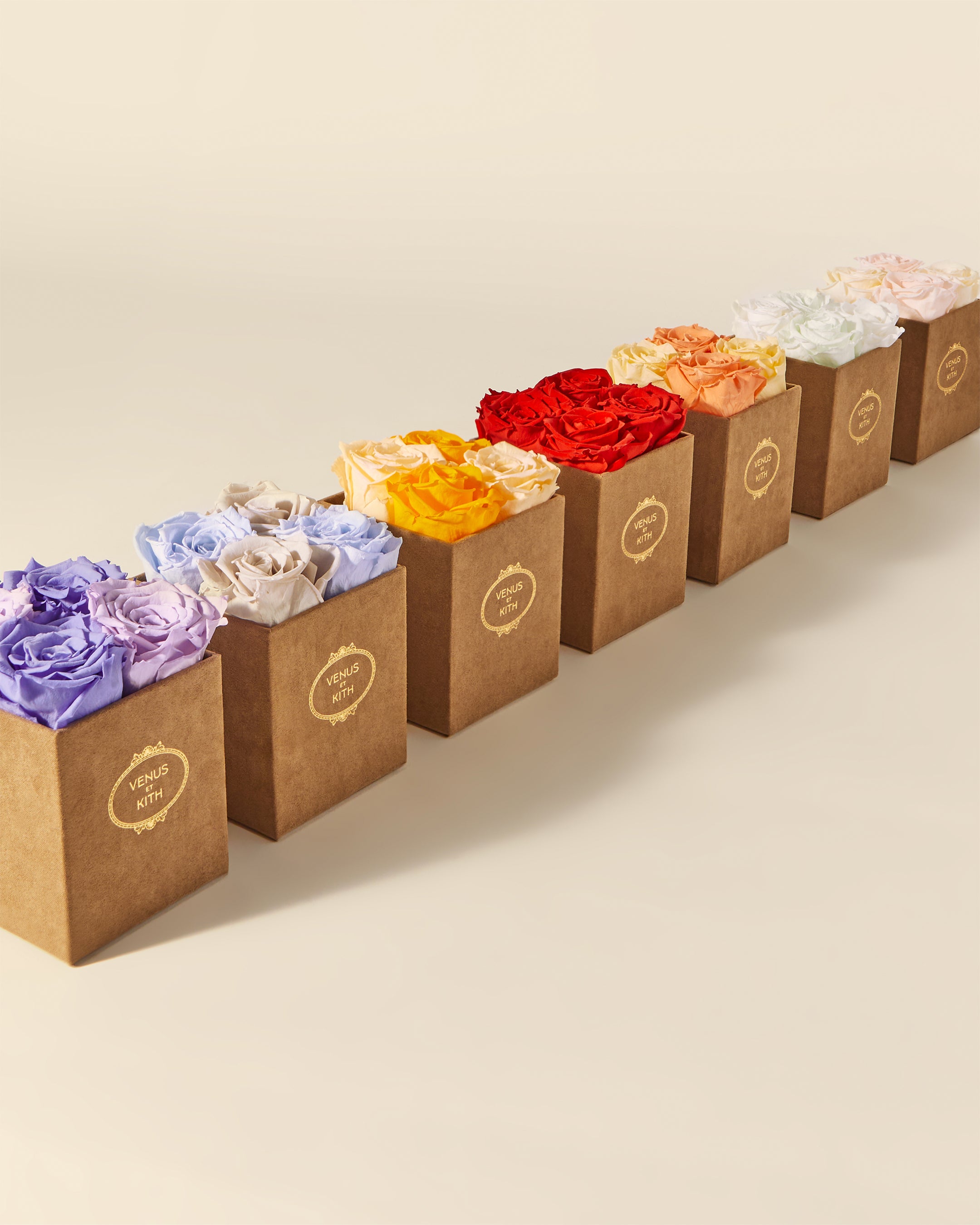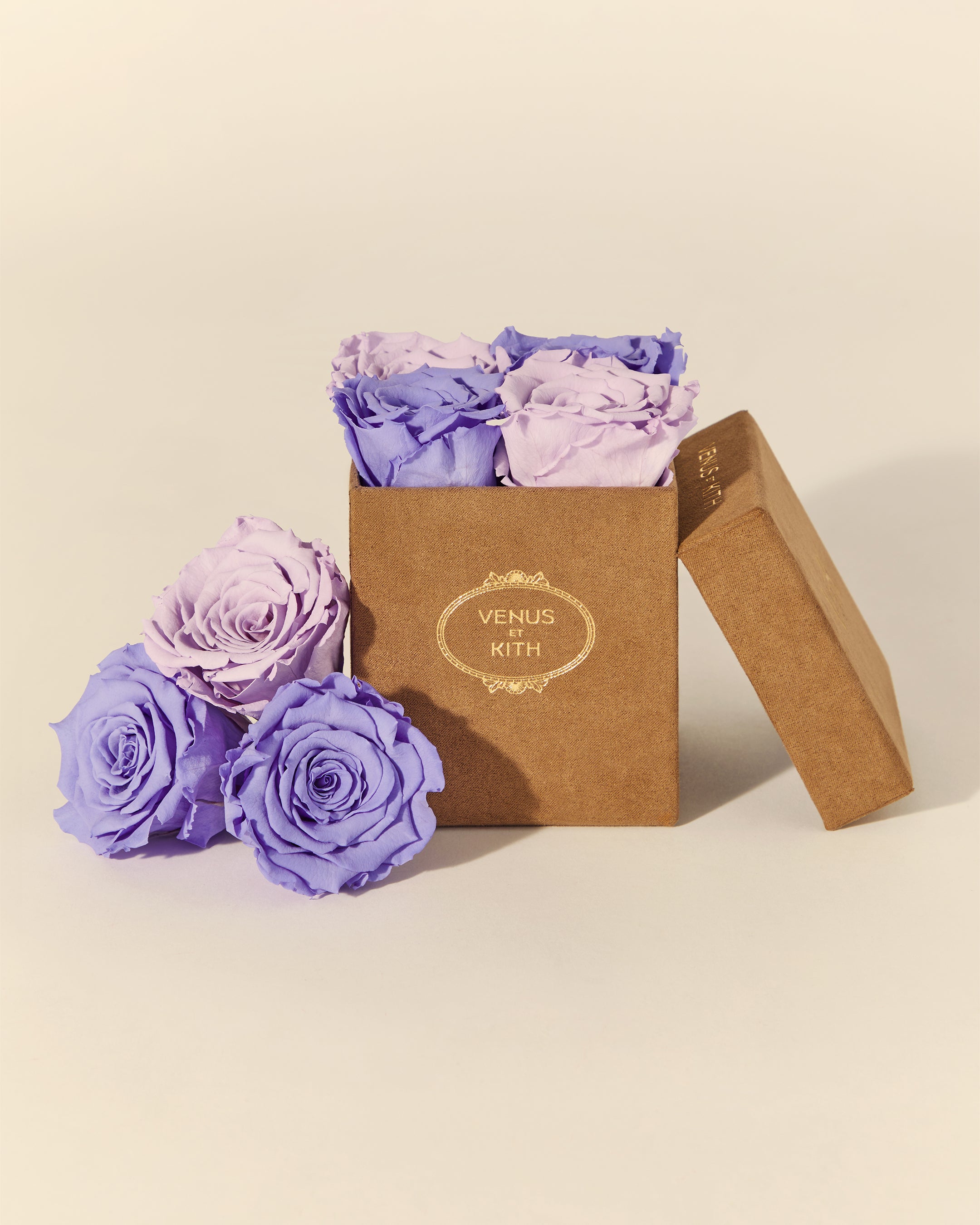The Kith for Venus et Fleur Le Petit features four Venus et Fleur Eternity® Roses expressed in colorways inspired by global Kith Flagships—Paris, Toronto, New York, Miami, Los Angeles and Hawaii. The roses are packaged in a brown suede hat box, complete with custom gold co-branding. Complementing the Le Petit offering is the Kith for Venus et Fleur Aphrodite Porcelain Vase—a dozen long-stemmed Eternity® Roses presented in a custom porcelain vase that showcases a collaborative ‘Venus et Kith’ logo. Each Eternity® Rose is specially treated to last a year long.