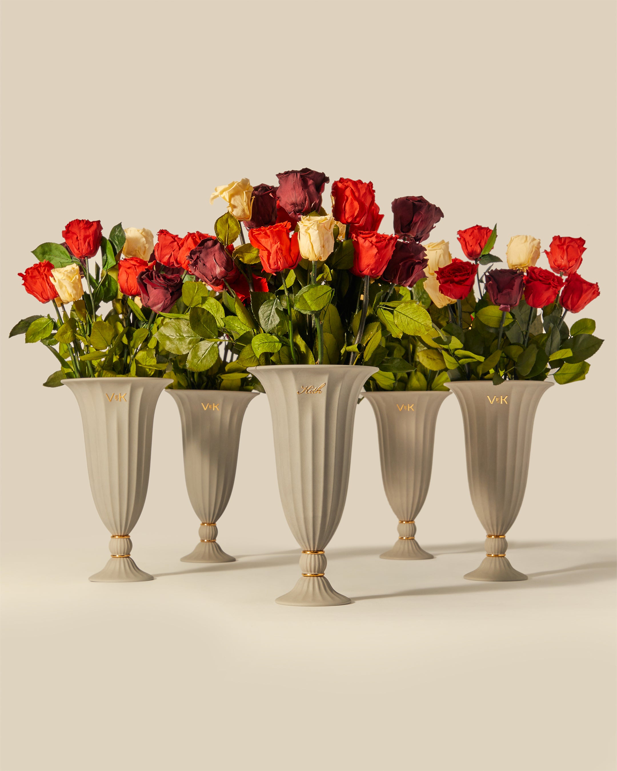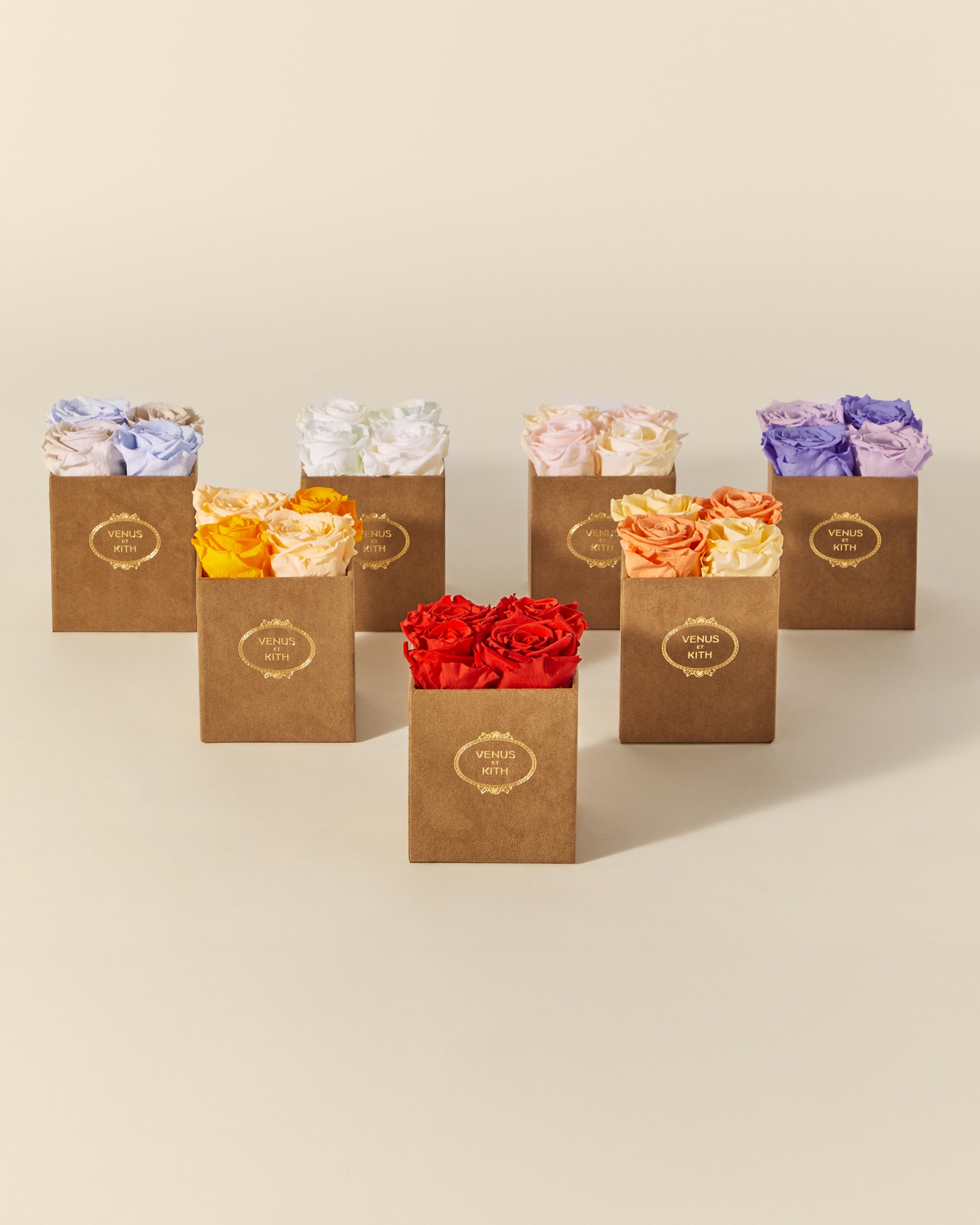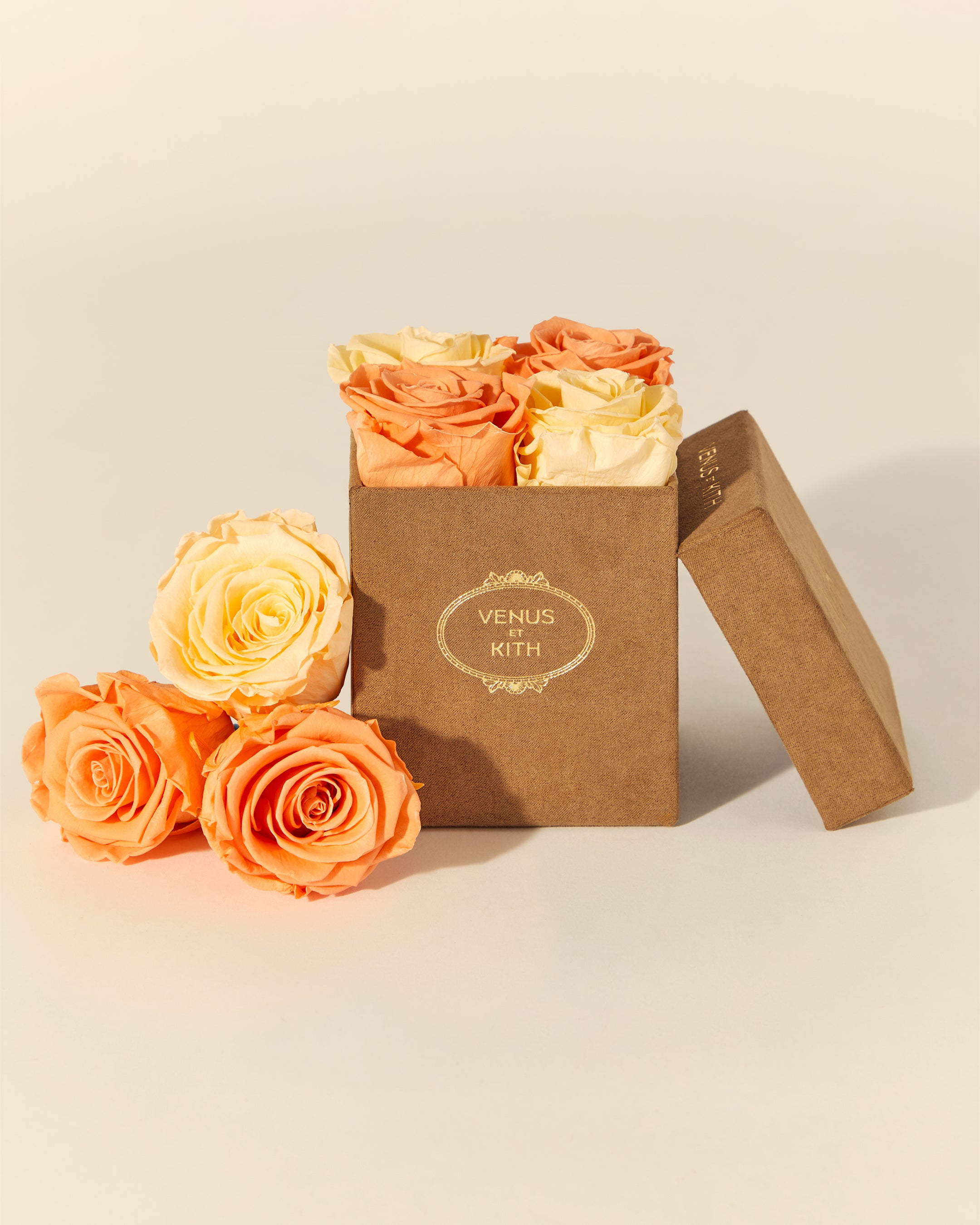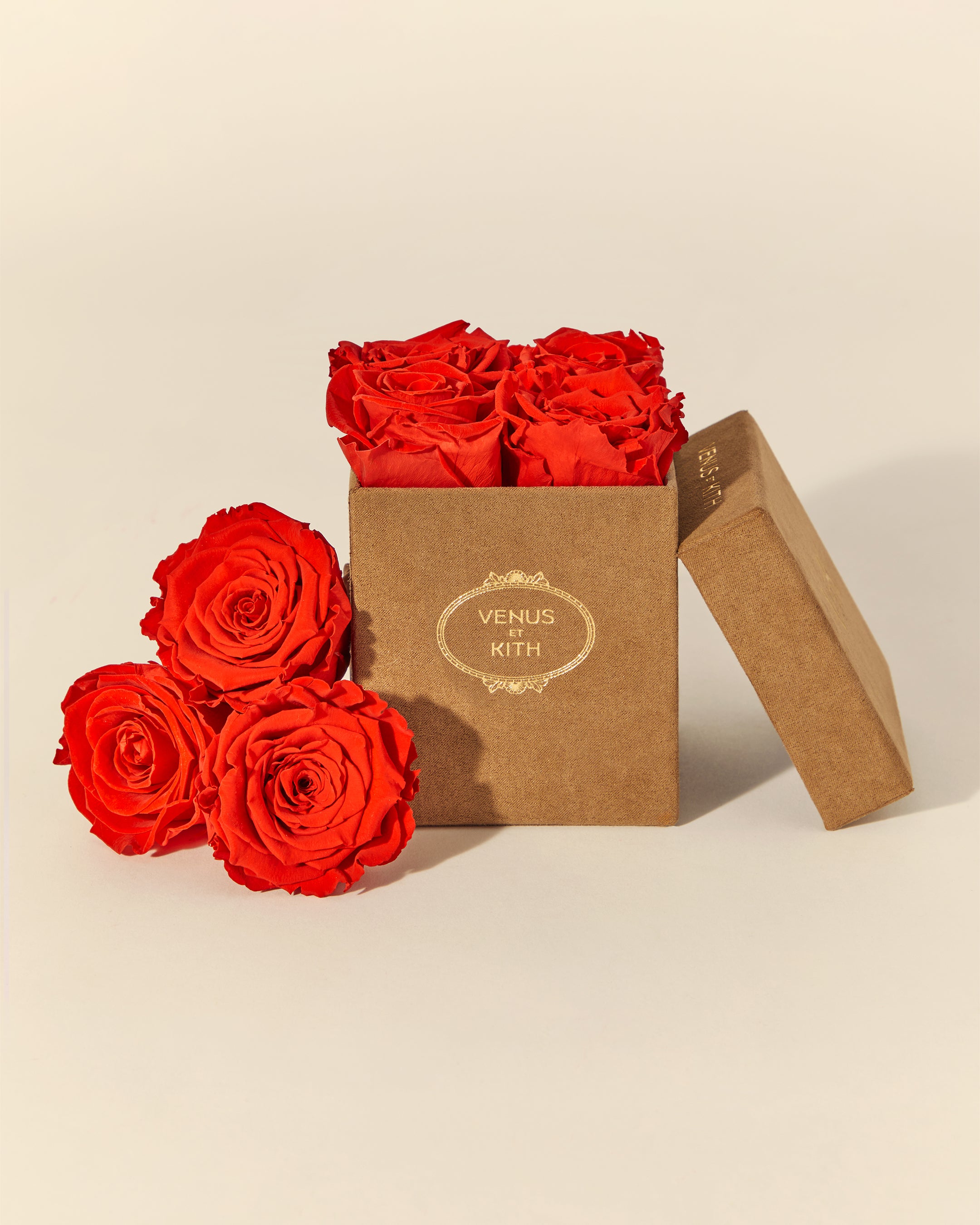 The Kith for Venus et Fleur Le Petit features four Venus et Fleur Eternity® Roses expressed in colorways inspired by global Kith Flagships—Paris, Toronto, New York, Miami, Los Angeles and Hawaii. The roses are packaged in a brown suede hat box, complete with custom gold co-branding. Complementing the Le Petit offering is the Kith for Venus et Fleur Aphrodite Porcelain Vase—a dozen long-stemmed Eternity® Roses presented in a custom porcelain vase that showcases a collaborative ‘Venus et Kith’ logo. Each Eternity® Rose is specially treated to last a year long.