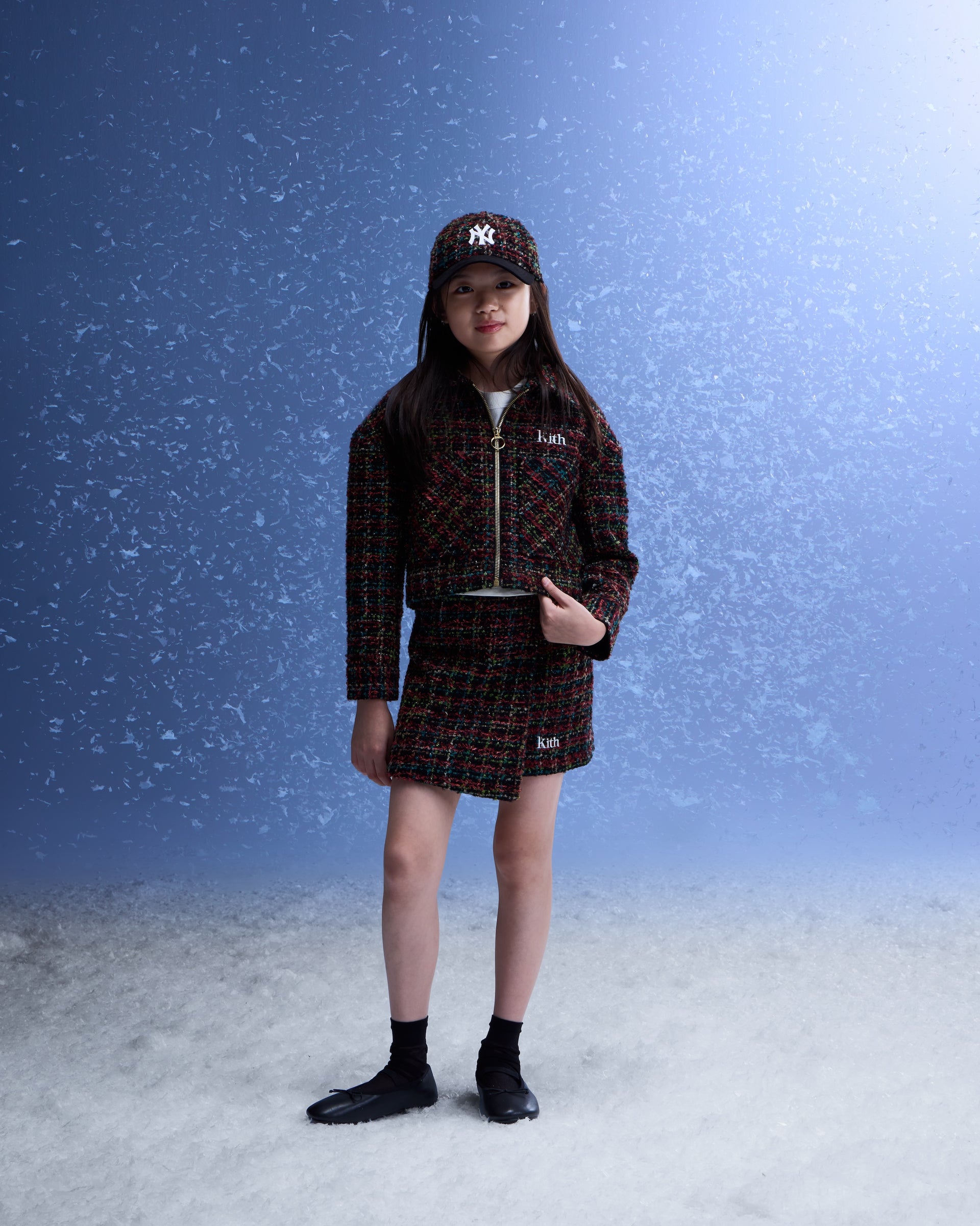 Outerwear from Kith Kids Winter 2025 is a focal point, featured in all-over printed novelty and everyday staple silhouettes such as the Faux Fur Monogram Royce Coat, the New York Yankees Lloyd Sherpa Jacket, and the Cropped Faux Fur Hooded Puffer, alongside the Monogram Sherpa, the Color-Blocked Sherpa Antony Full Zip, and the Clarke Color-Blocked Faux Shearling Jacket. The assortment of matching sets has seasonally-inspired motifs such as the Printed Scenic Nelson Hoodie & Sweatpant, the Novelty Textured Phoebe Jacket & Skirt, and the Cropped Celyse Sweater Hoodie and Pleated Sweater Skort.