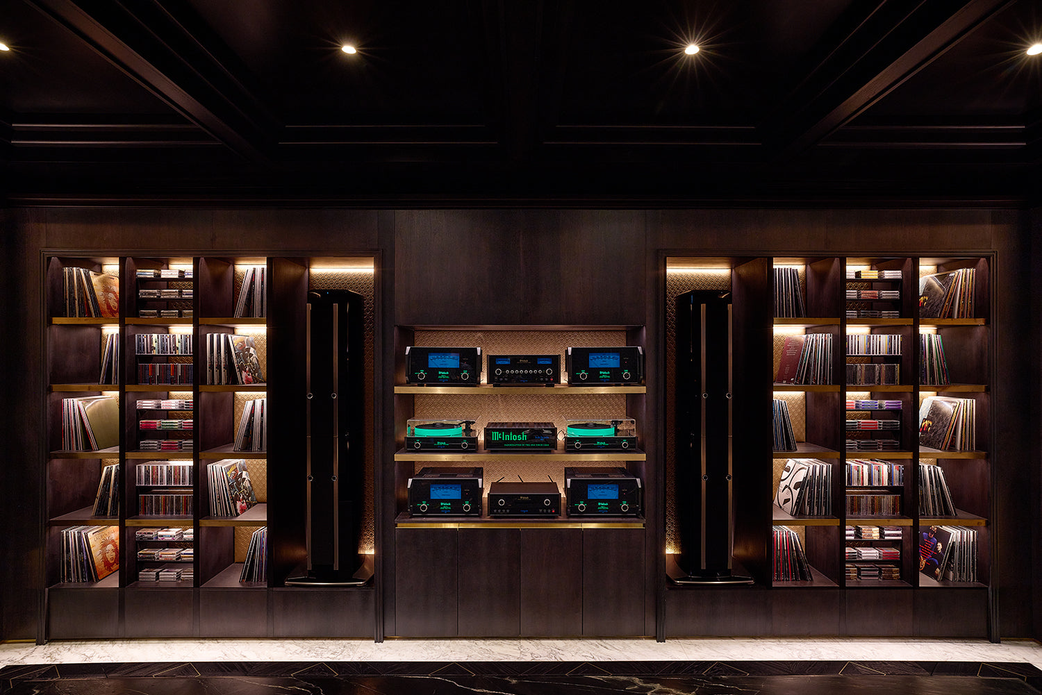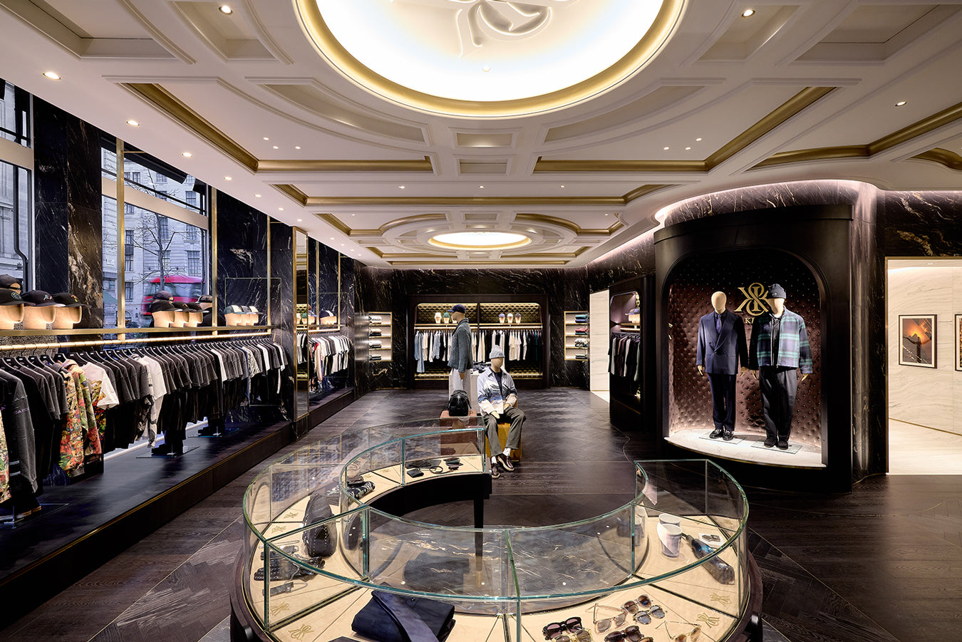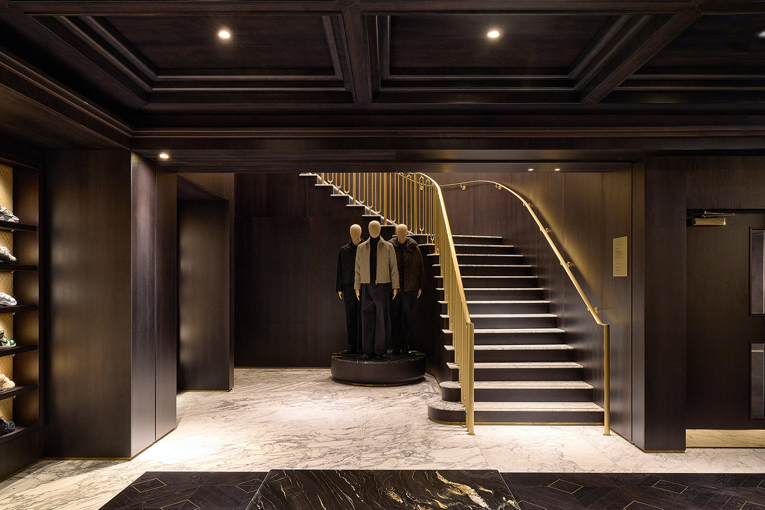 To the right of the Kith Women space and through the checkout area, guests will experience a much darker, richer palette, consisting of walnut millwork, Belvedere marble walls and Calacatta Vagli marble tables , alongside Kith embossed leatherwork throughout. It is complete with deep wood herringbone floors, diamond-tufted green velvet accents, and recessed lighting on the plaster moulded ceilings, evoking a warm, intimate feeling throughout the space that is vast by square footage. This is where Kith seasonal collections can be shopped, accessories alongside fine jewelry, and Kith collaborations. Kith London-exclusive apparel and accessories will also be available at this location.