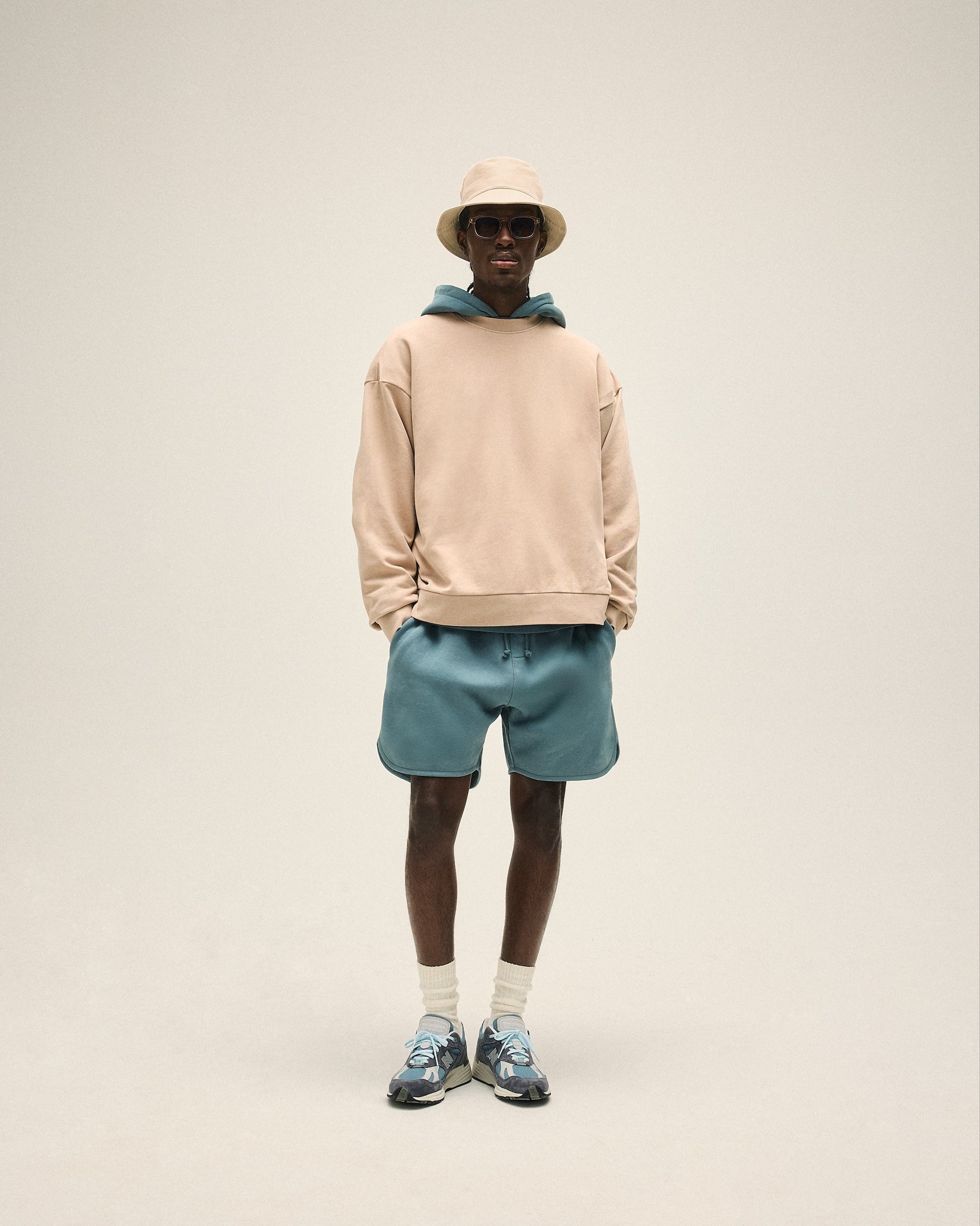Standout sets in a variety of coordinating hues define the Spring 101 offering. Executed in Reef— a muted blue—is the heavyweight plush back fleece Williams II Hoodie paired with the plush back fleece Jordan Short and cotton jersey Leonard Tee. Seen in washed charcoal Nightfall and Hall hues, are the Williams II Hoodie & Elmhurst Pant in lofty brushed fleece alongside the Bishop Tee in sueded cotton jersey. Also crafted from lofty brushed fleece are the Williams V Hoodie and Nelson Sweatpant, which showcase our cream, beige shade, Article.