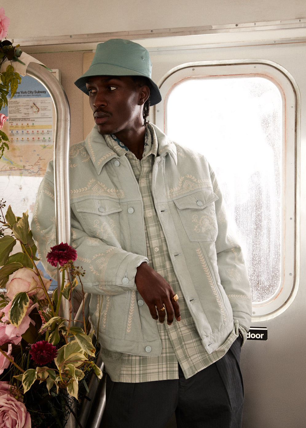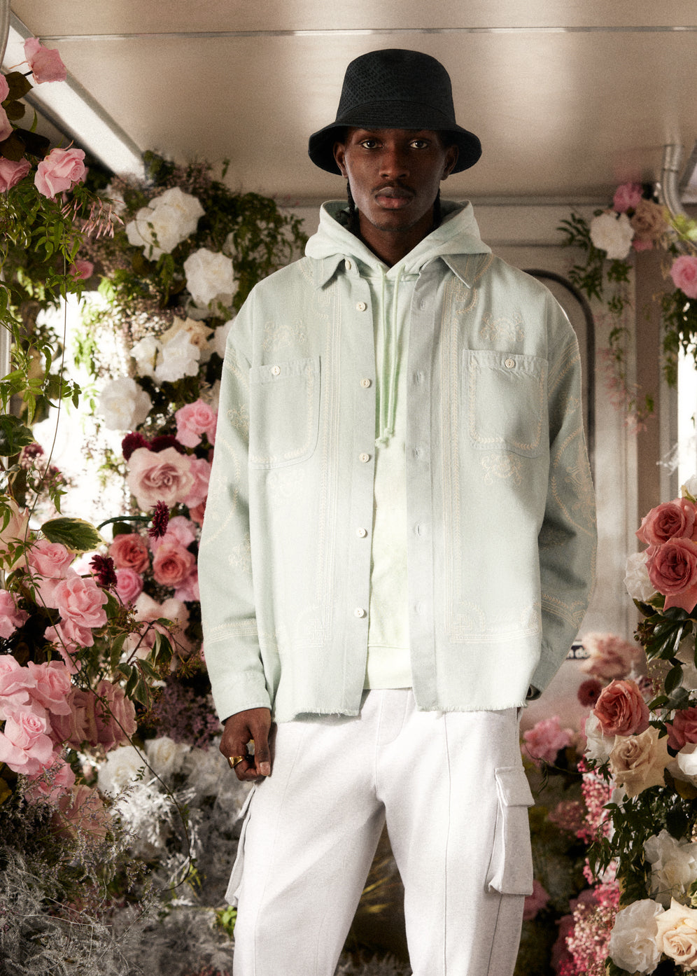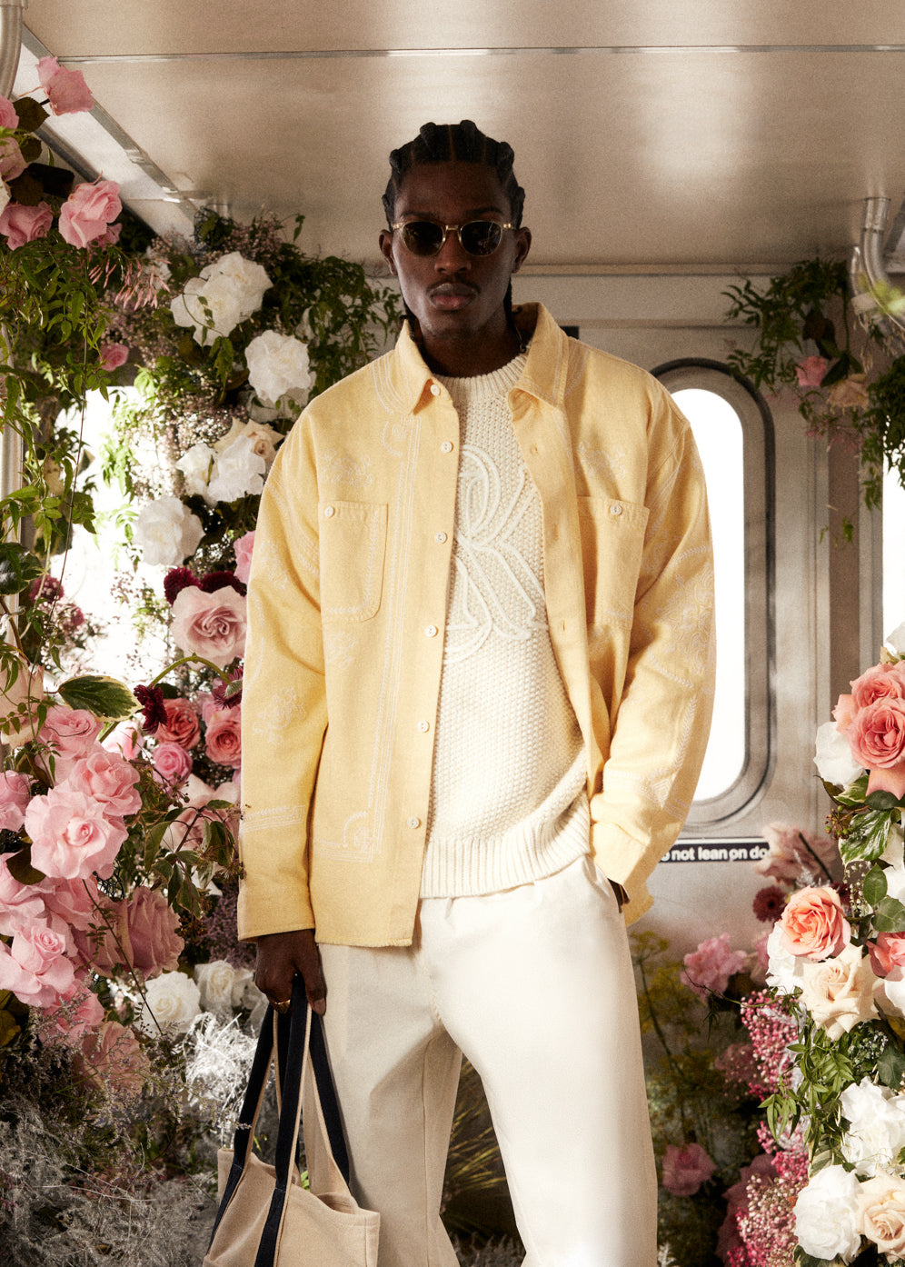 Standouts in the collection include the Suede Combo Micah Coat, Puffed Suede Jaysen Hoodie, Puffed Jase Denim Jacket, and Raw Hem Denim Apollo Shirt. The Suede Combo Micah Coat, a sophisticated new silhouette, is crafted of premium lambskin Nappa suede, providing a silky hand-feel. It has decorative crochet stitch detailing at the paneled composition, patch pockets, a covered-button placket, and is fully satin-lined. Another debut style for Spring 2024 is the Puffed Suede Jaysen Hoodie, a comfortable yet elevated piece crafted from premium lambskin silky-suede fabric. The focal point of the hoodie is a debossed Kith & Kin logo. The Puffed Jase Denim Jacket, offered in three exclusive colorways, highlights all-over custom embroidered artwork and is constructed with lightly-filled cotton denim fabric. The style is finished with a leather patch on the back featuring Kith-branded embossing. The Raw Hem Denim Apollo Shirt is crafted of premium denim fabric, featuring all-over custom embroidery and a raw hem. Details include button closures at the front placket, sleeve cuffs, and pockets on the chest.