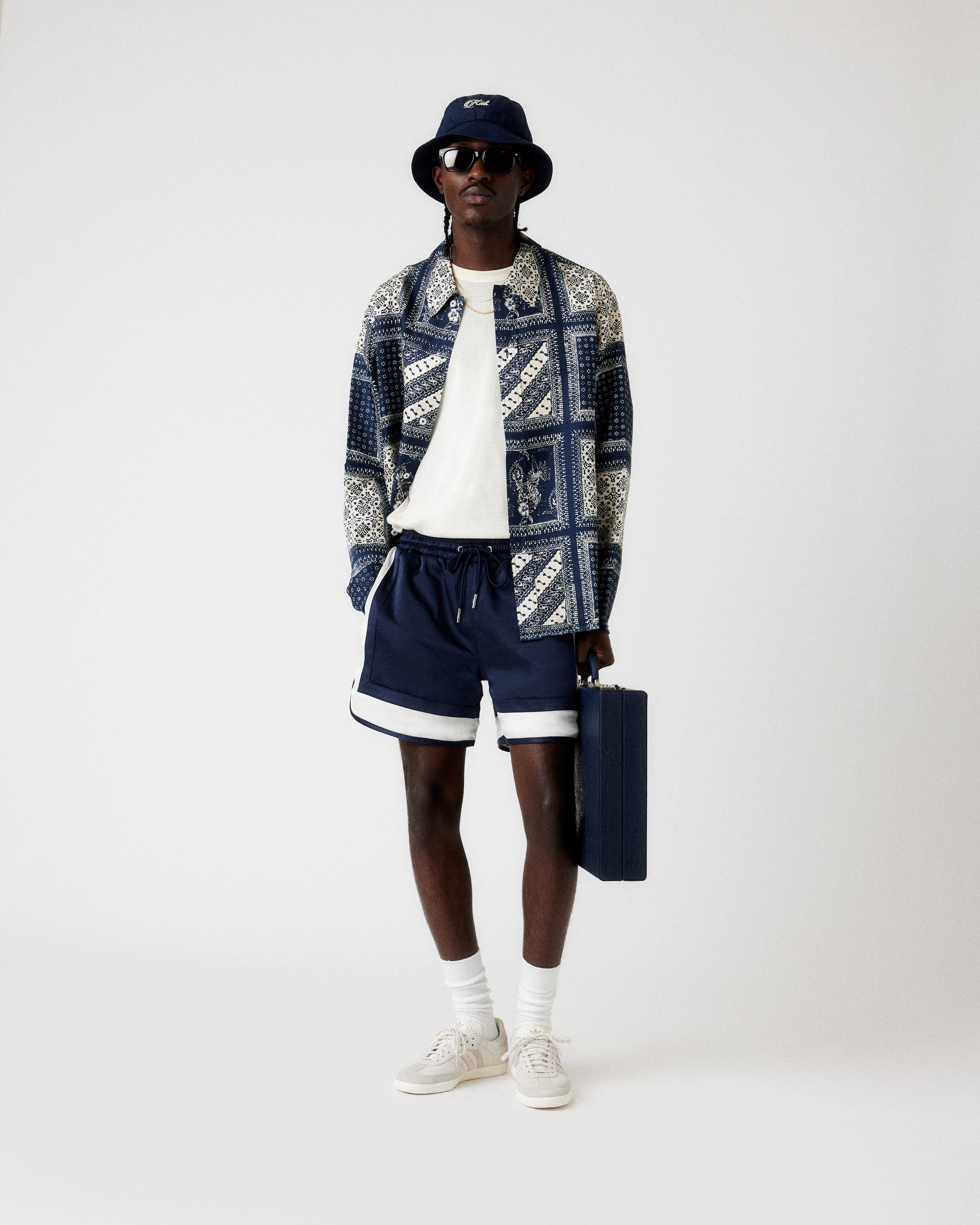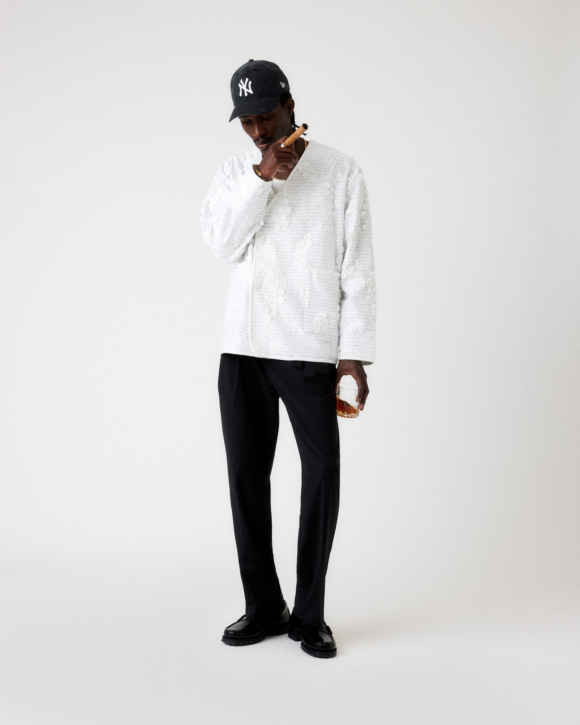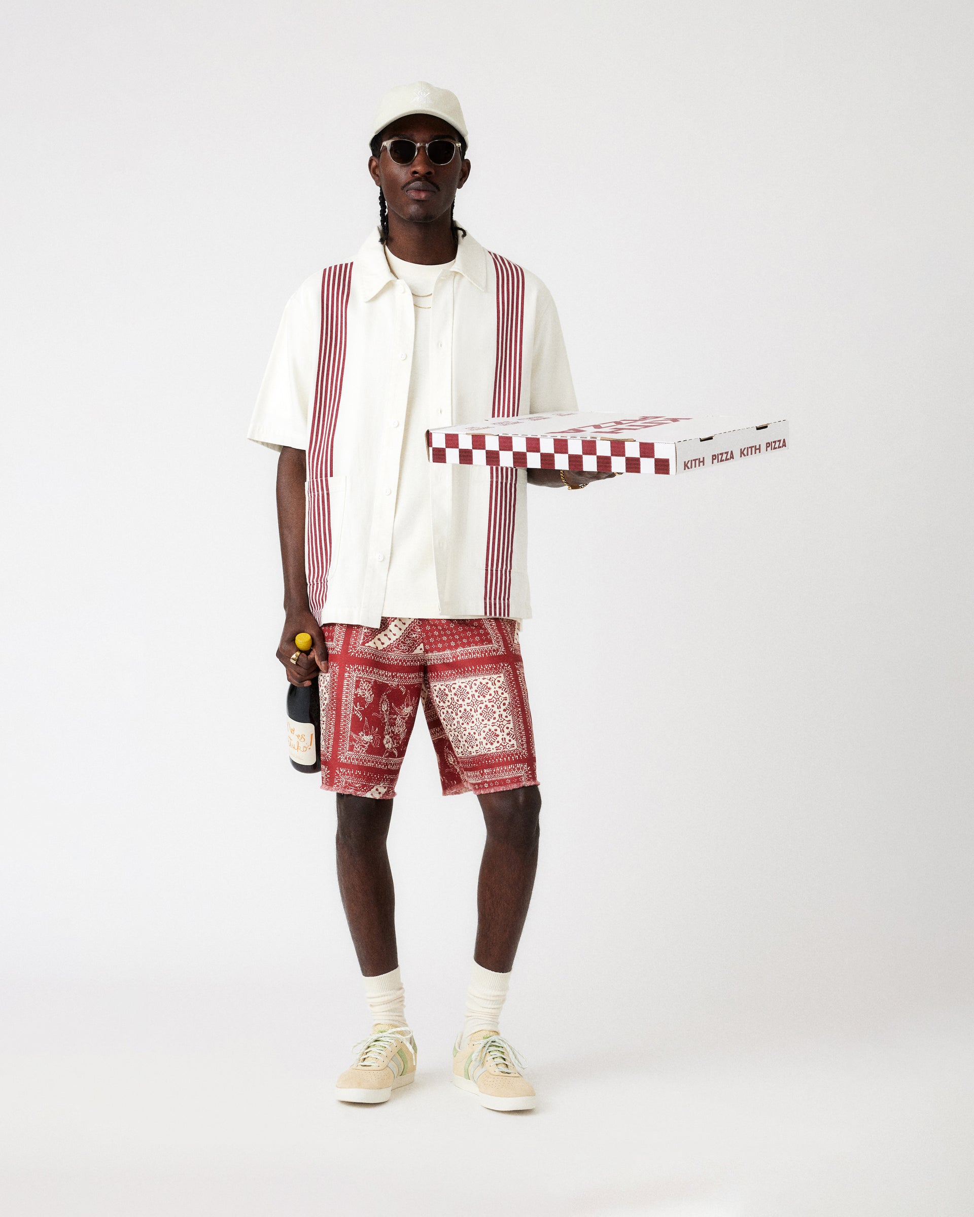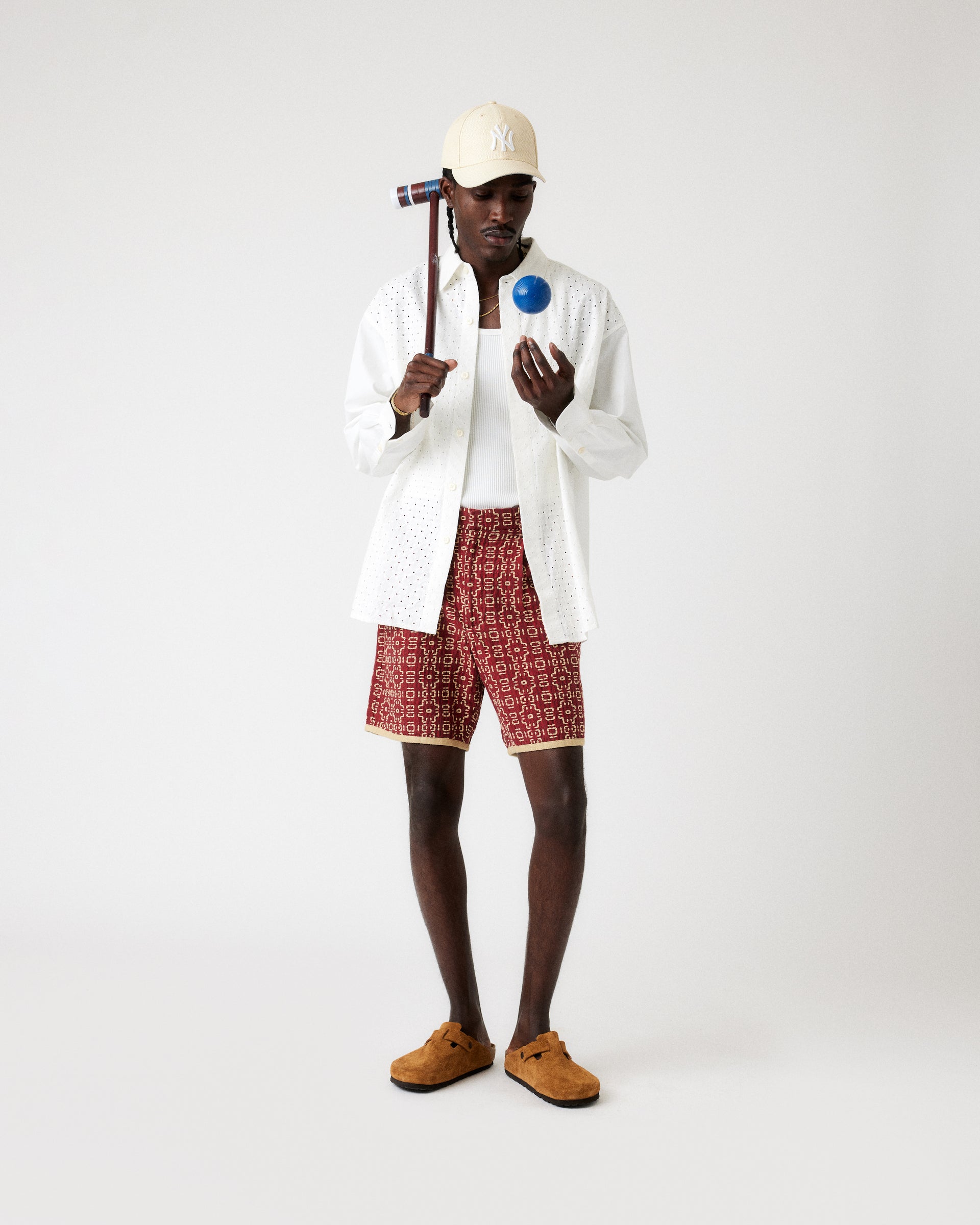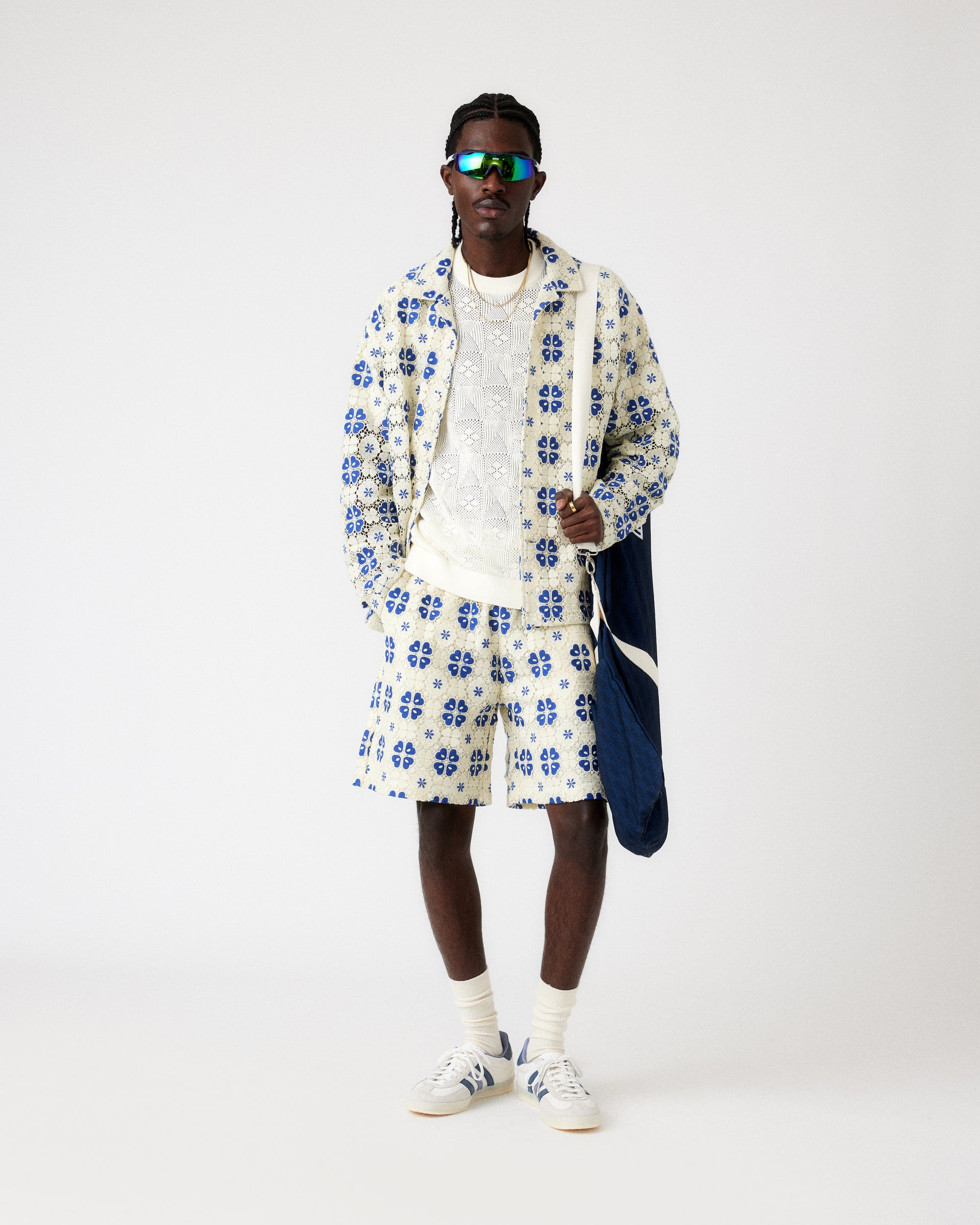 Standouts in the collection include the Talan Suit–a linen two-piece silhouette designed with meticulous craftsmanship–complete with details like a detachable silk scarf, double pleats, and intentional creaselines, as well as the Keyon Short Sleeve Crochet Pullovers, and the Textured Stitch Reid Gi–made for seasonal layering. Like many of the summer knits in this assortment, the Keyon’s crochet composition creates an all-over print, designed in the Shea and Feld colorways. The Textured Stitch Reid Gi is crafted of pick-stitch cotton dobby fabric, also featuring an exclusive Kith Summer 2024 print, also demonstrating a play on texture which is seen across many silhouettes.