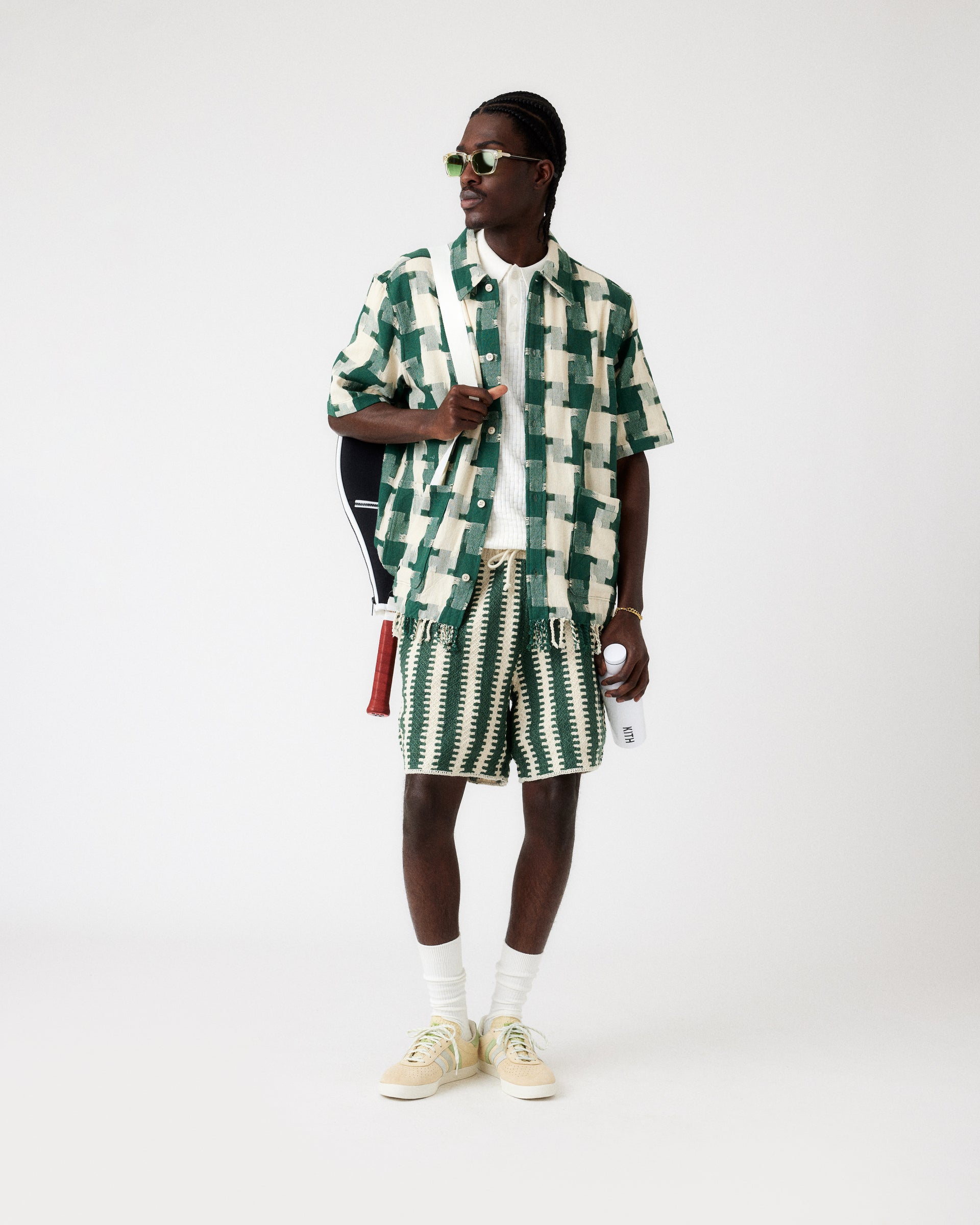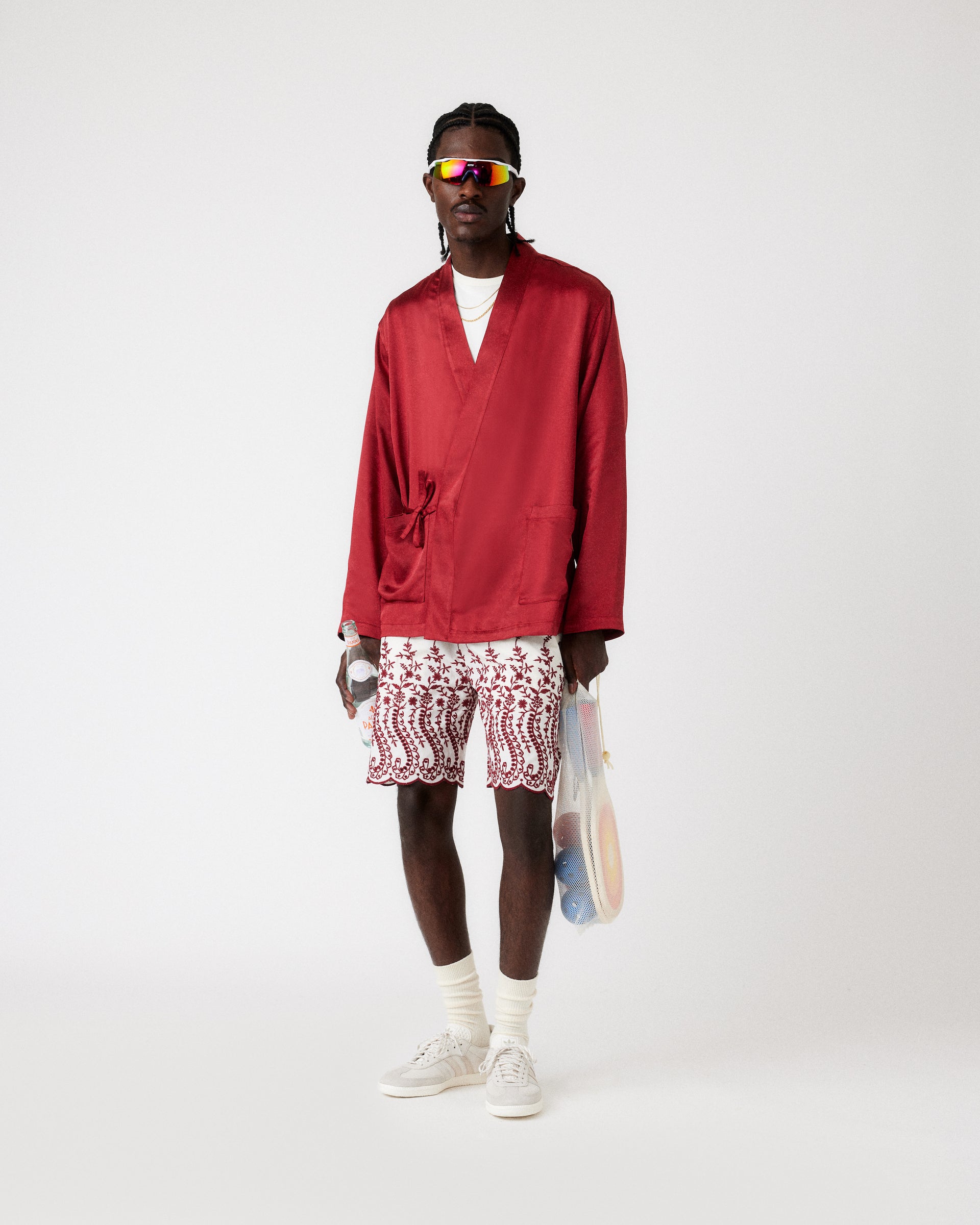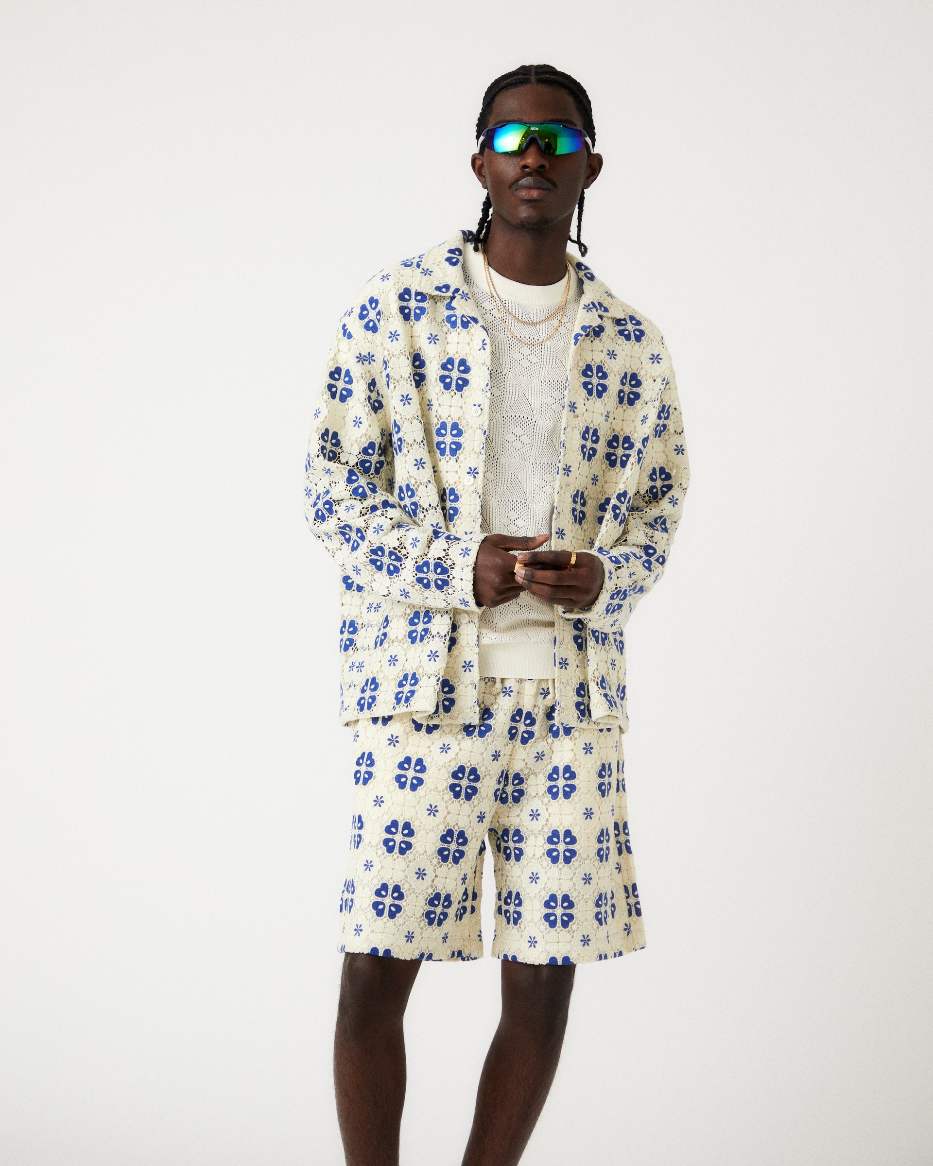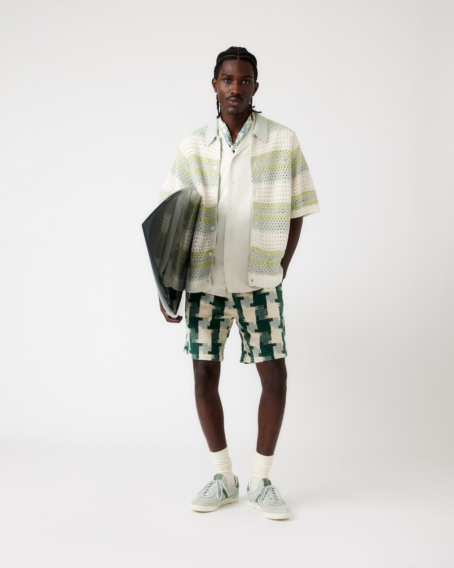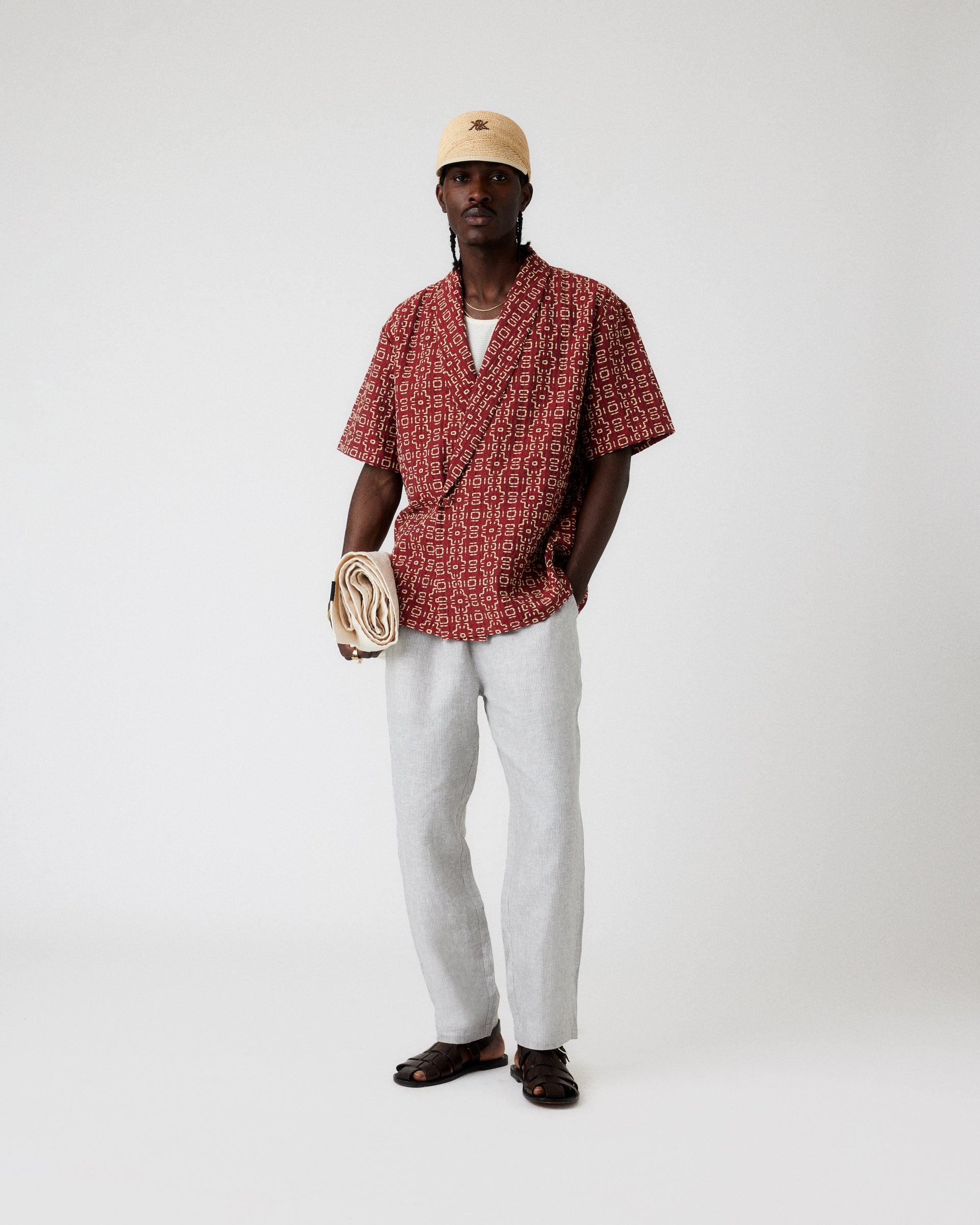 Standouts in the collection include the Talan Suit–a linen two-piece silhouette designed with meticulous craftsmanship–complete with details like a detachable silk scarf, double pleats, and intentional creaselines, as well as the Keyon Short Sleeve Crochet Pullovers, and the Textured Stitch Reid Gi–made for seasonal layering. Like many of the summer knits in this assortment, the Keyon’s crochet composition creates an all-over print, designed in the Shea and Feld colorways. The Textured Stitch Reid Gi is crafted of pick-stitch cotton dobby fabric, also featuring an exclusive Kith Summer 2024 print, also demonstrating a play on texture which is seen across many silhouettes.