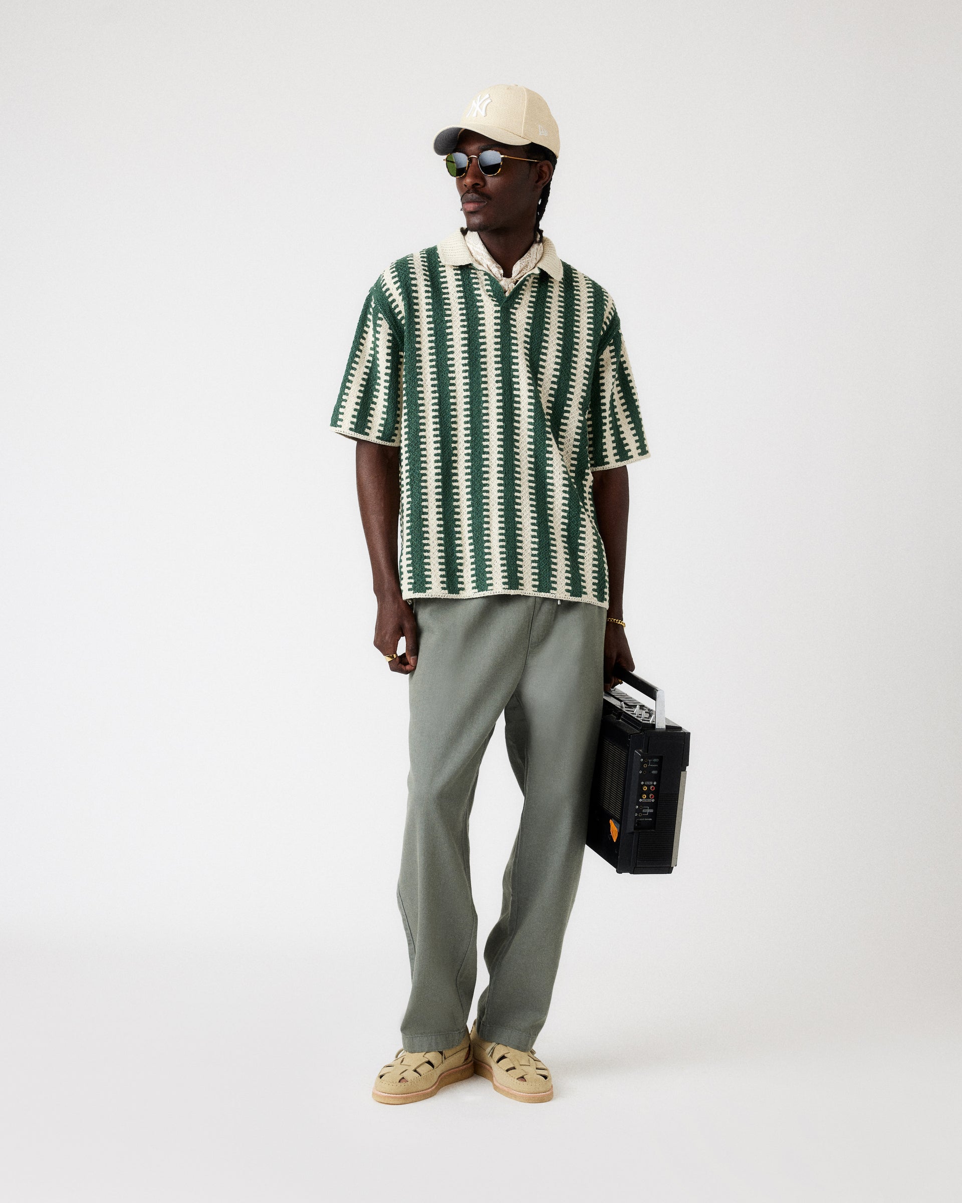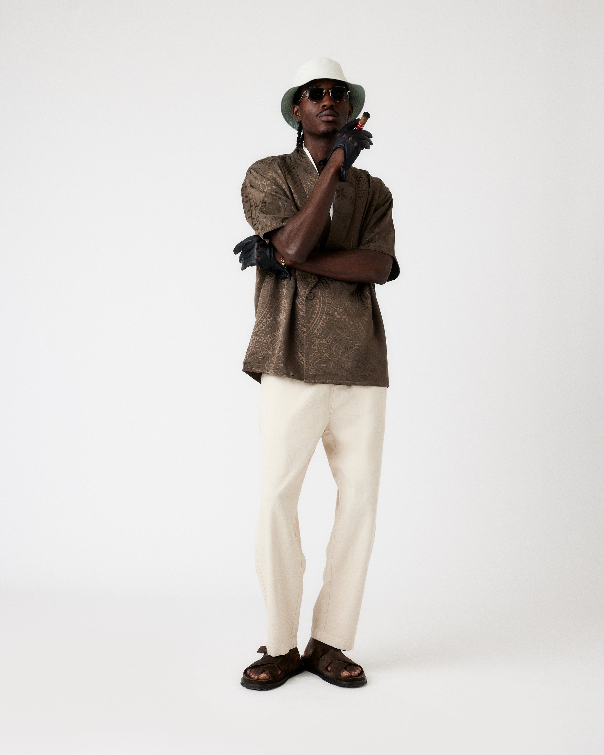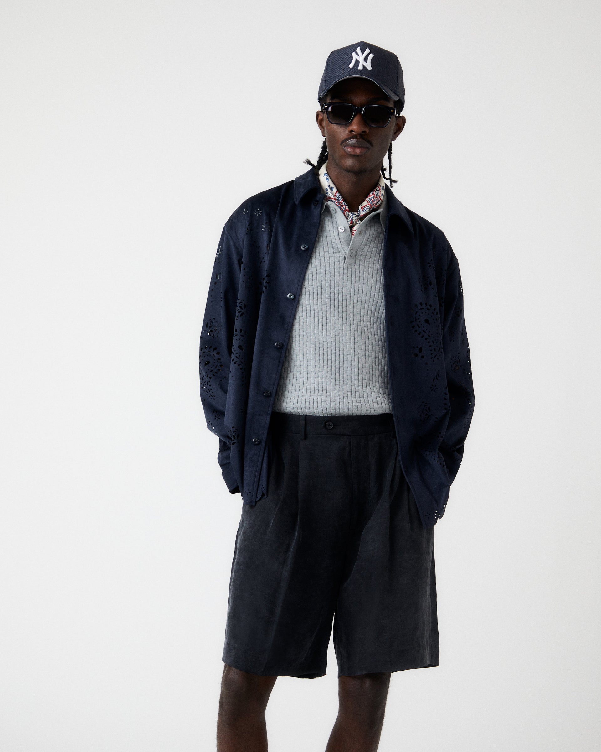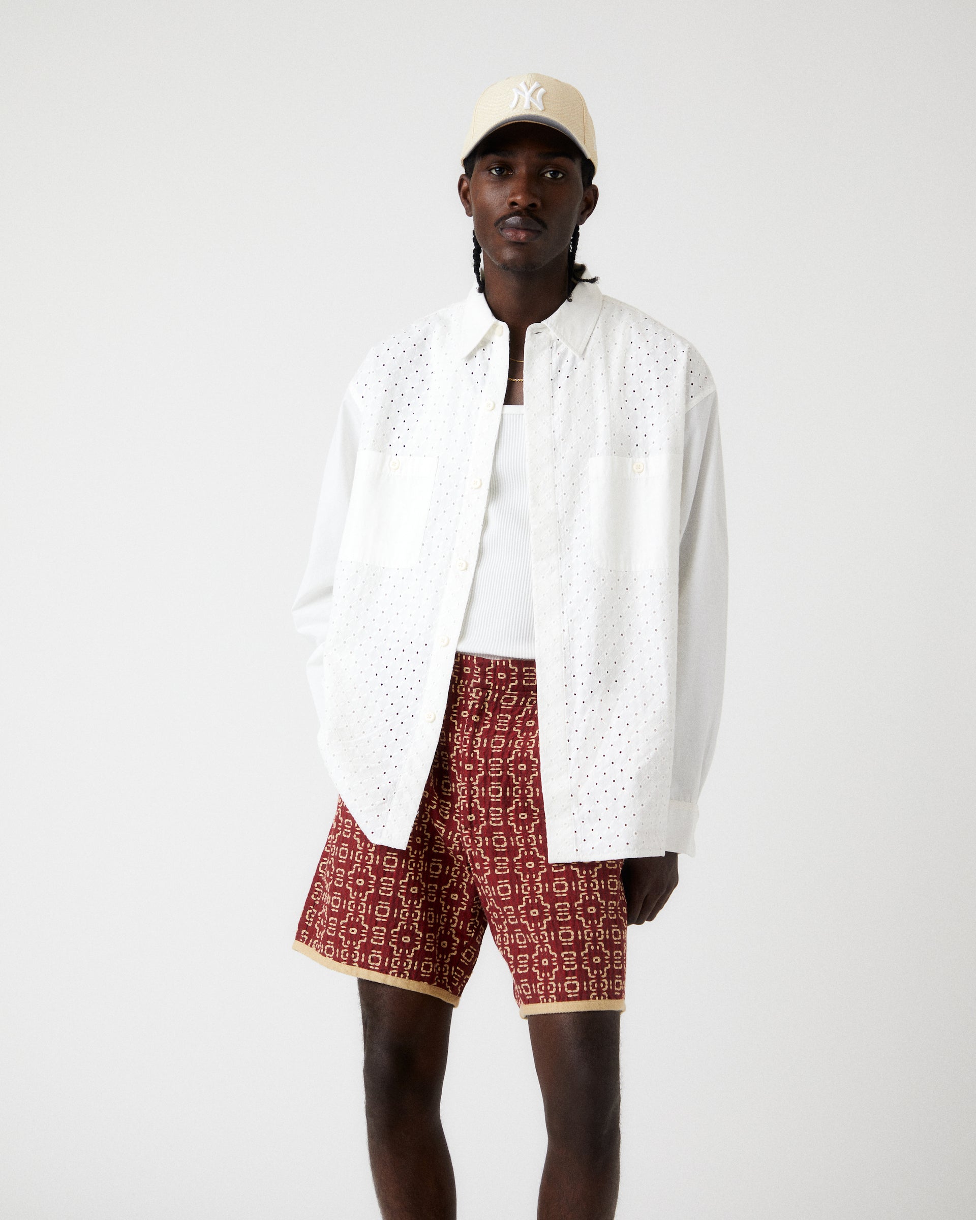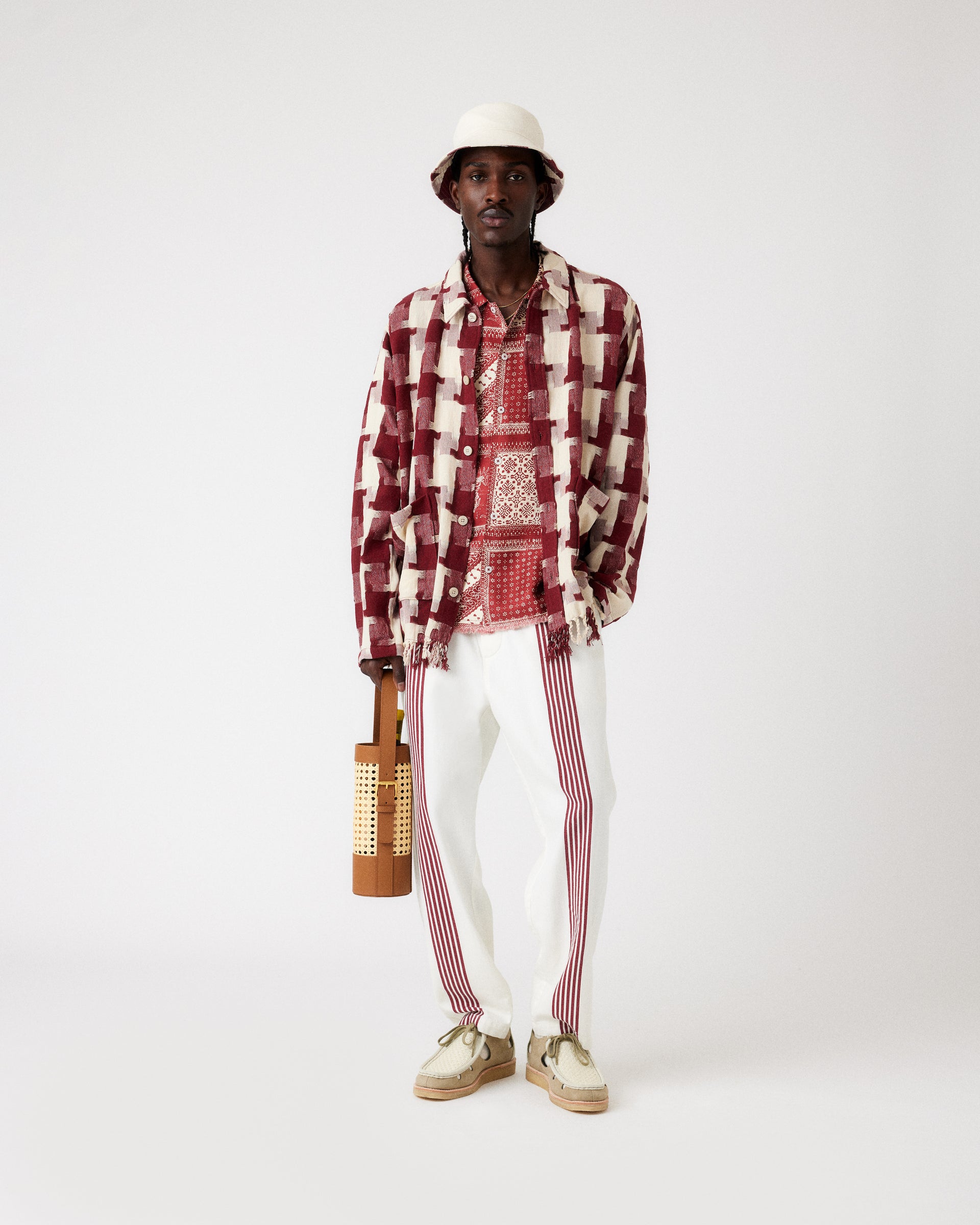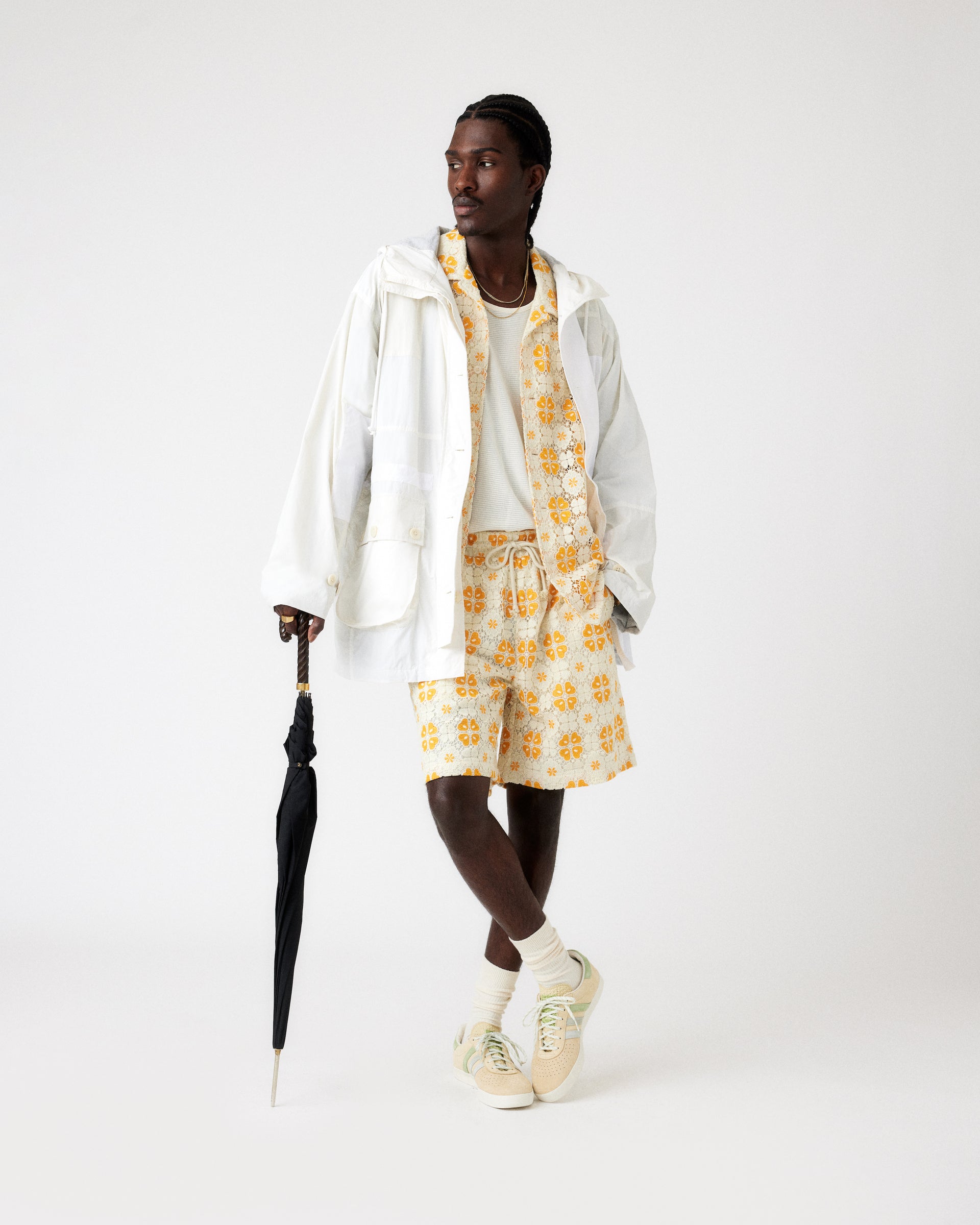 Standouts in the collection include the Talan Suit–a linen two-piece silhouette designed with meticulous craftsmanship–complete with details like a detachable silk scarf, double pleats, and intentional creaselines, as well as the Keyon Short Sleeve Crochet Pullovers, and the Textured Stitch Reid Gi–made for seasonal layering. Like many of the summer knits in this assortment, the Keyon’s crochet composition creates an all-over print, designed in the Shea and Feld colorways. The Textured Stitch Reid Gi is crafted of pick-stitch cotton dobby fabric, also featuring an exclusive Kith Summer 2024 print, also demonstrating a play on texture which is seen across many silhouettes.