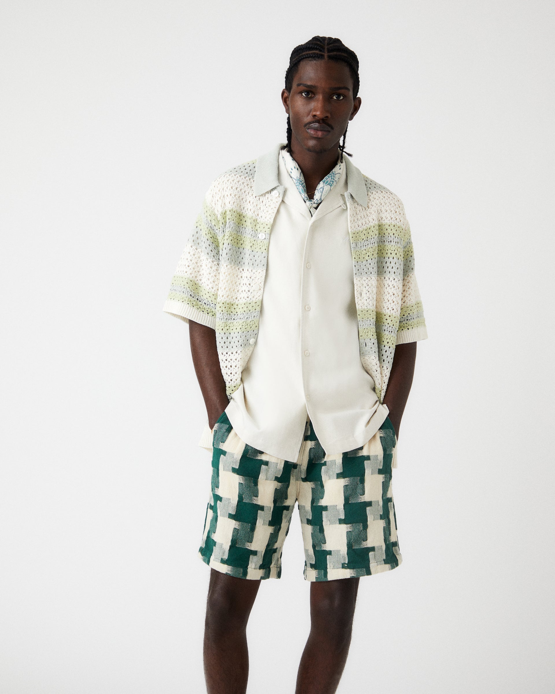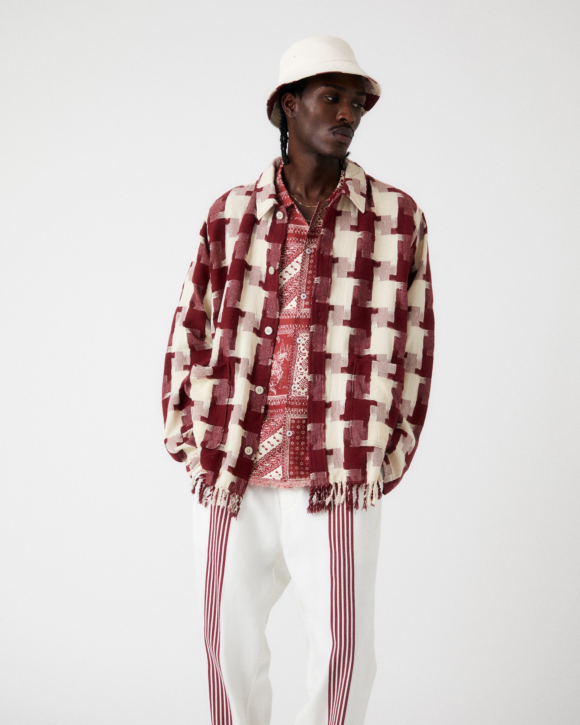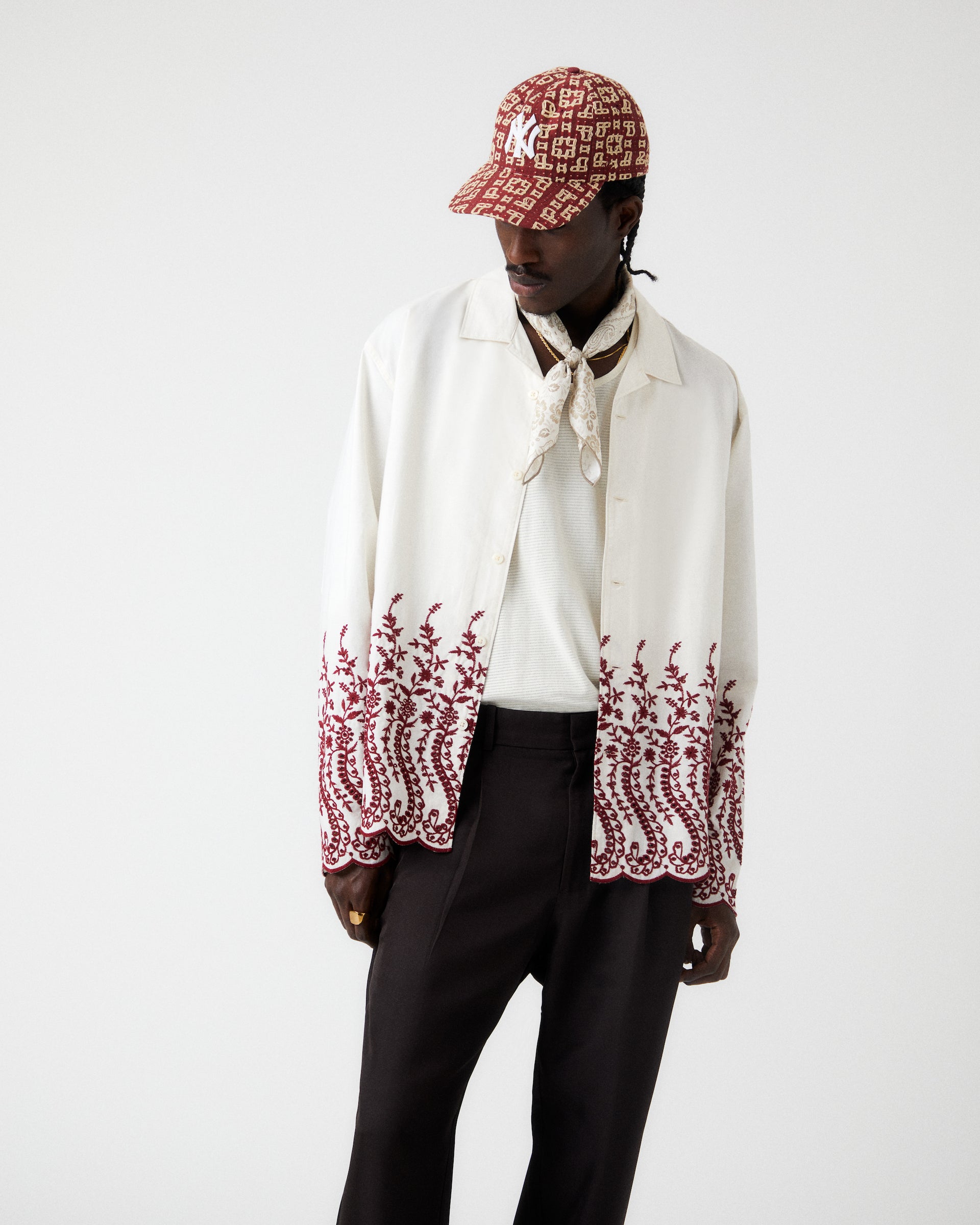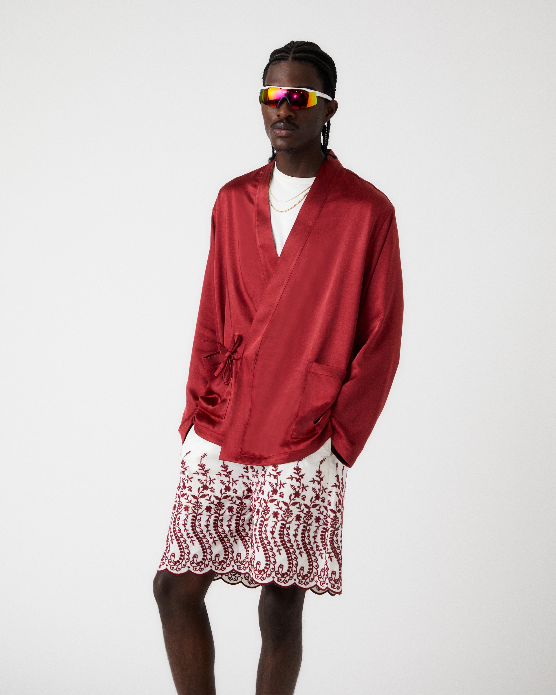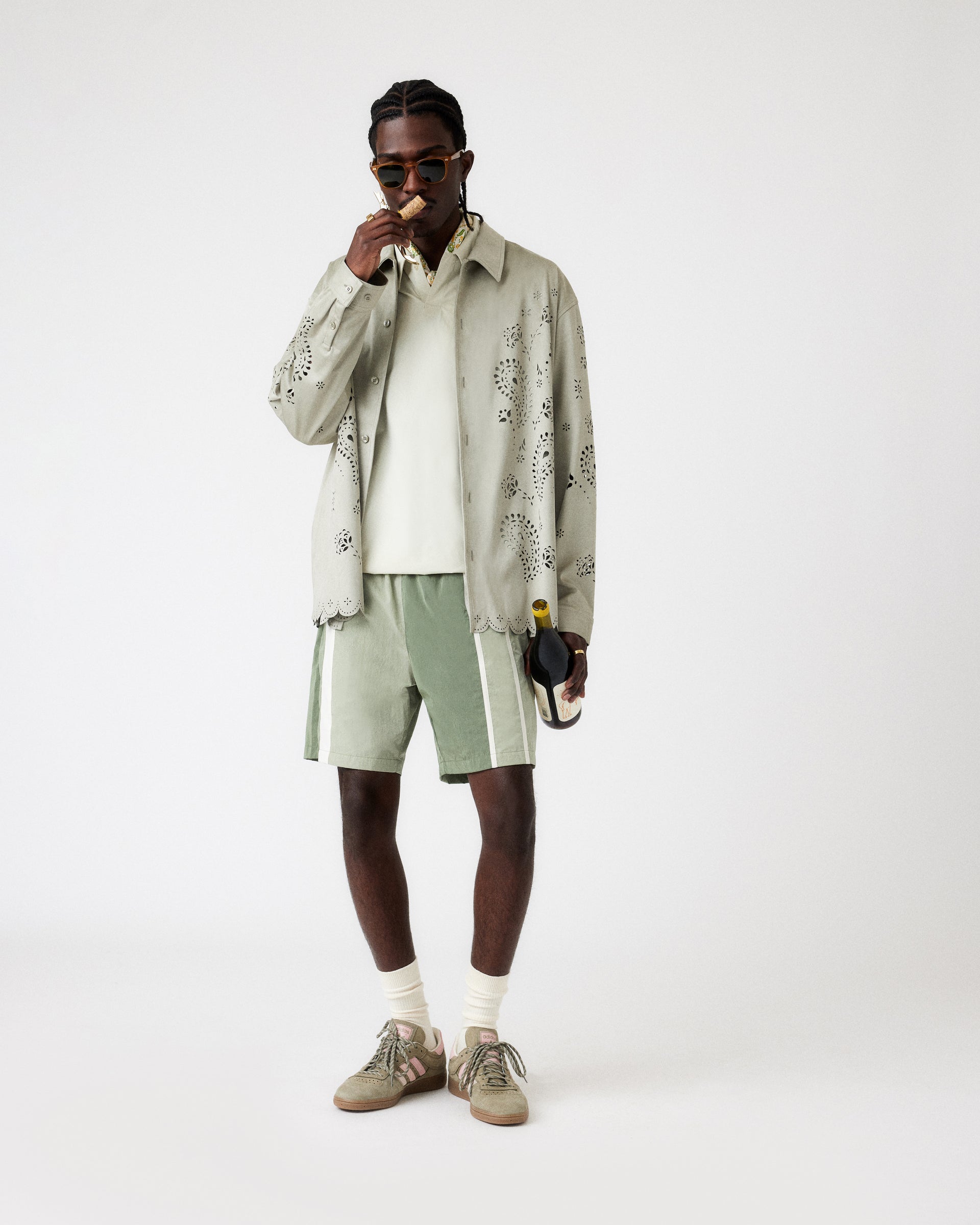Standouts in the collection include the Talan Suit–a linen two-piece silhouette designed with meticulous craftsmanship–complete with details like a detachable silk scarf, double pleats, and intentional creaselines, as well as the Keyon Short Sleeve Crochet Pullovers, and the Textured Stitch Reid Gi–made for seasonal layering. Like many of the summer knits in this assortment, the Keyon’s crochet composition creates an all-over print, designed in the Shea and Feld colorways. The Textured Stitch Reid Gi is crafted of pick-stitch cotton dobby fabric, also featuring an exclusive Kith Summer 2024 print, also demonstrating a play on texture which is seen across many silhouettes.