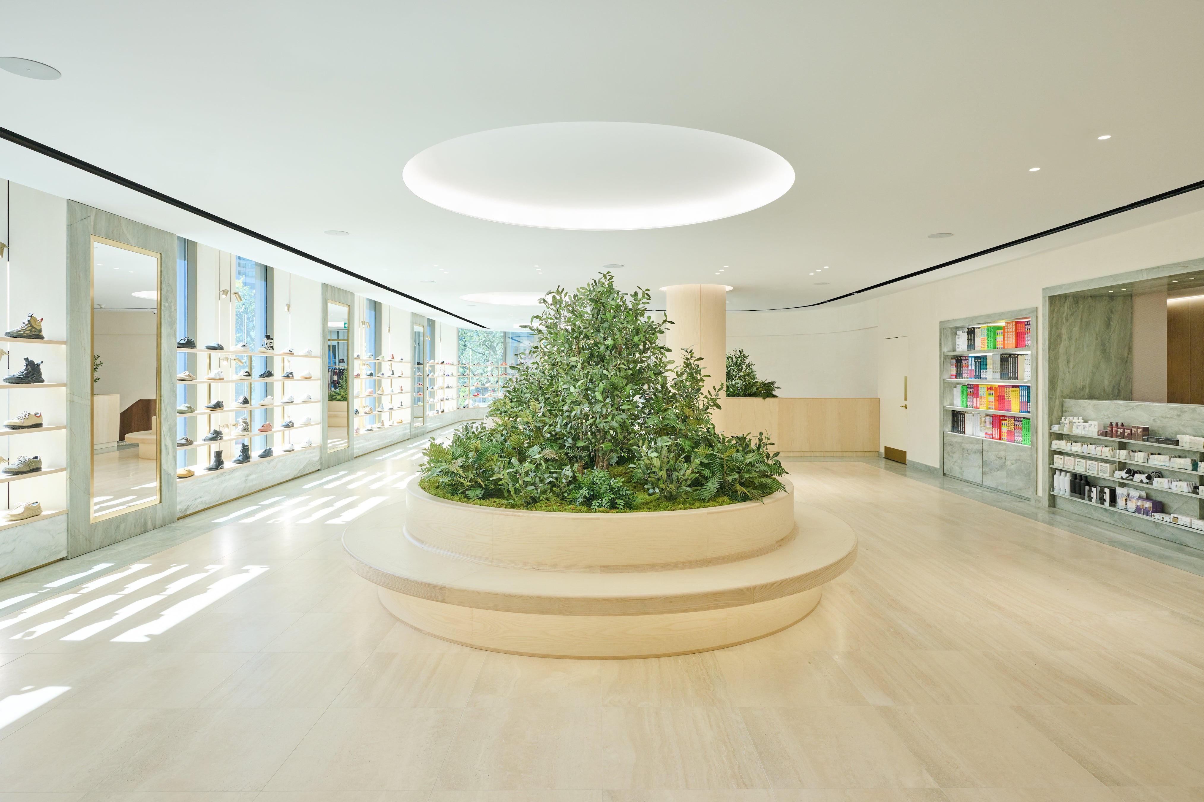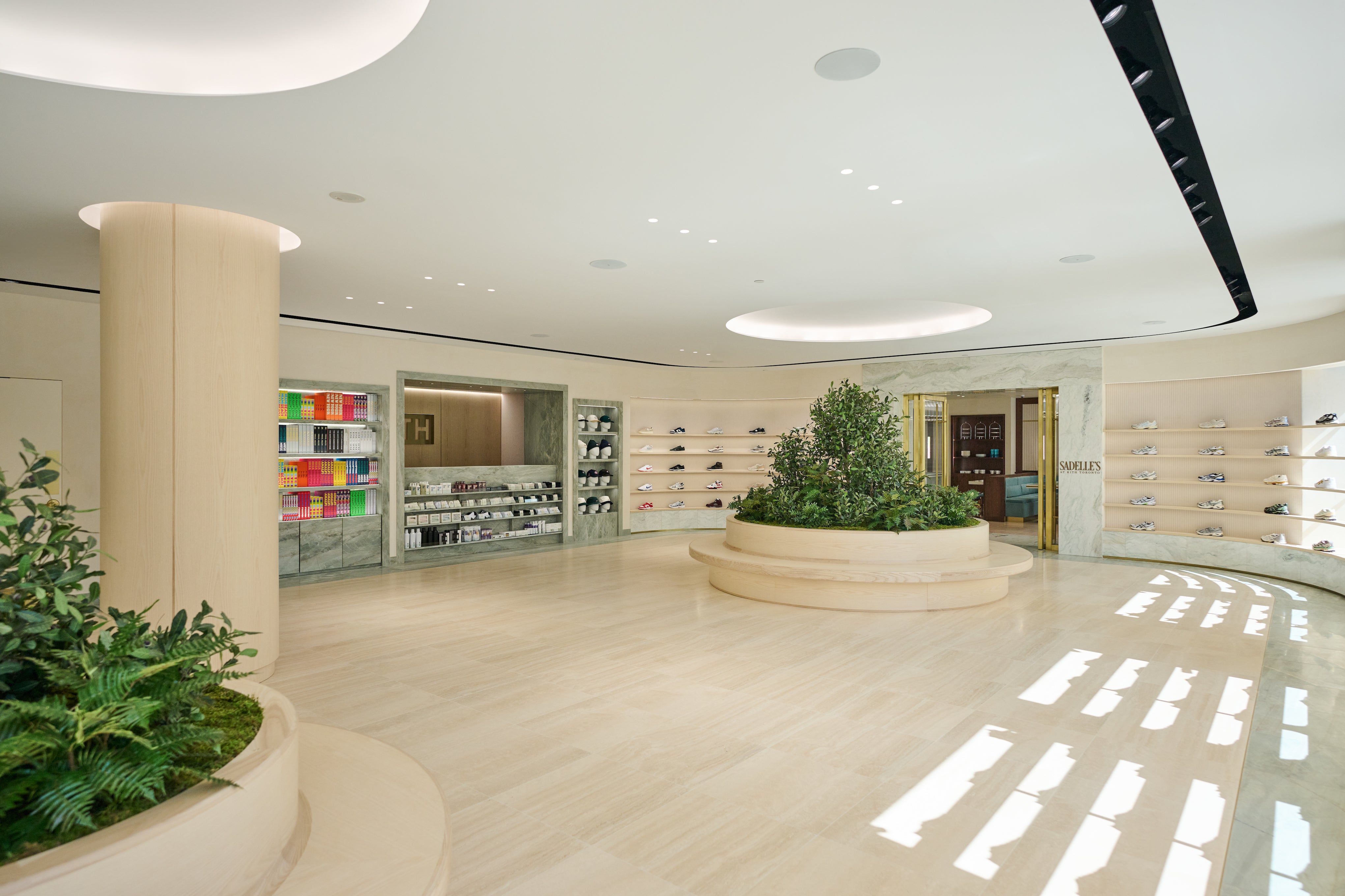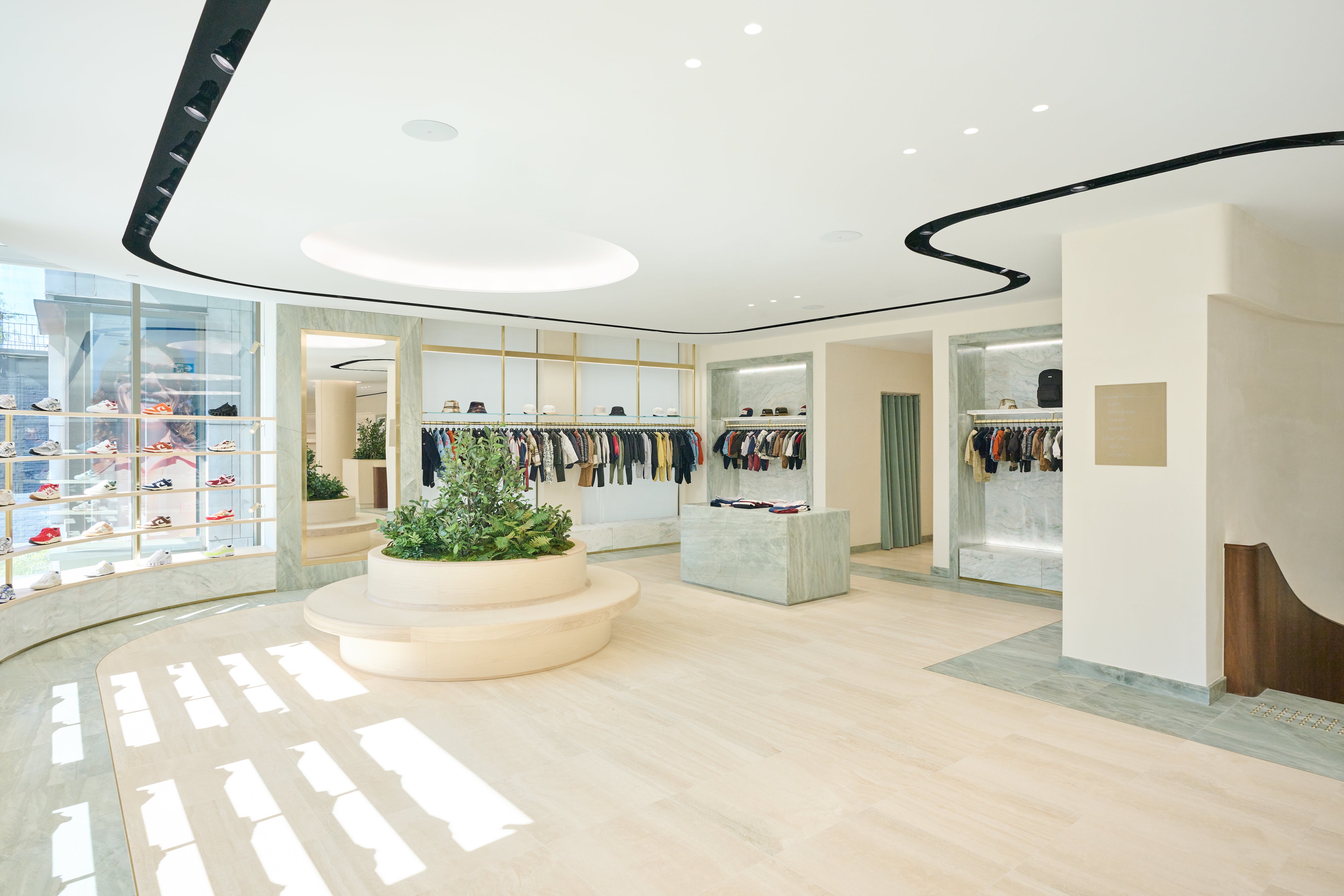 The ambiance is elevated with a careful balance of white, blue and brown hues—alongside calming greenery tastefully placed throughout the store. Our changing rooms and elevators are covered with Kith Classic logo vegan leather wallpaper. The Kith Treats and Sadelle’s area is elevated with Rosa Aurora Stone and is complimented by its blend of wood, stone and metal accents—creating a sharp, sophisticated setting.