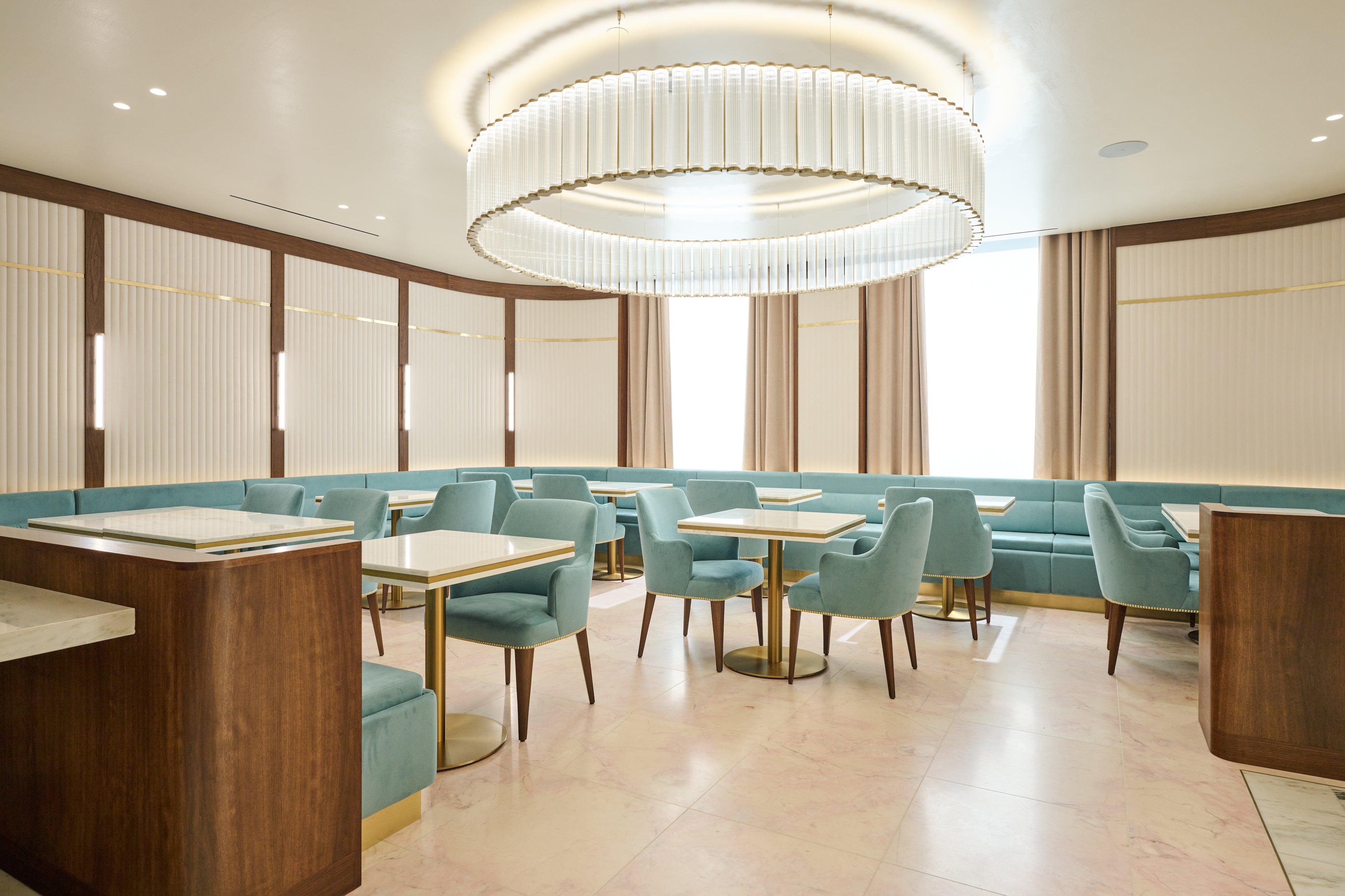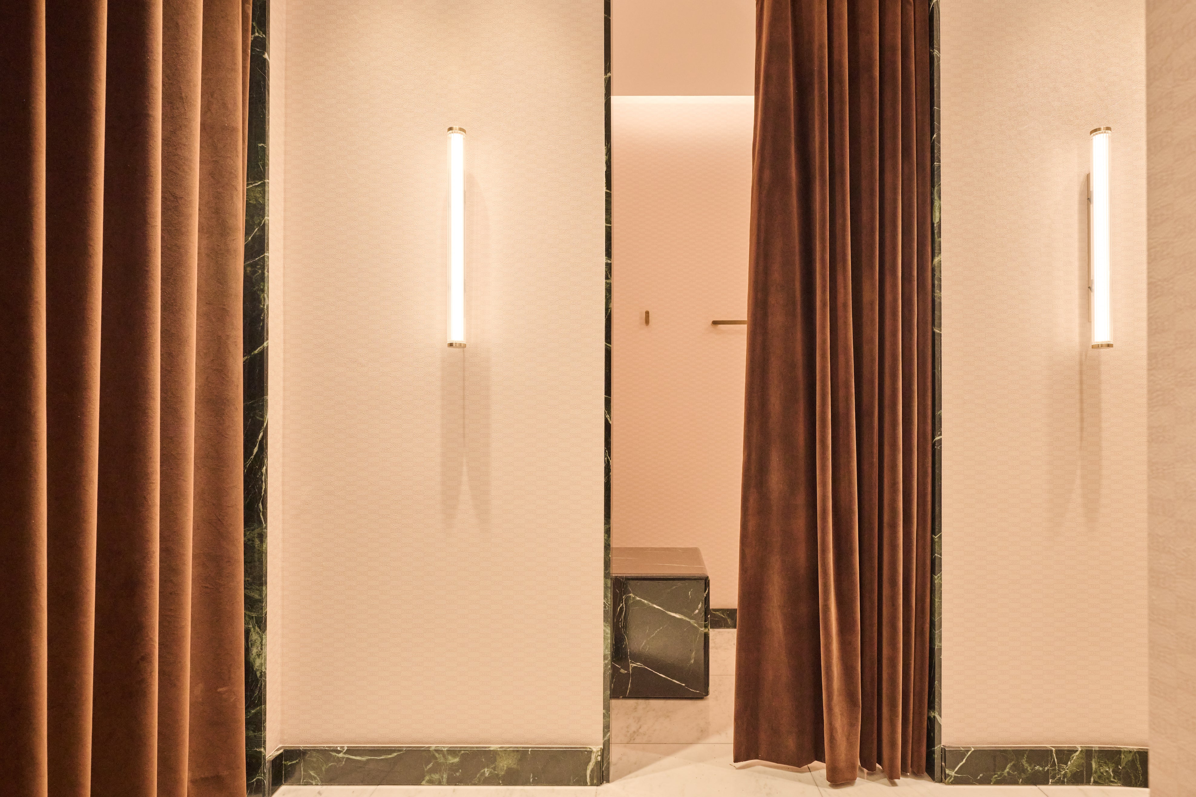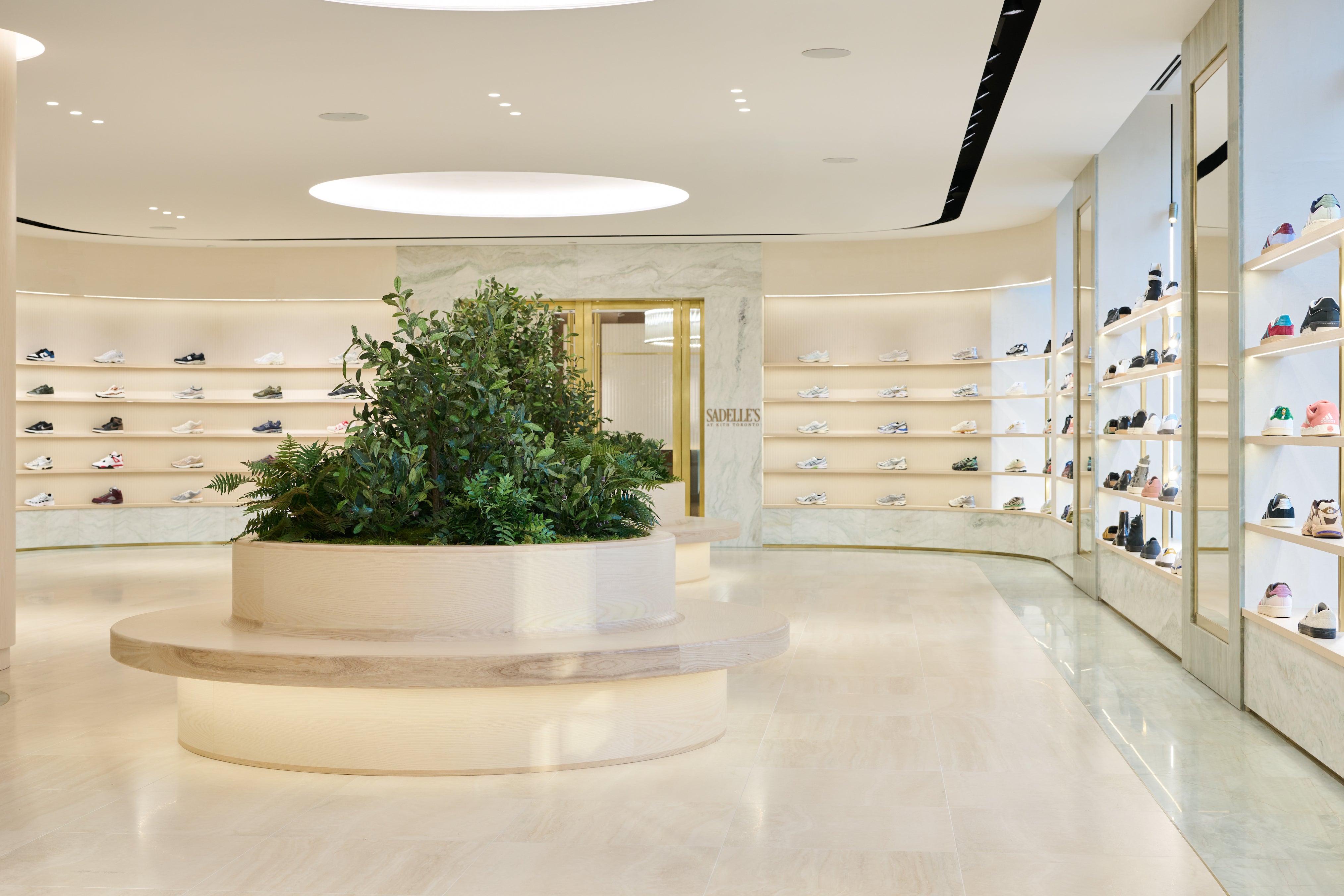 The ambiance is elevated with a careful balance of white, blue and brown hues—alongside calming greenery tastefully placed throughout the store. Our changing rooms and elevators are covered with Kith Classic logo vegan leather wallpaper. The Kith Treats and Sadelle’s area is elevated with Rosa Aurora Stone and is complimented by its blend of wood, stone and metal accents—creating a sharp, sophisticated setting.