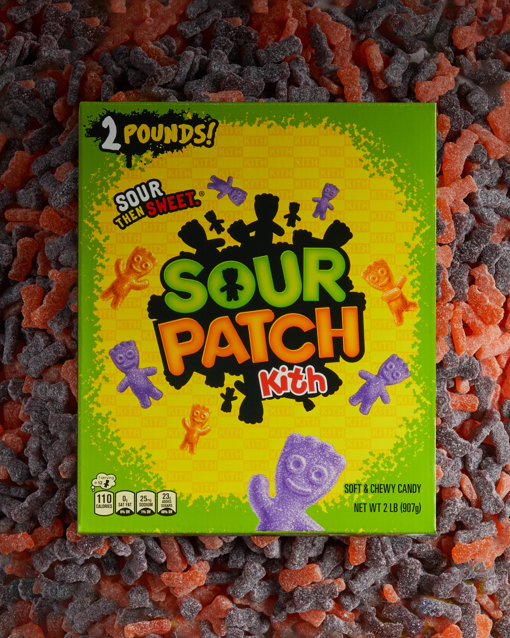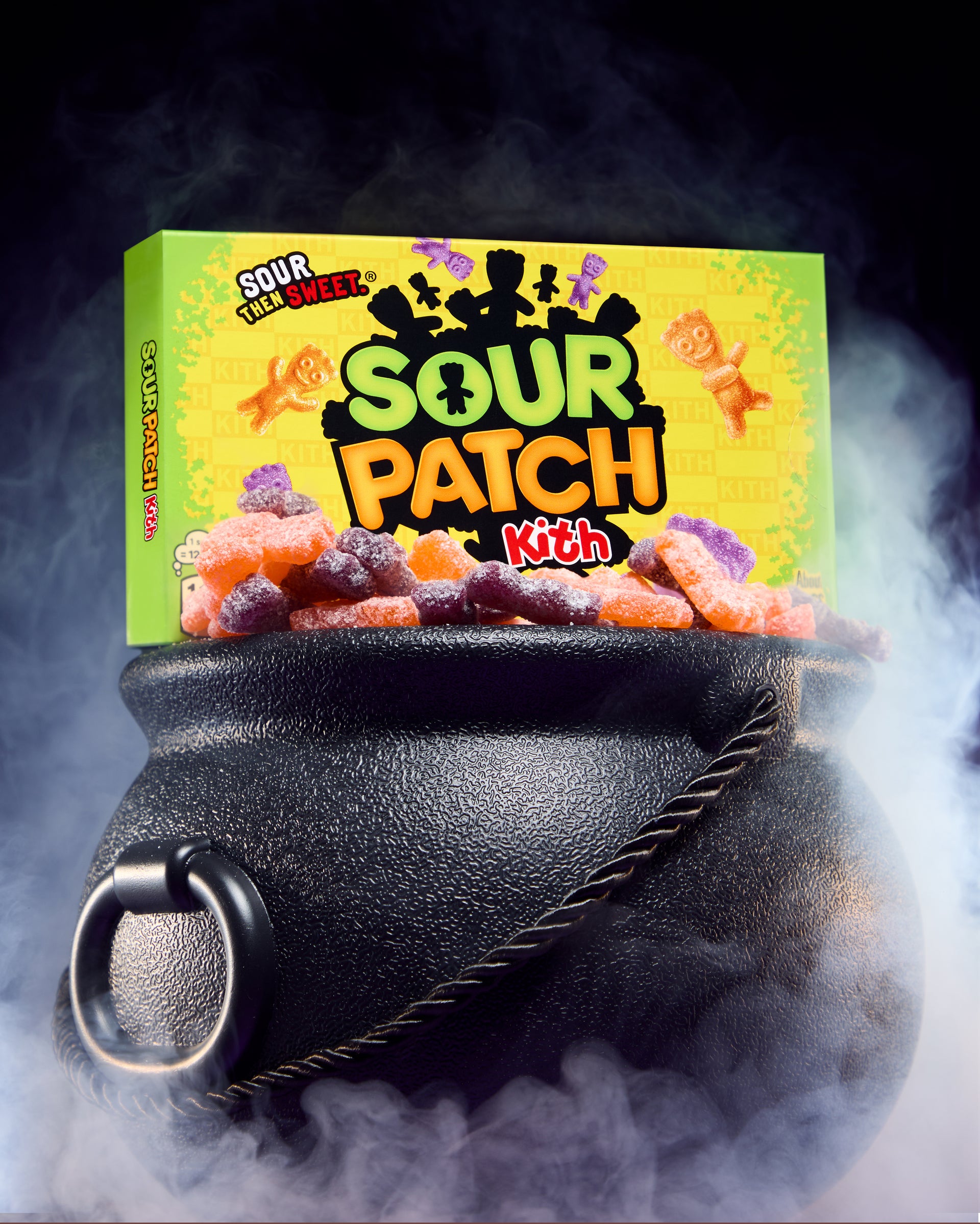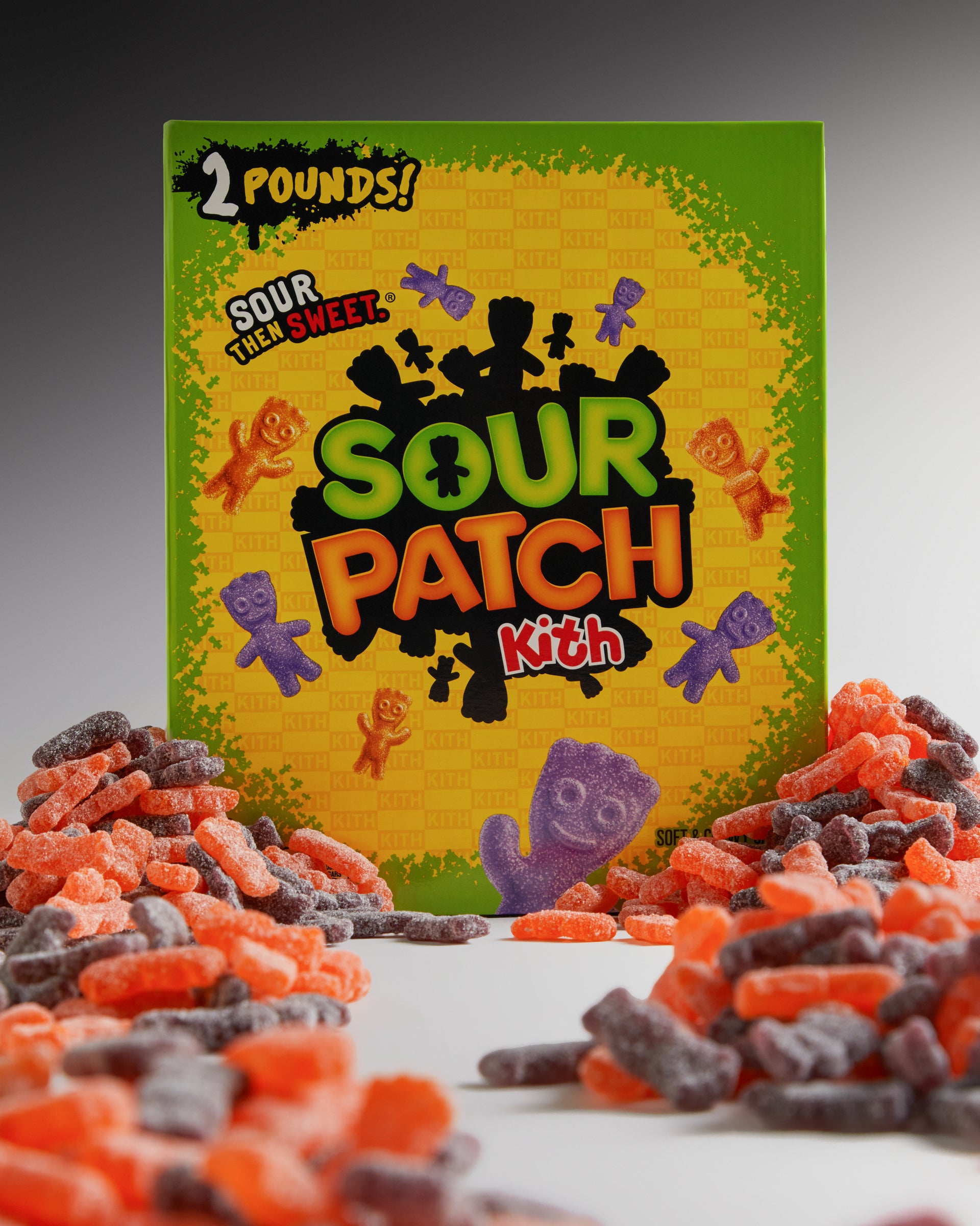 The collection's centerpiece is a limited edition, co-branded two-pound box containing a special Halloween blend of Grape and Orange-flavored SOUR PATCH KIDS candy. The Kith Treats for SOUR PATCH KIDS® two-pound box size is typically reserved for special collaborations and cannot be found anywhere else.