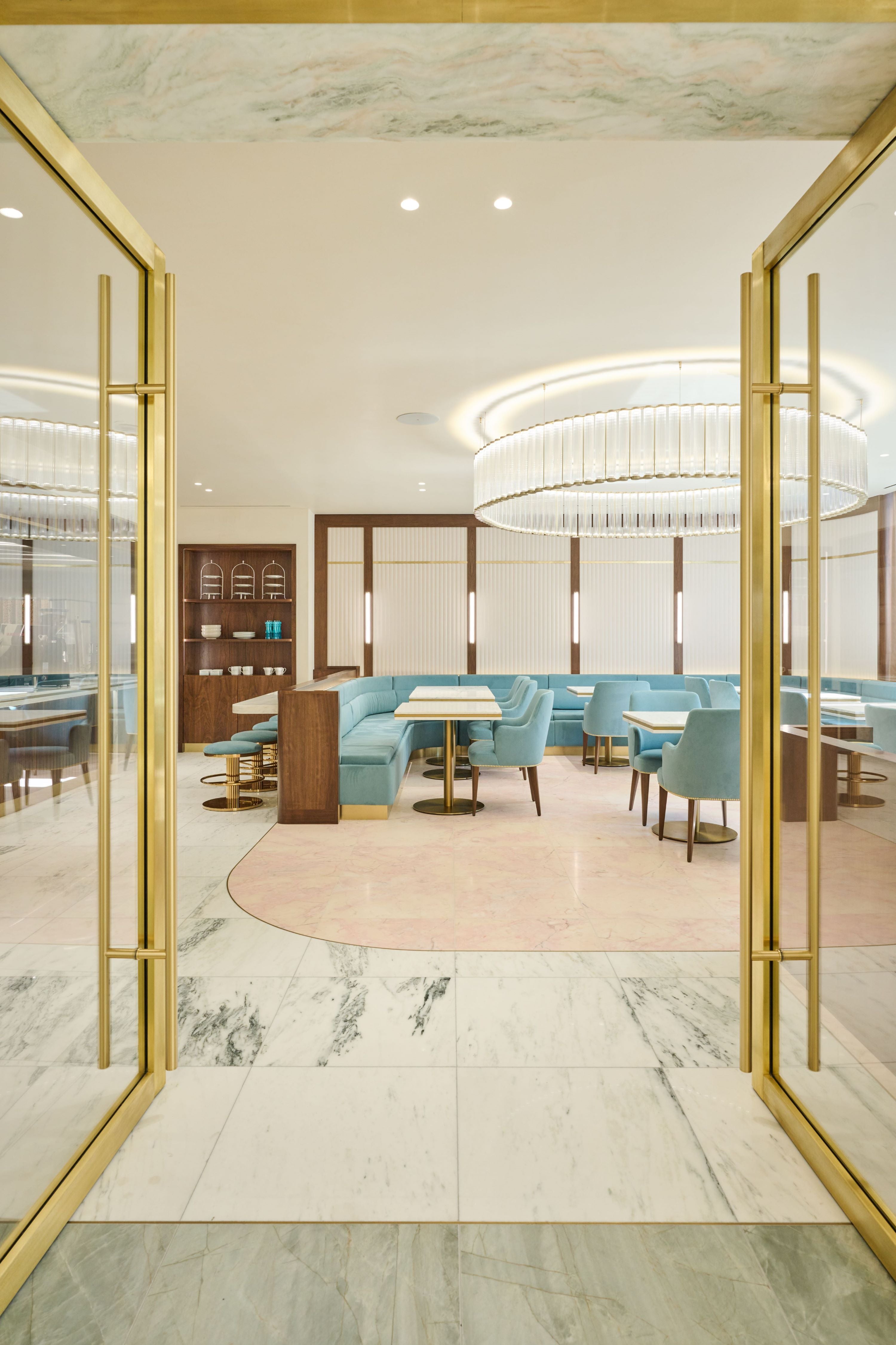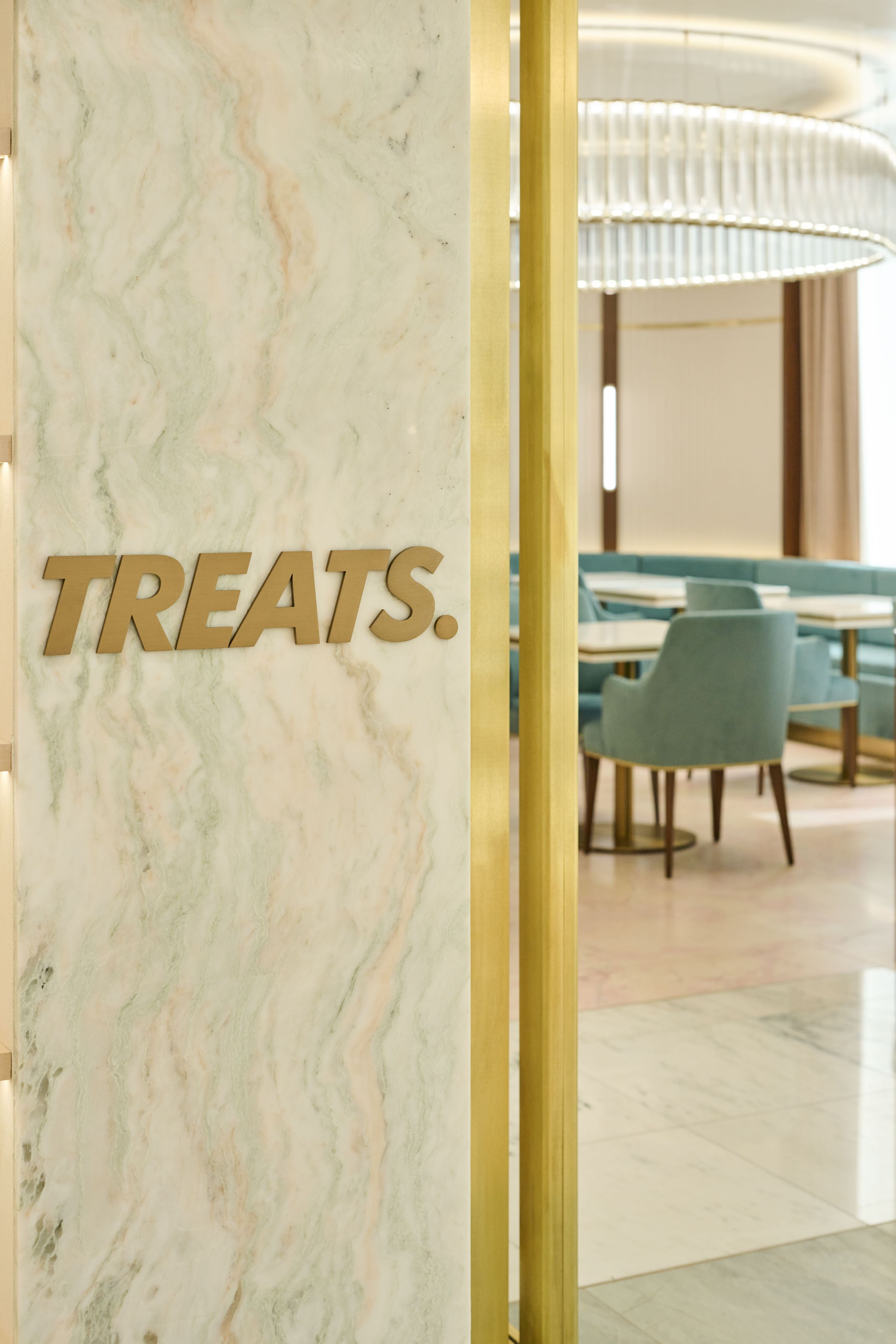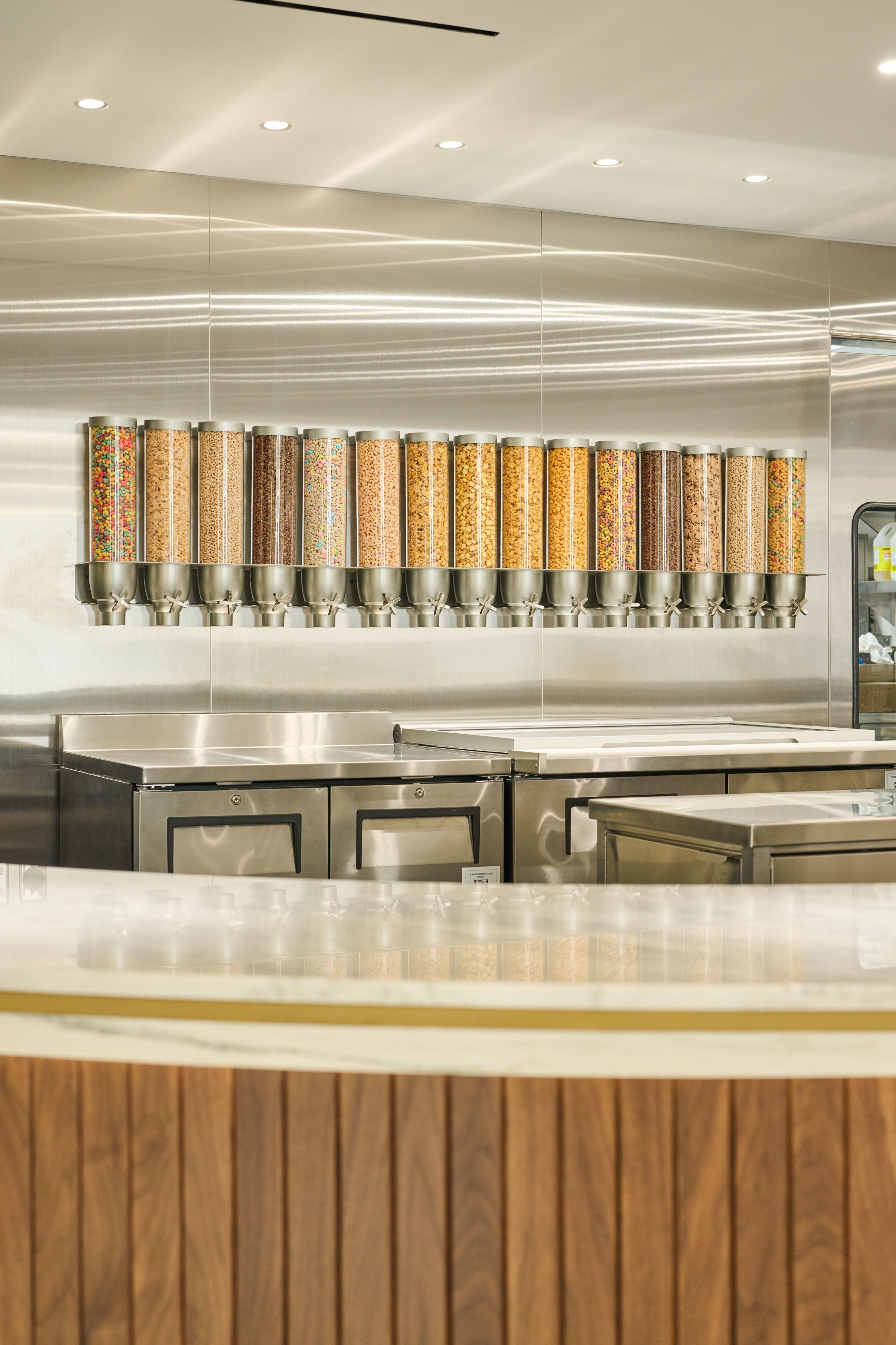 The shared dining room features an elevated blend of wood, stone and metal accents, highlighted by a Rosa Aurora marble countertop and Kith Treats’ signature parlor-style cereal dispensers. This new location will be home to Kith Treats’ full menu of ice cream specials as well as all of their global inline capsule collections.