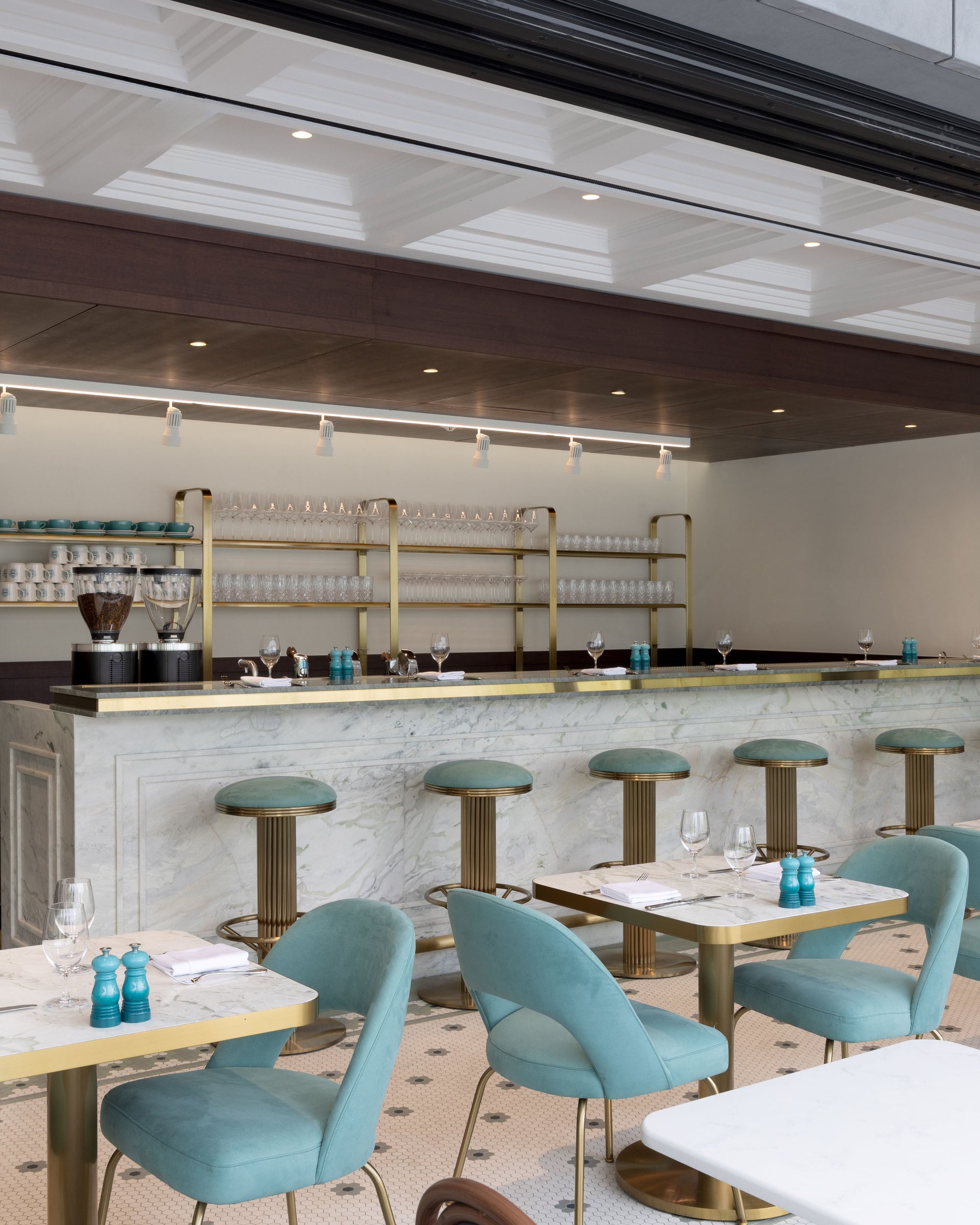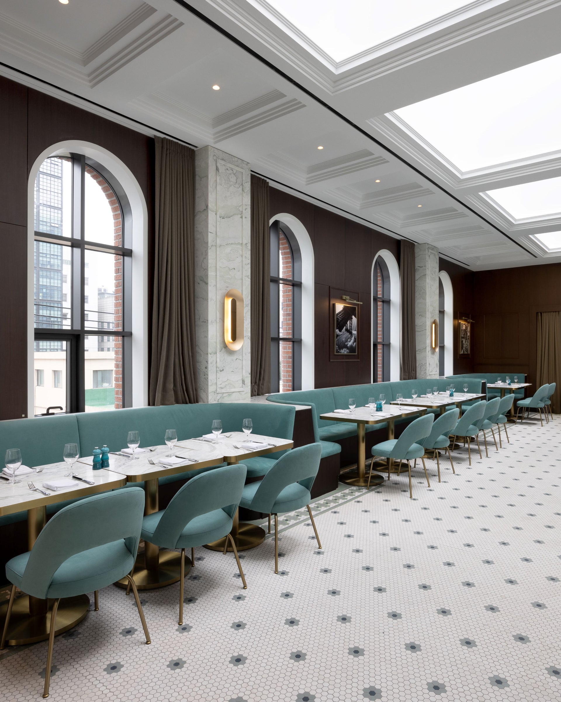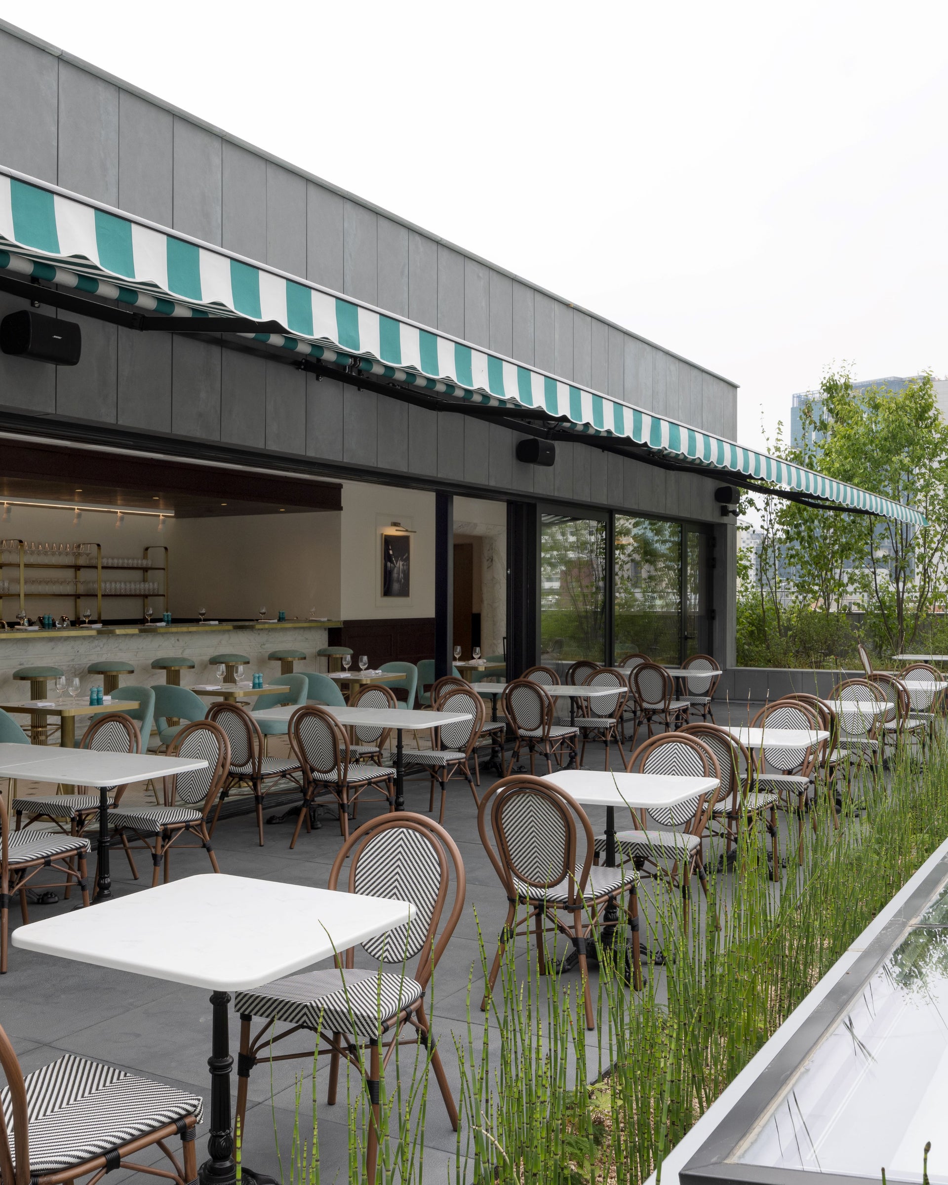 Open seven days a week, Sadelle’s at Kith Seoul features location-exclusive menu items as well as classic Sadelle’s fare, such as their beloved bagels, sliced-to-order salmon, chopped salads, and world-famous french toast. Diners of Sadelle’s Seoul are greeted by a marble header engraved with a custom Sadelle’s at Kith Seoul insignia, followed by an interior adorned with Kith Monogram suede wallpaper, Sadelle’s signature blue suede seating and dark walnut floors with brass accents. Sadelle’s at Kith Seoul takes over the entire third floor and extends into the fourth floor terrace—showcasing a beautiful view of Seoul filled with an array of lively greenery.