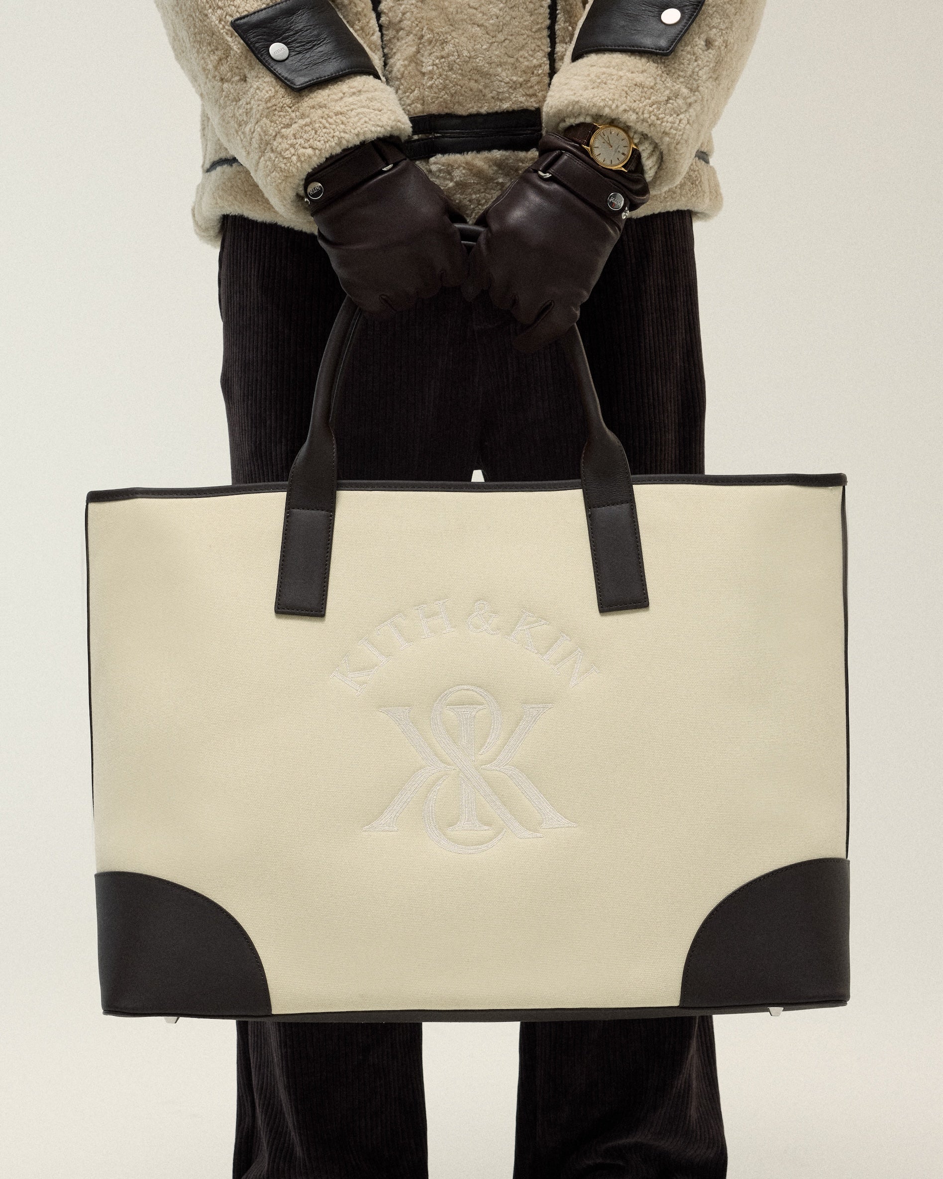 Accessories include a range of headwear, scarves, gloves, and more—with each piece designed in matching materials and hues to our main collection. The headwear offering of beanies and caps comprises Kith signatures alongside collaborative styles made in partnership with ‘47 and New Era. This season introduces leather-trimmed cotton canvas tote bags with the Kith & Kin logo as well as a new nylon camera bag.