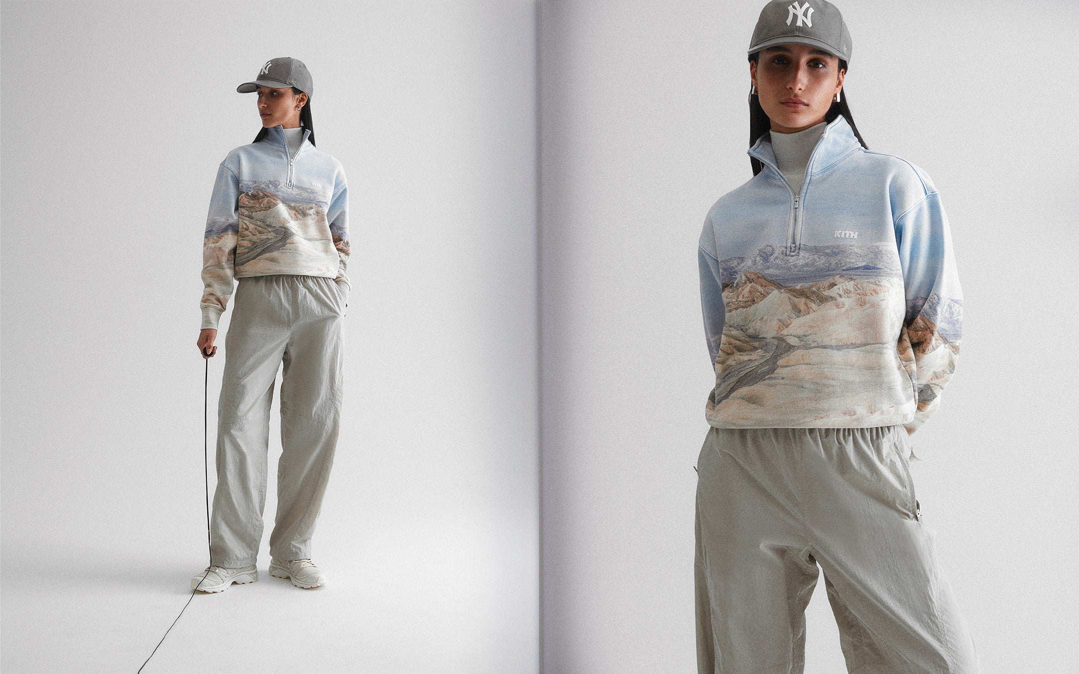 This collection spreads across outerwear, shirting & knitwear, activewear, and accessories—offering versatility for the season. Premium fabrics are seen throughout, including heavy melton wool, Nappa Leather, satin, cupro jersey, brushed fleece, and Italian slub bouclé. The season palette is grounded in muted and soft pastels in Kith-exclusive hues like Asteroid, Veil, Scone and Plaster.