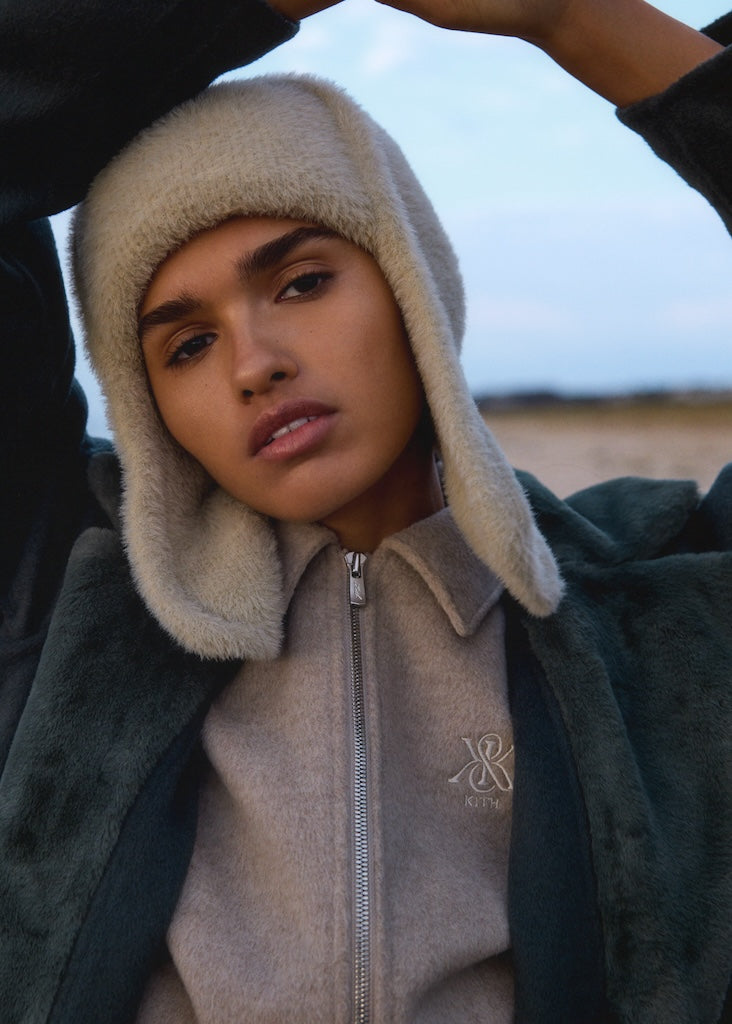 Accessories for the season include complementary headwear and bags. Winter 2024 headwear features the signature Mia Beanie with a removable Kith Crest brooch, the introduction of a Pom Pom Beanie and Mohair Earflap Beanie, and a variety of novelty bucket hats & ear muffs. Debuting this season is the Katie Bag and Mini Katie Bag. These elevated styles are crafted from 100% cow leather and feature subtle Kith Script branding and leather tassels. The offering is complete with the Shelby Baguette Bag, a small shoulder bag executed in premium cow leather and pony hair iterations.