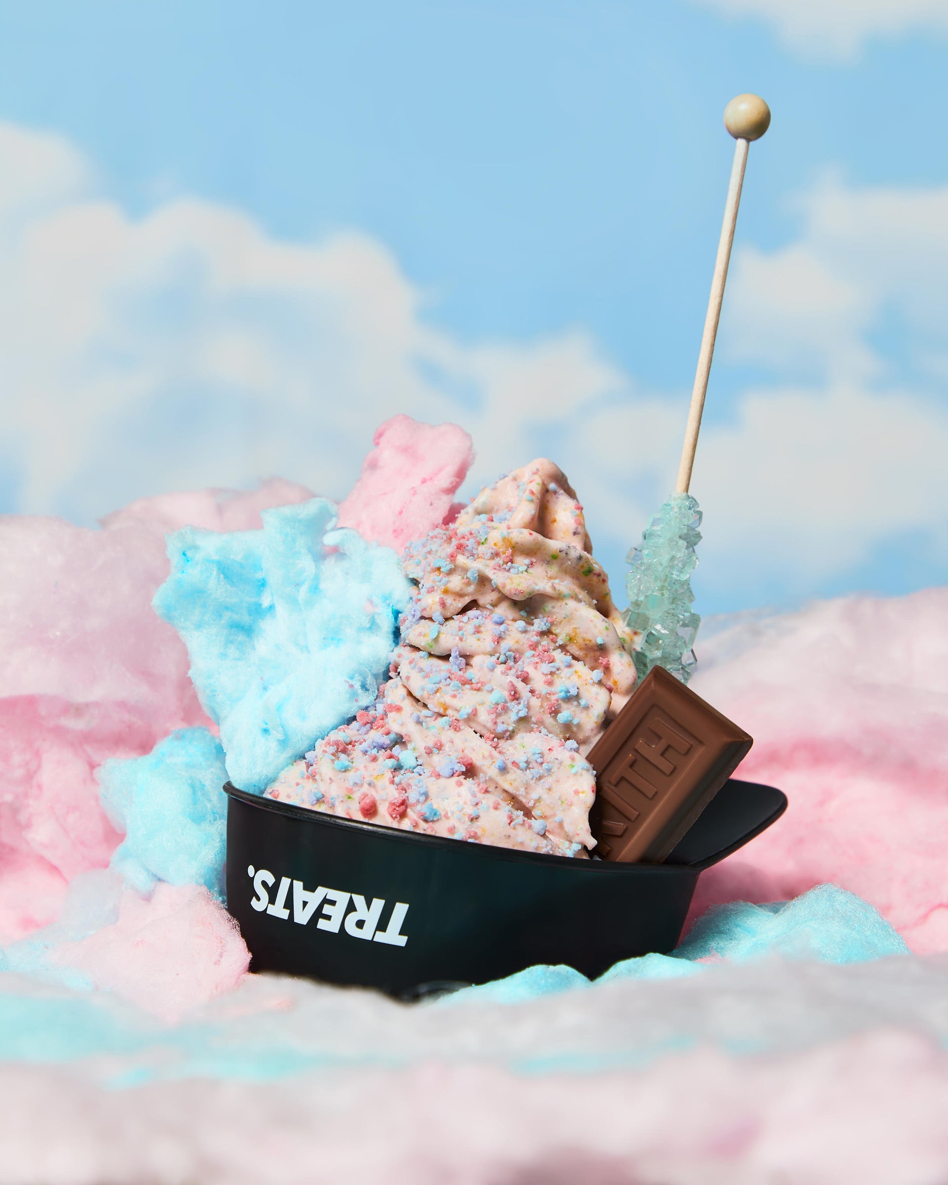 A vanilla ice cream swirl infused with cotton candy sugar & Cap’n Crunch Berries cereal, topped with cotton candy clouds, sprinkled with cotton candy crunch and garnished with blue rock candy.