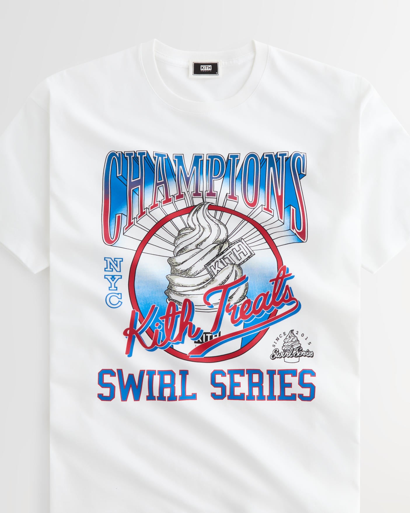 Each tee combines Kith Treats iconography with timeless retro sports graphics commemorating the Swirl Series Champions. The collection is packaged in a custom cereal-inspired box that includes three of five limited edition Cereal Crew trading cards. Select boxes will include a rare mystery card, which collectors can pair with future Kith Treats trading card releases.