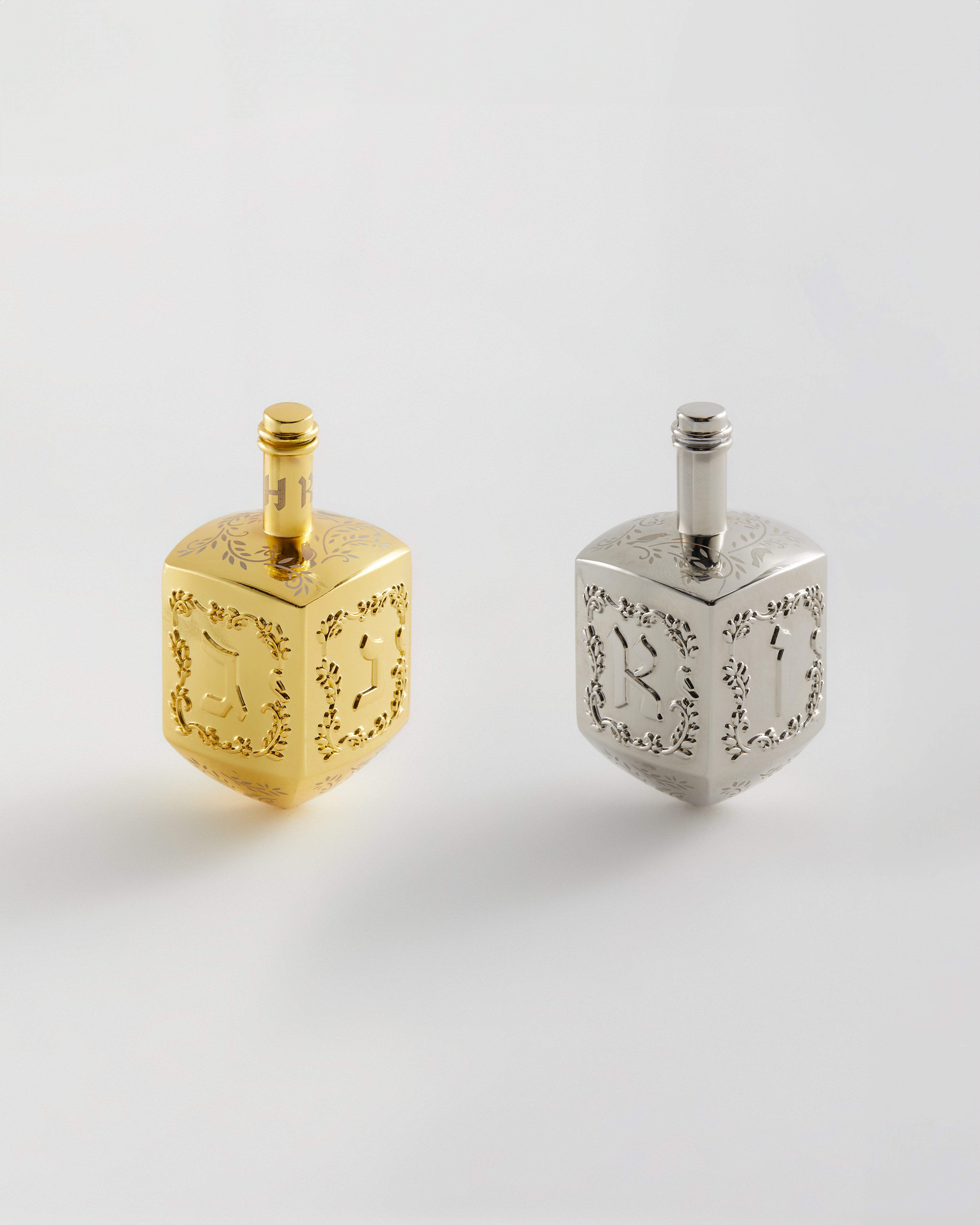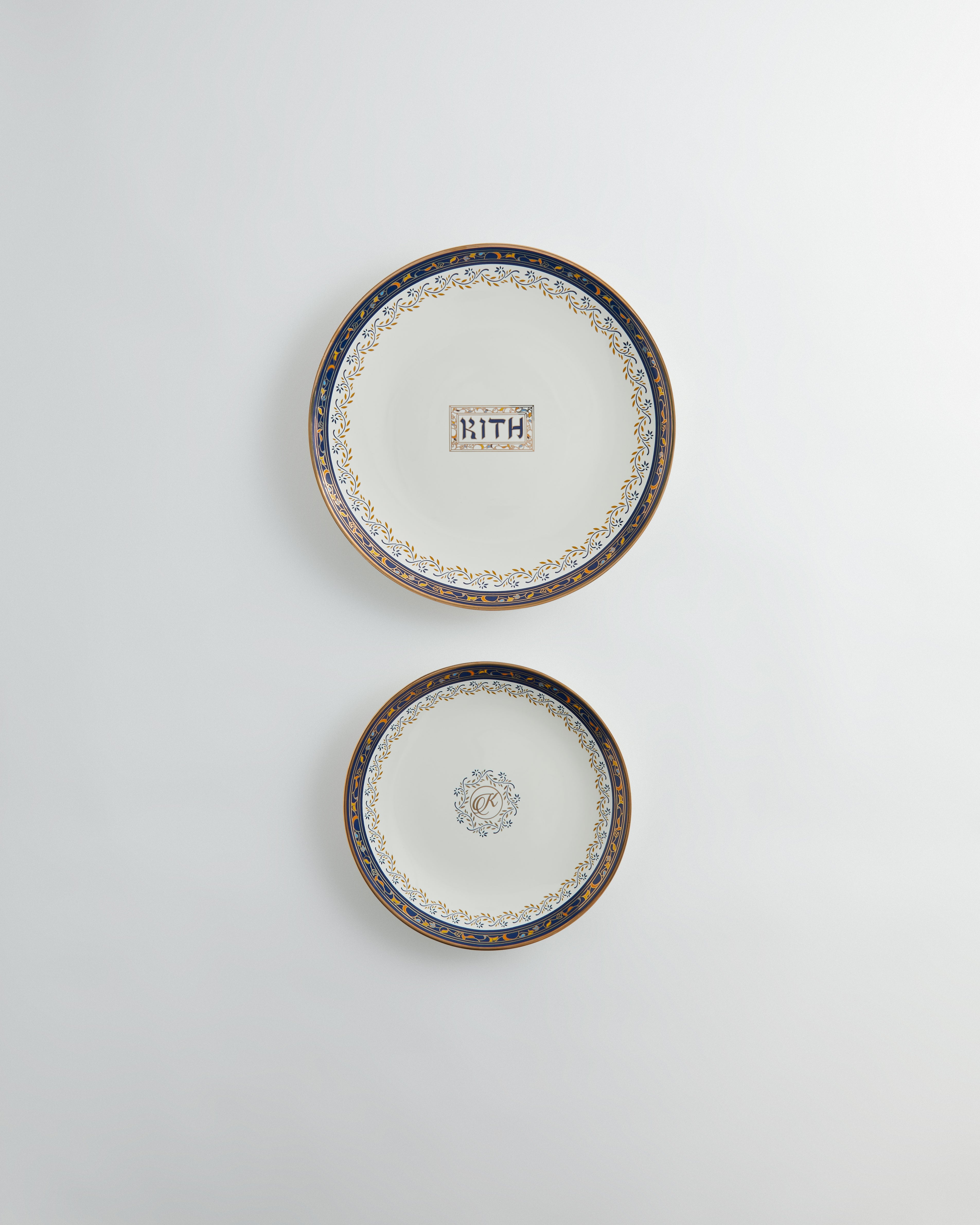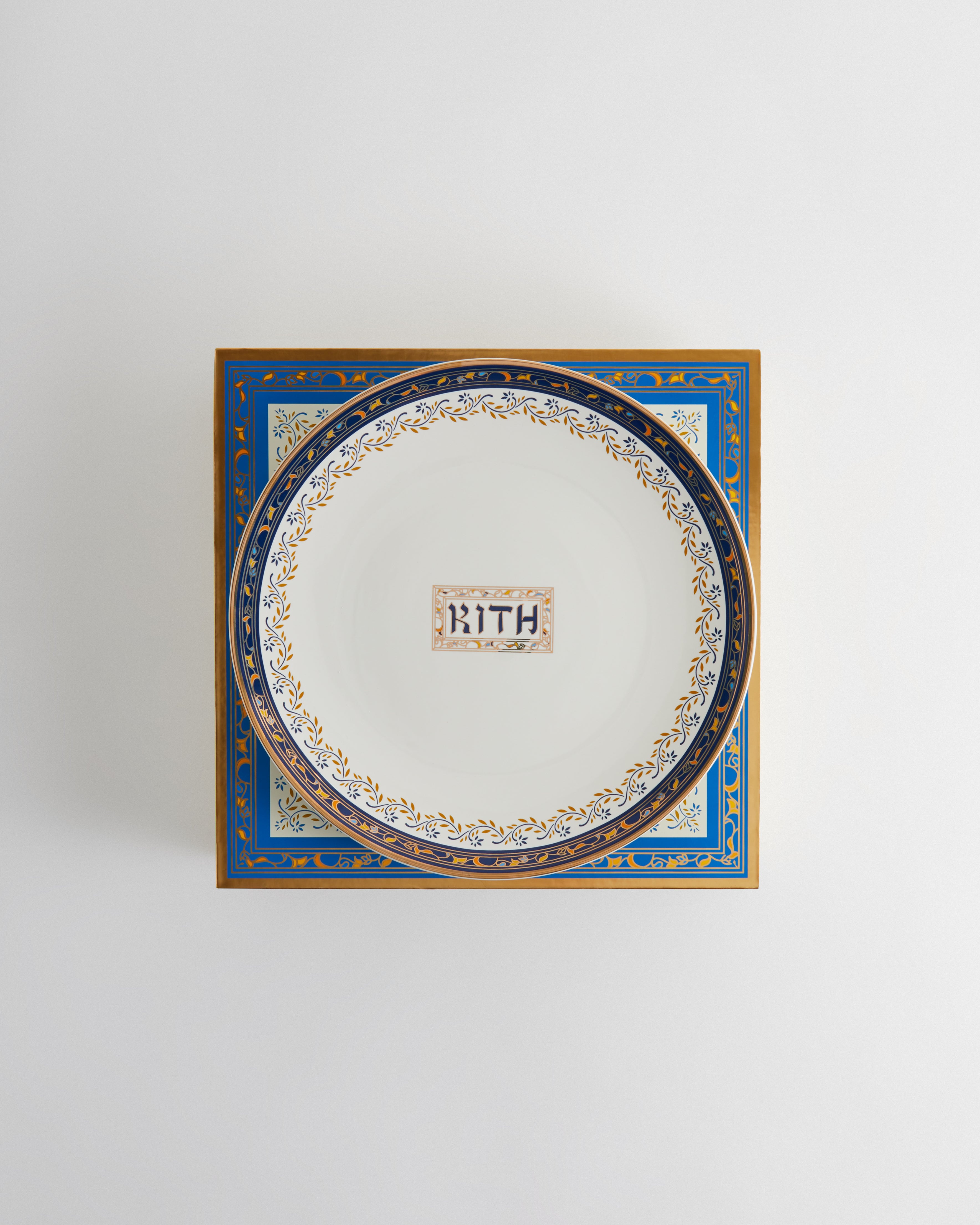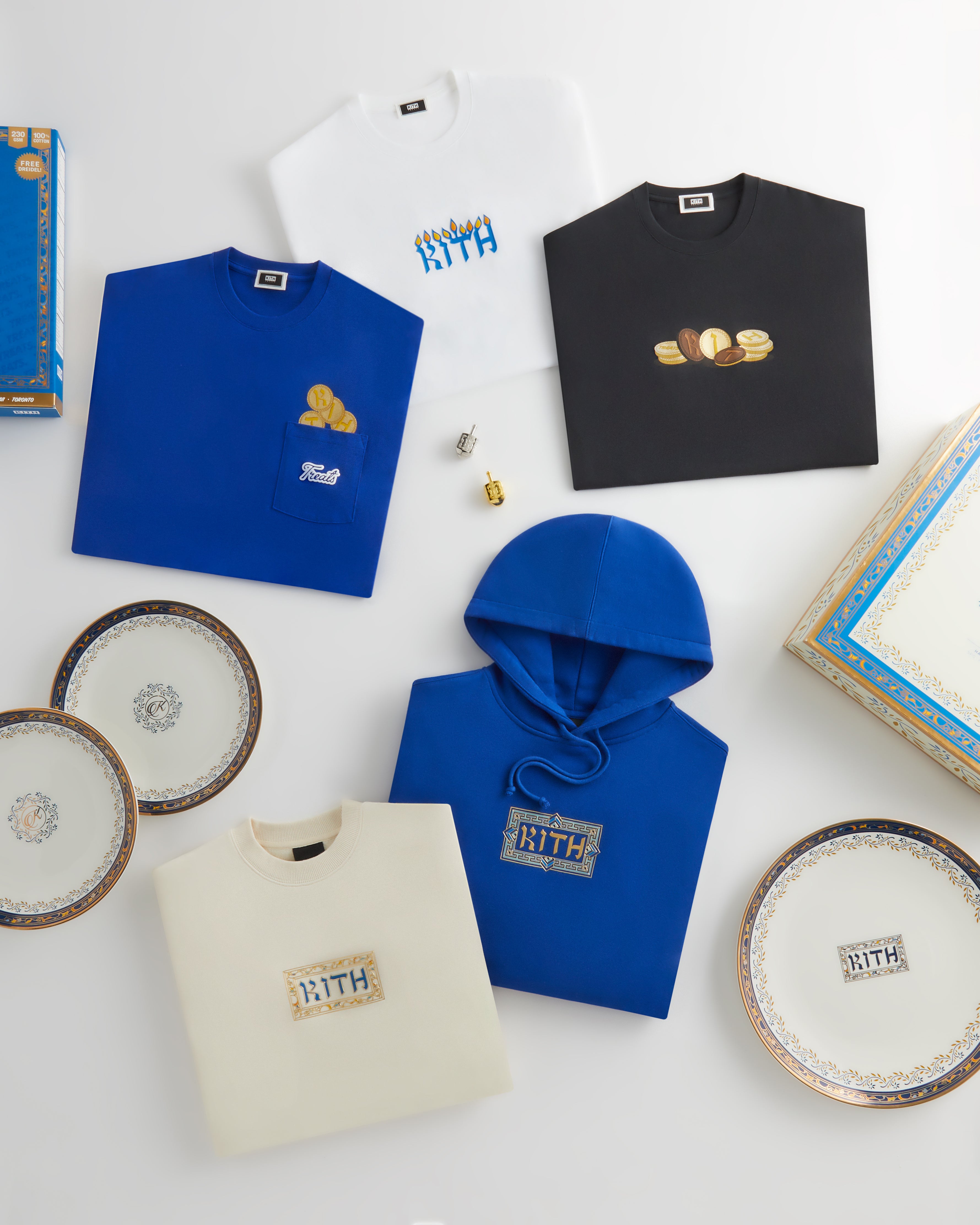 The apparel is accompanied by a festive, five-piece ceramic plate set housed in custom packaging, as well as a two-pack of gold and silver metal dreidels; the gold features traditional dreidel lettering, while the silver showcases Kith lettering on each side.