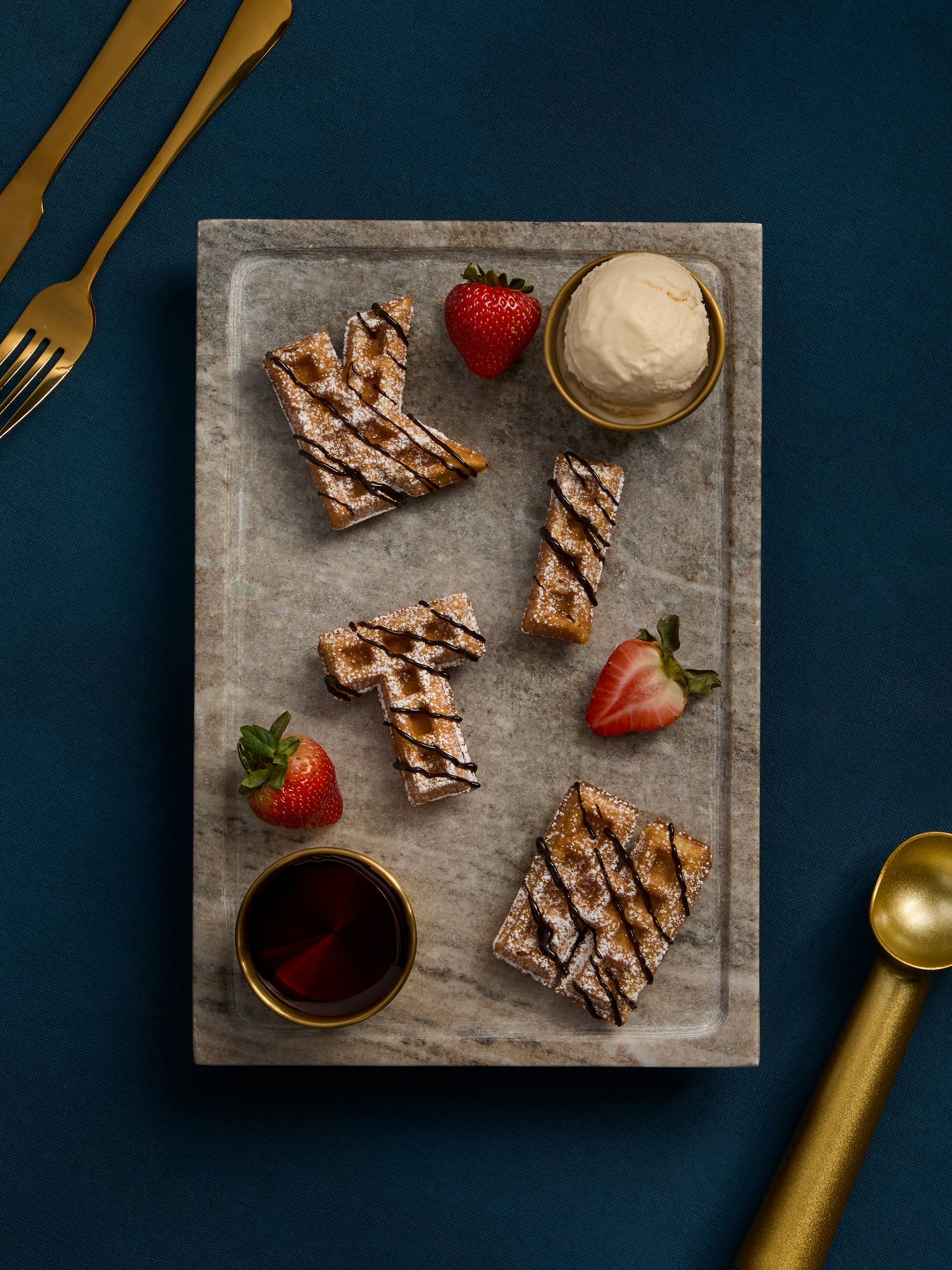 Homemade K-I-T-H Mini Waffles topped with Powdered Sugar and Nutella drizzle, served with a side of Maple Syrup, Whipped Cream & Strawberries